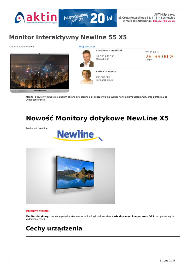 Monitor Interaktywny Newline 55 X5 Numer katalogowy:X5 Twój konsultant Arkadiusz Trzebiński tel. 503 030 555 [email protected] NOWOŚĆ W OFERCIE 26199.00 zł 26199.00 zł z VAT Karina Gładecka 796 603 606 [email protected] Monitor dotykowy z zupełnie płaskim ekranem w technologii podczerwieni z wbudowanym komputerem OPS oraz platformą do wideokonferencji. Nowość Monitory dotykowe NewLine X5 Producent: Newline Dostępny wkrótce. Monitor dotykowy z zupełnie płaskim ekranem w technologii podczerwieni z wbudowanym komputerem OPS oraz platformą do wideokonferencji. Cechy urządzenia Strona 1 / 5 55 cali przekątna obszaru aktywnego Żywotność panelu monitora 30 000 godzin Zupełnie płaski ekran - technologia TRUFLAT – jedyny taki monitor na rynku Dwie wbudowane szerokokątne kamery 1080p – możliwość przełączania się pomiędzy kamerami żeby móc uchwycić zarówno osoby stojące jak i siedzące przy stole konferencyjnym. Cztery zaawansowane mikrofony – redukujące szumy, zbierające głos w zasięgu 8 metrów Wysokiej jakości głośniki – zapewniają wrażenie ludzkiego głosu, tak jakby osoba po drugiej stronie kamery znajdowała się w tym samym pomieszczeniu co my Komputer OPS w standardzie – procesor i5-4210M 2.6 GHz, 8 GB pamięci RAM oraz dysk SSD 128 GB Przedni panel komunikacyjny – dzięki niemu szybko można podłączyć pamięci typu flash lub zewnętrzny komputer za pomocą gniazda HDMI Cechy systemu Strona 2 / 5 Czy wiesz, że: X5 to nie tylko monitor to centrum konferencyjne. Dzięki jego wbudowanym funkcjonalnością możesz w każdej chwili zrobić video konferencję bez specjalnych przygotowań. Zainstalowany Android – procesor ARM Cortex A9, Quad Core 1.5 GHZ, 2GB pamięci RAM oraz 8GB pamięci ROM, wsparcie dla różnego typu plików multimedialnych takich jak zdjęcie czy filmy Platforma do wideokonferencji – stworzona do szybkiego uruchamiania połączeń wideo z wykorzystaniem dowolnych programów m.in. takich jak SKYPE Tryb tablicy interaktywnej w ramach Androida – umożliwiający dzielnie się własnymi pomysłami z uczestnikami konferencji, wszystkie notatki stworzone za pomocą tego trybu mogą zostać zapisane na zewnętrznej pamięci lub karcie SD Strona domowa – usprawniająca pracę – szybki dostęp do narzędzi adnotacji (tryb tablicy interaktywnej), pamięci zewnętrznych oraz źródeł obrazu Wyświetlacz Podświetlenie Obszar wyświetlania Przekątna obszaru aktywnego Format Rozdzielczość Kolory wyświetlacza Jasność Kontrast Czas reakcji Żywotność matrycy LED 1,209 x 680,4 mm 55" 16:9 1,920 x 1,080 pikseli 8 bit 370 cd/m2 4000:1 8 ms 30 000 godzin Głośniki Pozycja Impendancja Częstotliwość Output S.P.L Maksymalna moc wyjściowa Przód 8Ω 80 Hz (±20%)-18kHz 82±3dB 2 x 15 W Strona 3 / 5 Mikrofon Czułość Częstotliwość Polar patterns Współczynnik zawartości harmonicznych Zasięg Ilość Kamera Pozycja Czujnik Kąt widzenia Rozdzielczość wideo Częstotliwość wyświetlania klatek Zasilanie Pobór Napięcie Dotyk Powierzchnia Przezroczystość Twardość powierzchni Czujnik dotyku Wsparcie HID Punkty dotyku Narzędzie pisania Prędkość skanowania Dokładność Rozdzielczość dotyku Transport/Przechowywanie Temp. przechowywania/wilgotność Temperatura pracy/Wilgotność Montaż Wymiary zewnętrzne Wymiary opakowania Waga monitora Waga z opakowaniem -28dB±3dB 100 Hz - 7.75 KHz Wielokierunkowy <1% at 6dB SPL 8 metrów 4 góra x 1, dół x 1 (jedna w jednym czasie) 2 mega 86° 1,920 x 1,080@30fps (maks) 30 fps/60 fps Max<160W, Tryb czuwania ≤0.5W AC 100-240V, 50/60Hz Szkło hartowane >89% H8 Podczerwień TAK 10 windows/5 Android Piórko lub rysik 100 Hz 1 mm 19,354 x 10,866 -10°C do 50°C/10%-90% 0°C-40°C/10%90% Uchwyt ścienny(opcja)/Podstawa mobilna (opcja) 1,320 x 886 x 87 mm 1,470 x 995 x 265 mm 36 kg 45 kg Porty - wejścia/wyjścia Przedni panel Wejścia AV Wyjścia AV Pozostałe Inne funkcje Inteligentny czujnik światła Inteligetny czujnik ciepła Czujnik temperatury u wilgotności Wbudowane Wi-Fi System Procesor RAM ROM Wspierane formaty multimedialne OPS CPU Grafika RAM Dysk twardy USB 2.0/3.0 LAN Wyjście HDMI Wyjście mikrofon Wyjście liniowe SPDIF wyjście Wbudowane Wi-Fi system operacyjny Mikrofon (3.5mm) x 1, HDMI x 1, USB (Touch) x1, USB (PC) x 1, USB (Android) x 1 HDMI x 1, VGA x 1, USB (Touch) x 2, Audio(3.5 mm) x 1 3.5 mm line out x 1, HDMI (tylko wideo) x 1 USB 2.0 x 2, RS232 x 1, RJ45 x 1, USB 3.0 x 1, czytnik kart SD, slot OPS TAK TAK TAK TAK ARM Corex A9 Quad Core 1.5 GHZ 2GB 8 GB Wszystkie typy plików multimedialnych i5-421M 2.6 Ghz Intel HD 4600 8 GB DDR3 1600 MHz 128 GB SATA3 SSD 4/2 1 x 10/100/1000 M 1 1 1 1 802.11b/g/n Windows 8.1 64 bit (brak licencji) Monitory interaktywne ze stawką 0% VAT dla edukacji Monitor można kupić do dowolnej placówki oświatowej ze stawką 0% VAT. Podana cena jest ceną netto i obowiązuję przy zakupie dla edukacji. Strona 4 / 5 Strona 5 / 5 Powered by TCPDF (www.tcpdf.org)