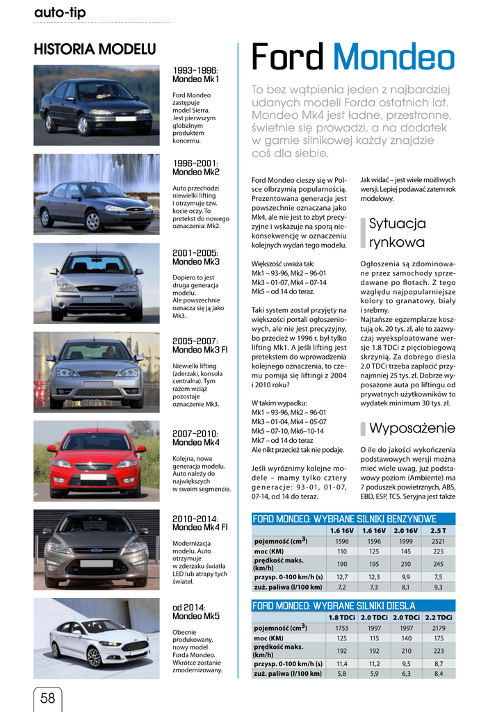 auto-tip Historia modelu 1993-1996: Mondeo Mk1 Ford Mondeo zastępuje model Sierra. Jest pierwszym globalnym produktem koncernu. 1996-2001: Mondeo Mk2 Auto przechodzi niewielki lifting i otrzymuje tzw. kocie oczy. To pretekst do nowego oznaczenia: Mk2. 2001-2005: Mondeo Mk3 Dopiero to jest druga generacja modelu. Ale powszechnie oznacza się ją jako Mk3. 2005-2007: Mondeo Mk3 Fl Niewielki lifting (zderzaki, konsola centralna). Tym razem wciąż pozostaje oznaczenie Mk3. 2007-2010: Mondeo Mk4 Kolejna, nowa generacja modelu. Auto należy do największych w swoim segmencie. 2010-2014: Mondeo Mk4 Fl Modernizacja modelu. Auto otrzymuje w zderzaku światła LED lub atrapy tych świateł. od 2014: Mondeo Mk5 Obecnie produkowany, nowy model Forda Mondeo. Wkrótce zostanie zmodernizowany. 58 Ford Mondeo To bez wątpienia jeden z najbardziej udanych modeli Forda ostatnich lat. Mondeo Mk4 jest ładne, przestronne, świetnie się prowadzi, a na dodatek w gamie silnikowej każdy znajdzie coś dla siebie. Ford Mondeo cieszy się w Polsce olbrzymią popularnością. Prezentowana generacja jest powszechnie oznaczana jako Mk4, ale nie jest to zbyt precyzyjne i wskazuje na sporą niekonsekwencję w oznaczeniu kolejnych wydań tego modelu. Jak widać – jest wiele możliwych wersji. Lepiej podawać zatem rok modelowy. Większość uważa tak: Mk1 – 93-96, Mk2 – 96-01 Mk3 – 01-07, Mk4 – 07-14 Mk5 – od 14 do teraz. Ogłoszenia są zdominowane przez samochody sprzedawane po flotach. Z tego względu najpopularniejsze kolory to granatowy, biały i srebrny. Najtańsze egzemplarze kosztują ok. 20 tys. zł, ale to zazwyczaj wyeksploatowane wersje 1.8 TDCi z pięciobiegową skrzynią. Za dobrego diesla 2.0 TDCi trzeba zapłacić przynajmniej 25 tys. zł. Dobrze wyposażone auta po liftingu od prywatnych użytkowników to wydatek minimum 30 tys. zł. Taki system został przyjęty na większości portali ogłoszeniowych, ale nie jest precyzyjny, bo przecież w 1996 r. był tylko lifting Mk1. A jeśli lifting jest pretekstem do wprowadzenia kolejnego oznaczenia, to czemu pomija się liftingi z 2004 i 2010 roku? W takim wypadku: Mk1 – 93-96, Mk2 – 96-01 Mk3 – 01-04, Mk4 – 05-07 Mk5 – 07-10, Mk6–10-14 Mk7 – od 14 do teraz Ale nikt przecież tak nie podaje. Jeśli wyróżnimy kolejne modele – mamy t ylko cz ter y g e n e r a c j e : 93 - 01, 01- 07, 07-14, od 14 do teraz. Sytuacja rynkowa Wyposażenie O ile do jakości wykończenia podstawowych wersji można mieć wiele uwag, już podstawowy poziom (Ambiente) ma 7 poduszek powietrznych, ABS, EBD, ESP, TCS. Seryjna jest także Ford Mondeo: WYBRANE SILNIKI BENZYNOWE pojemność (cm3) moc (KM) prędkość maks. (km/h) przysp. 0-100 km/h (s) zuż. paliwa (l/100 km) 1.6 16V 1.6 16V 2.0 16V 2.5 T 1596 110 1596 125 1999 145 2521 225 190 195 210 245 12,7 7,2 12,3 7,3 9,9 8,1 7,5 9,3 Ford Mondeo: WYBRANE SILNIKI DIESLA pojemność (cm3) moc (KM) prędkość maks. (km/h) przysp. 0-100 km/h (s) zuż. paliwa (l/100 km) 1.8 TDCi 2.0 TDCi 2.0 TDCi 2.2 TDCi 1753 125 1997 115 1997 140 2179 175 192 192 210 223 11,4 5,8 11,2 5,9 9,5 6,3 8,7 8,4 auto-tip Ford Mondeo Mk4 (2002-2014) Zdecydowanym liderem na rynku wtórnym jest wersja 2.0 TDCi z silnikiem wysokoprężnym opracowanym wspólnie z francuską grupą PSA. klimatyzacja (manualna, jednostrefowa) i elektryczne sterowanie szyb w drzwiach przednich. Kolejne poziomy to Trend, (skórzana kierownica, klimatyzacja automatyczna), Ghia oraz Ghia X. Na rynku można także spotkać odmiany Titanium, Titanium X oraz pakiety dealerskie – SilverX, GoldX. T rzy wersje, dwie deski Najpopular niejsze w Polsce wersje to liftback i kombi. Gamę uzupełnia sedan, ale w ogłoszeniach pojawia się bardzo rzadko i z racji ograniczonej funkcjonalności nie jest specjalnie poszukiwany. Mondeo było produkowane w dwóch odmianach, różniących się zestawem wskaźników. W pierwszym przypadku były to klasyczne zegary. W drugim – połączenie zegarów i wyświetlacza LCD (Convers+). Niestety, był to bardziej gadżet niż funkcjonalny element. Liczba podawanych przez niego informacji jest stosunkowo ograniczona. Pierwszy lifting miał miejsce w 2010 roku. Auto otrzymało nową atrapę chłodnicy, paski LED do jazdy dziennej (lub czarne miejsca na te światła), nowe zderzaki oraz nowe wykończenie konsoli centralnej. Tuż przed końcem produkcji ponownie zmodernizowano zderzaki i światła. ełna gama P silników W ogłoszeniach dominują wersje wysokoprężne. Najtańszą z nich jest odmiana 1.8 TDCi, najbardziej polecaną –model 2.0 TDCi. Uzupełnieniem gamy był wprowadzony po liftingu silnik 1.6 TDCi. Rolę flagowego diesla pełni silnik 2.2 TDCi. W gamie benzynowej najpopularniejsze silniki to wolnossąca dwulitrówka oraz wolnossący 1.6. O ile w poprzedniej generacji znalazło się miejsce dla sportowego modelu ST 220, o tyle w przypadku MK4 producent nie stworzył już takiej odmiany. Osoby, które oczekują dobrych osiągów, mogą sięgnąć po wersję z silnikiem turbodoładowanym 2.5, zaprojektowanym przez Volvo. Dobre osiągi ma także wprowadzony po liftingu silnik 2.0 Ecoboost, który jest już konstrukcją Forda. Równolegle z nim w ofercie debiutował silnik 1.6 Ecoboost. To z kolei ukłon w stronę mody na downsizing. Przed liftingiem 2007-2010 Przed liftingiem: gęsta siatka na atrapie chłodnicy, brak świateł LED do jazdy dziennej, niezbyt duży wlot powietrza w zderzaku. Srebrne wykończenie konsoli środkowej. po liftingu 2007-2010 Po liftingu: atrapa chłodnicy z jednym poziomym paskiem, duży wlot powietrza w zderzaku, światła LED do jazdy dziennej. Ciemne wykończenie konsoli środkowej. 59 auto-tip WERSJE FORDA MONDEO FORD MONDEO: układ hamulcowy Liftback 5d Dł./szer./wys.: 483/188/150 cm, rozstaw osi: 285 cm. Pojemność bagażnika: 540-1460 l. Z przodu wszystkie wersje Forda Mondeo MK4 mają wentylowane tarcze hamulcowe. Z tyłu są to niewentylowane tarcze. Co ciekawe, wszystkie wersje te