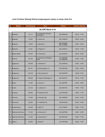 Lista Punktów Obsługi Klienta przyjmujących zapisy na akcje Libet S.A. Lp. Miasto Kod pocztowy Ulica Telefon Godziny otwarcia ALIOR Bank S.A. 1 Białystok 15-111 Al. Tysiąclecia Państwa Polskiego 8 (85) 6652836 09:30 - 17:30 2 Białystok 15-427 ul. Lipowa 34 (85) 7456516 08:00 - 18:00 3 Białystok 15-440 ul. Malmeda 1 (85) 8749983 (85) 8749986 09:00 - 16:00 4 Białystok 15-351 ul. Wiejska 47 (85) 7456121 09:30 - 17:30 5 Bielsko-Biała 43-300 Pl. Wolności 9 (33) 8278343 08:30 - 18:00 6 Bochnia 32-700 ul. Kazimierza Wielkiego 16/22 (12) 2984280, (12) 2984283 09:00 - 17:00 7 Bydgoszcz 85-005 ul. Gdańska 47 (52) 3394819 09:00 - 18:00 8 Bydgoszcz 85-791 ul. Skarżyńskiego 7a (52) 5673092 09:00 - 18:00 9 Bydgoszcz 85-105 ul. Stary Rynek 20 (52) 3045578 09:00 -17:00 10 Bydgoszcz 85-825 ul. Wojska Polaskiego 23 (52) 5673077 09:00 - 17:00 11 Bytom 41-902 ul. Jainty 22 (32) 3887981 09:00 - 18:00 12 Chełm 22-100 ul. Lubelska 70 (82) 5647424 08:30 - 17:00 13 Chojnice 89-600 Pl. Piastowski 30/3 (52) 5673200 09:00 - 17:00 14 Chorzów 41-500 ul. Wolności 29a (32) 3462823 09:00 - 17:00 15 Chrzanów 32-500 ul. Trzebińska 40 (32) 6610253 09:00 - 18:00 16 Częstochowa 42-200 Al. NMP 10 (34) 3726047 09:00 - 17:00 17 Dąbrowa Górnicza 41-300 ul. Graniczna 21 (32) 2647950 09:00 - 16:00 18 Dąbrowa Górnicza 41-300 ul. Kościuszki 21 (32) 6610162 09:00 - 17:30 19 Dębica 39-200 ul. Rynek 4 (14) 6707559 09:00 - 17:30 20 Elbląg 82-300 ul. 1 Maja 43/1 (55) 2305865 09:00 - 17:00 21 Gdańsk 80-244 ul. Grunwaldzka 72 (58) 7853654 10:00 - 18:00 22 Gdańsk 81-371 ul. Jagiellońska 2a (58) 5112885 09:00 - 17:00 23 Gdańsk 80-886 ul. Targ Drzewny 12/14 (58) 7853490, (58) 7853467 09:00 - 17:00 24 Gdańsk 80-836 ul. Tkacka 9/10 (58)3237621 10:00 - 18:00 25 Gdynia 81-395 ul. Abrahama 46 a (58) 6605661 10:00 - 18:00 26 Gdynia 81-002 ul. Kartuska 20 (58) 6693001 09:00 - 18:00 27 Gdynia 81-356 ul. Starowiejska 17 (58) 6273349 09:00 - 18:00 28 Gdynia 81-349 ul. Żeromskiego 45/47 (58) 6608766 09:00 - 17:00 29 Gliwice 44-100 ul. Jagiellońska 4 (32) 3387326 09:00 - 17:00 30 Gliwice 44-100 ul. Nowy Świat 3B 782893378 09:30 - 17:00 31 Gliwice 44-100 ul. Zwycięstwa 24 (32) 3386724 09:00 - 17:30 32 Głogów 67-210 ul. Grodzka 2 (76) 8336508 09:00 - 18:00 33 Gniezno 62-200 ul. Chrobrego 14 (61) 4244786 09:00 - 17:00 66-400 ul. Hawelańska 3 (95) 7255135 09:00 - 18:00 35 Grudziądz 86-300 ul. Sienkiewicza 17 (56) 4504260 09:00 - 17:00 36 Inowrocław 88-100 ul. Szeroka 1 (52) 3565710 08:00 - 18:00 37 Jastrzębie Zdrój 44-335 Al. Piłsudskiego 25 38 Jaworzno 43-600 ul. Olszewskiego 2a (32) 6610922 09:00 - 17:00 39 Jelenia Góra 58-500 ul. Krótka 1A (76) 7123943 09:00 - 17:00 40 Kalisz 62-800 ul. Polna 14 (62) 7538997 09:00 - 17:00 41 Katowice 40-098 pl. Wilhelma Szewczyka 7 (32) 6041820 09:00 - 18:30 42 Katowice 40-750 ul. Hierowskiego 70 (32) 3567470 10:00 - 17:00 43 Katowice 40-065 ul. Mikołowska 50 (32) 6093872 09:00 - 18:00 34 Gorzów Wielkopolski 10:00 - 17:00 44 Katowice 40-709 ul. Panewnicka 5 (32) 6093989 09:30 - 18:00 45 Katowice 40-954 ul. Rynek 12 (32) 6043881 (32) 6043807 (32) 6043883 09:00 - 17:00 46 Katowice 40-009 ul. Warszawska 3 (32) 6041820 09:00 - 17:00 47 Kędzerzyn-Koźle 47-220 ul. Damrota 14 (77) 4802505 09:00 - 18:00 48 Kielce 25-002 ul. Sienkiewicza 63 (41) 3433408 09:00 - 17:00 49 Kielce 25-414 ul. Warszawska 146 (41) 3355505 09:00 - 17:00 50 Konin 62-510 ul. Chopina 23 (63) 2466086 09:00 - 17:00 51 Koszalin 75-022 Zwycięstwa 37 (94) 3177376 09:00 - 18:00 52 Kraków 30-079 Al. Kijowska 22 (12) 6391870 09:00 - 19:00 53 Kraków 31-923 Os. Centrum A blok 1 (12) 2984396, (12) 2984395 09:00 - 17:00 54 Kraków 31-855 Osiedle Kazimierzowskie 35a (12) 6815581 08:00 - 18:00 55 Kraków 30-504 ul. Kalwaryjska 35a (12) 2654819 09:00 - 18:00 56 Kraków 30-831 ul. Obrońców Krzyża 8 (12) 2984270 09:30 - 17:00 57 Kraków 31-015 ul. Pijarska 9 (12) 3708461 10:00 - 18:00 (12) 2984100 (03-04); (12) 3401395; (12) 3401990; (12) 3401954; (12) 3401954; (12) 3401640; (12) 2984452 10:00 - 17:00 58 Kraków 31-462 ul. Pilotów 2 59 Kraków 31-032 ul. Starowiślna 8 (12) 6258903 09:00 - 18:00 60 Kraków 30-552 ul. Wielicka 72 (12) 6227420 09:00 - 18:00 61 Kraków 30-350 ul. Zachodnia 27 (12) 2551941 10:00 - 18:00 62 Kraków 31-105 ul. Zwierzyniecka 24 (12) 3703952 09:00 - 19:00 63 Kraków 31-128 ul/ Karmelicka 28 (12) 6303685 09:00 - 17:00 64 Krosno 38-400 ul. Pawła z Krosna 2 (13) 4376076 09:00 - 17:00 65 Kutno 99-300 PL. Wolności 3 (24) 3616924 10:00 - 16:00 66 Legionowo 05-120 ul. Piłsudskiego 20 (22) 7675703 10:00 - 18:00 67 Legnica 59-220 ul. Biskupia 3 (76) 8505225 09:00 - 18:00 68 Leszno 64-100 ul. Królowej Jadwigi 4 (61) 6673833 09:00 - 17:00 69 Lubin 59-300 ul. Armii Krajowej 2 (76) 7439935 08:30 - 17:30 70 Lublin 20-121 Pl. Zamkowy 10 (81)5248489 09:00 - 17:00 71 Lublin 20-002 ul. Krakowskie Przedmieście 22 (81) 4605504 09:00 - 17:30 72 Lublin 20-002 ul. Krakowskie Przedmieście 60 (81) 5248447 09:00 - 17:30 73 Lublin 20-607 ul. Wallenroda 4c (81) 5364161 09:00 - 17:30 74 Łomianki 05-092 ul. Warszawska 98 (22) 4639125 10:00 - 19:00 75 Łomża 18-400 ul. Legionów 14 (86) 2154061, (86) 2154062, (86) 2154063 09:00 -17:00 76 Łódź 92-524 ul. Gorkiego 28 (42) 6721562 09:00 - 17:00 77 Łódź 91-855 ul. Łagiewnicka 99 (42) 26162181 09:30 - 17:30 78 Łódź 90-004 ul. Piotrkowska 108 (42) 6391602 08:00 - 19:00 79 Łódź 90-410 ul. Piotrkowska 43 (42) 2392784 09:00 - 18:00 80 Łódź 93-172 ul. Rzgowska 30 (42) 6896676 09:00 - 18:00 81 Łódź 90-318 ul. Sienkiewicza 82/84 (42) 2392081 09:00 - 17:00 82 Łódź 91-111 ul. Traktorowa 63 (42) 2392732 09:00 - 17:00 83 Łódź 94-048 ul. Wyszyńskiego 29 (42) 2392747 10:00 - 18:00 84 Mielec 39-300 Al. Niepodległości 12 (17) 7835981 09:00 - 17:00 85 Mińsk Mazowiecki 05-300 ul. Warszawska 99 (25) 7595561 10:00 - 18:00 86 Mysłowice 41-400 Pl. Wolności 6 (32) 6610184 09:00 - 17:00 87 Nowy Sącz 33-300 ul. Rynek 16 (18) 4485268 09:00 - 17:00 88 Olkusz 32-300