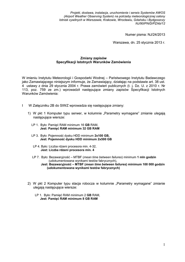 Projekt, dostawa, instalacja, uruchomienie i serwis Systemów AWOS (Airport Weather Observing System) na potrzeby meteorologicznej osłony lotnisk cywilnych w Warszawie, Krakowie, Wrocławiu, Gdańsku i Bydgoszczy NJ/90/PN/D/PZ/kb/12 Numer pisma: NJ/24/2013 Warszawa, dn. 25 stycznia 2013 r. Zmiany zapisów Specyfikacji Istotnych Warunków Zamówienia W imieniu Instytutu Meteorologii i Gospodarki Wodnej – Państwowego Instytutu Badawczego jako Zamawiającego niniejszym informuje, że Zamawiający, działając na podstawie art. 38 ust. 4 ustawy z dnia 29 stycznia 2004 r. Prawa zamówień publicznych (t. j. Dz. U. z 2010 r. Nr 113, poz. 759 ze zm.) wprowadził następujące zmiany zapisów Specyfikacji Istotnych Warunków Zamówienia: I W Załączniku 2B do SIWZ wprowadza się następujące zmiany: 1) W pkt 1 Komputer typu serwer, w kolumnie „Parametry wymagane” zmianie ulegają następujące wiersze: LP 1. Było: Pamięć RAM minimum 16 GB RAM, Jest: Pamięć RAM minimum 32 GB RAM LP 3. Było: Pojemność dysku HDD minimum 2x100 GB, Jest: Pojemność dysku HDD minimum 2x500 GB LP 4. Było: Liczba rdzeni procesora min. 4-32, Jest: Liczba rdzeni procesora min. 4 LP 7. Było: Bezawaryjność – MTBF (mean time between failures) minimum 1 mln godzin (udokumentowana wynikami testów fabrycznych), Jest: Bezawaryjność – MTBF (mean time between failures) minimum 100 000 godzin (udokumentowana wynikami testów fabrycznych) 2) W pkt 2 Komputer typu stacja robocza w kolumnie „Parametry wymagane” zmianie ulegają następujące wiersze: LP 1. Było: Pamięć RAM minimum 2 GB RAM, Jest: Pamięć RAM minimum 8 GB RAM 1 Projekt, dostawa, instalacja, uruchomienie i serwis Systemów AWOS (Airport Weather Observing System) na potrzeby meteorologicznej osłony lotnisk cywilnych w Warszawie, Krakowie, Wrocławiu, Gdańsku i Bydgoszczy NJ/90/PN/D/PZ/kb/12 LP 4. Było: Pojemność dysku HDD minimum 80 GB, Jest: Pojemność dysku HDD minimum 500 GB LP 7. Było: Bezawaryjność – MTBF (mean time between failures) minimum 1 mln godzin (udokumentowana wynikami testów fabrycznych), Jest: Bezawaryjność – MTBF (mean time between failures) minimum 100 000 godzin (udokumentowana wynikami testów fabrycznych) II W załączniku nr 8 do SIWZ (wzór umowy) Zamawiający wprowadza następujące zmiany: 1) § 3 pkt 10 lit e) otrzymuje brzmienie: „e) co najmniej na 5 dni przed planowanym terminem szkolenia Wykonawca dostarczy na swój koszt materiały szkoleniowe w języku polskim dla każdego uczestnika szkolenia oraz wręczy każdemu uczestnikowi szkolenia imienny certyfikat potwierdzający udział w szkoleniu,” 2) § 11 ust. 4 otrzymuje brzmienie: „4. Zamawiający zastrzega sobie prawo dochodzenia uprawnień z tytuły rękojmi, niezależnie od uprawnień wynikających z gwarancji, przez okres trwania gwarancji określony w ust. 2.” 3) W § 16 wzoru umowy dodaje się ust. 2 w brzmieniu: „2. Wykonawca bez pisemnej zgody Zamawiającego nie może przenieść na osobę trzecią praw lub obowiązków wynikających z Umowy zarówno w całości, jak i w części.” Powyższe zmiany stanowią integralną część SIWZ. Pozostałe zapisy pozostają bez zmian. Z poważaniem DYREKTOR dr hab. inż. Mieczysław S. Ostojski Załącznik: SIWZ z uwzględnionymi zmianami 2