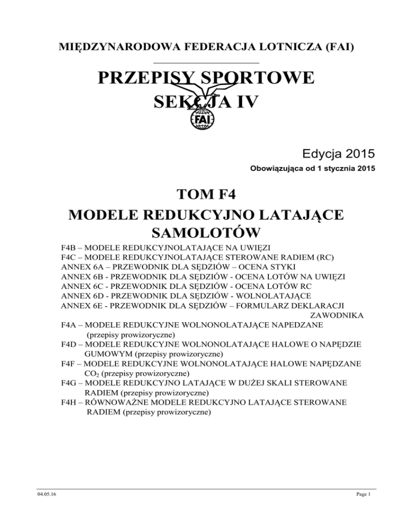 MIĘDZYNARODOWA FEDERACJA LOTNICZA (FAI) ________________________________ PRZEPISY SPORTOWE SEKCJA IV Edycja 2015 Obowiązująca od 1 stycznia 2015 TOM F4 MODELE REDUKCYJNO LATAJĄCE SAMOLOTÓW F4B – MODELE REDUKCYJNOLATAJĄCE NA UWIĘZI F4C – MODELE REDUKCYJNOLATAJĄCE STEROWANE RADIEM (RC) ANNEX 6A – PRZEWODNIK DLA SĘDZIÓW – OCENA STYKI ANNEX 6B - PRZEWODNIK DLA SĘDZIÓW - OCENA LOTÓW NA UWIĘZI ANNEX 6C - PRZEWODNIK DLA SĘDZIÓW - OCENA LOTÓW RC ANNEX 6D - PRZEWODNIK DLA SĘDZIÓW - WOLNOLATAJĄCE ANNEX 6E - PRZEWODNIK DLA SĘDZIÓW – FORMULARZ DEKLARACJI ZAWODNIKA F4A – MODELE REDUKCYJNE WOLNONOLATAJĄCE NAPEDZANE (przepisy prowizoryczne) F4D – MODELE REDUKCYJNE WOLNONOLATAJĄCE HALOWE O NAPĘDZIE GUMOWYM (przepisy prowizoryczne) F4F – MODELE REDUKCYJNE WOLNONOLATAJĄCE HALOWE NAPĘDZANE CO2 (przepisy prowizoryczne) F4G – MODELE REDUKCYJNO LATAJĄCE W DUŻEJ SKALI STEROWANE RADIEM (przepisy prowizoryczne) F4H – RÓWNOWAŻNE MODELE REDUKCYJNO LATAJĄCE STEROWANE RADIEM (przepisy prowizoryczne) 04.05.16 Page 1 TOM F4 CZĘŚĆ 4 – MODELE REDUKCYJNO LATAJĄCE – F4B NA UWIĘZI – F4C STEROWANE RADIEM (RC) PARAGRAF SZÓSTY – PRZEPISY TECHNICZNE MODELI REDUKCYJNO LATAJĄCYCH 6.1 Przepisy ogólne i wymagania oceny statycznej 6.2 F4B, modele sterowane na uwięzi 6.3 F4C, modele sterowane radiem Aneks 6A – Przewodnik dla sędziów – Ocena statyczna Aneks 6B – Przewodnik dla sędziów – F4B modele sterowane na uwięzi – Loty Aneks 6C – Przewodnik dla sędziów – F4C modele sterowane radiem – Loty 04.05.16 Page 2 TOM F4 F4B, MODELE REDUKCYJNO LATAJĄCE NA UWIĘZI F4C, MODELE REDUKCYJNO LATAJĄCE STEROWANE RADIEM PARAGRAF SZÓSTY – PRZEPISY TECHNICZNE MODELI REDUKCYJNO LATAJĄCYCH 6.1 PRZEPISY OGÓLNE I WYMAGANIA OCENY STATYCZNEJ 6.1.1. Definicja Modelu Redukcyjno Latającego: Model redukcyjno latający jest zmniejszonym odwzorowaniem statku powietrznego, cięższego od powietrza, o stałych skrzydłach, zdolnego do transportu ludzi. Klasy F4A/B/C/D/E/F/G/H/J/ obejmują modele z „skrzydłami stałymi”, natomiast klasa F-4K modele ze skrzydłem wirującym. Celem zawodów modeli redukcyjnych jest odtworzenie dokładnego wyglądu i realizmu pierwowzoru odpowiednio dla danej konkurencji modeli. Odnosi się to zarówno do oceny statycznej jak i osiągów w locie. Uwaga: przez pojęcie „pierwowzór” należy rozumieć rzeczywisty statek powietrzny, którego prezentowany model jest odwzorowaniem. 6.1.2. Układ przepisów Przepisy składają się z następujących części: 6.1. Ogólne przepisy oraz kryteria oceny wierności odwzorowania w skali. 6.2. Modele redukcyjno latające na uwięzi. 6.3. Modele redukcyjno latające zdalnie sterowane. 6.1.3. Program zawodów: Program zawodów poszczególnych konkurencji oparty jest na przepisach ogólnych, zawartych w paragrafie 6.1. oraz przepisach obowiązujących dla danej konkurencji. Przepisy dla konkurencji modeli redukcyjno latających na uwięzi obejmują paragrafy 6.1. i 6.2., a dla modeli redukcyjno latających zdalnie sterowanych paragrafy 6.1. i 6.3. Zwody w konkurencji modeli łatających na uwięzi rozpoczynają się od oceny statycznej, a gdy zostanie ona zakończona, rozpoczynają się loty. Zawody w konkurencji modeli zdalnie sterowanych rozpoczynają się od lotów pierwszego dnia zawodów, a ocena statyczna rozpoczyna się po wykonaniu pierwszego lotu. Od tego momentu loty i ocena statyczna odbywa się równolegle – po wykonaniu lotu model poddawany jest ocenie statycznej. Od żadnego zawodnika nie będzie wymagane wykonanie więcej niż jednego lotu przed oceną statyczną jego modelu. Jeżeli do dnia oficjalnego zakończenia przyjmowania zgłoszeń na Mistrzostwa Świata lub Kontynentu zapisano więcej niż 40 zawodników organizator powinien zapewnić dwie komisje do oceny statycznej. Pierwsza ocenia dokładność odwzorowania ( 6.1.10.1 – widok z boku , z przodu i z góry). A druga komisja ocenia pozostałe punkty odwzorowania ( 6.1.10.2 – 6). W tych warunkach zawody modeli redukcyjnych RC będą rozpoczynały się wraz z oceną statyczną. Loty rozpoczynają się po zakończeniu oceny pierwszych 10 modeli. 6.1.4. Sędziowie Organizator Mistrzostw Świata Modeli RC lub Mistrzostw Kontynentu (F4C) wyznacza trzech sędziów (lub sześciu do dwóch paneli) do oceny statycznej, plus osobny panel złożony z pięciu sędziów do oceny lotów. Jeśli w Mistrzostwach Świata bierze udział więcej niż 50 zawodników, to organizatorzy mogą korzystać z dwóch linii startu, po trzech sędziów na każdej z linii startów. W przypadku Mistrzostw Kontynentu, na które zgłosiło się mniej niż 40 zawodników w danej klasie, organizator może wyznaczyć dwie komisje sędziowskie złożone z dwu sędziów zamiast trzech sędziów dla przyśpieszenia oceny statycznej. Jeżeli, przed oficjalną datą zamknięcia listy zgłoszeń zgłosiło się mniej niż 20 zawodników, to organizator wyznacza tylko trzech sędziów zarówno do oceny lotów. W ramach każdej klasy (F4B i F4C) wszyscy sędziowie (do oceny statycznej i lotów) muszą być różnej narodowości i muszą być wybrani z listy sędziów zgłoszonych przez NACs i zatwierdzone przez biuro CIAM. 04.05.16 Page 3 W przypadku mistrzostw świata i kontynentów w skład komisji sędziowskich do oceny statycznej i do oceny lotów musi wchodzić przynajmniej jeden członek podkomisji makiet CIAM. Składy dwóch komisji muszą być zatwierdzone przez Prezydium CIAM przed mistrzostwami świata lub kontynentów. Sędziowie oceny statycznej muszą porozumiewać się wspólnym językiem. W przypadku, gdy do oceny statycznej używane są dwie komisje, organizator może powołać dwóch sędziów tej samej narodowości pod warunkiem, że będą przydzieleni do różnych komisji. Na Mistrzostwach Świata, komisja sędziowska w klasie F-4B powinna być złożona z sędziów pochodzących z przynajmniej dwu kontynentów. Komisja sędziowska w F-4C