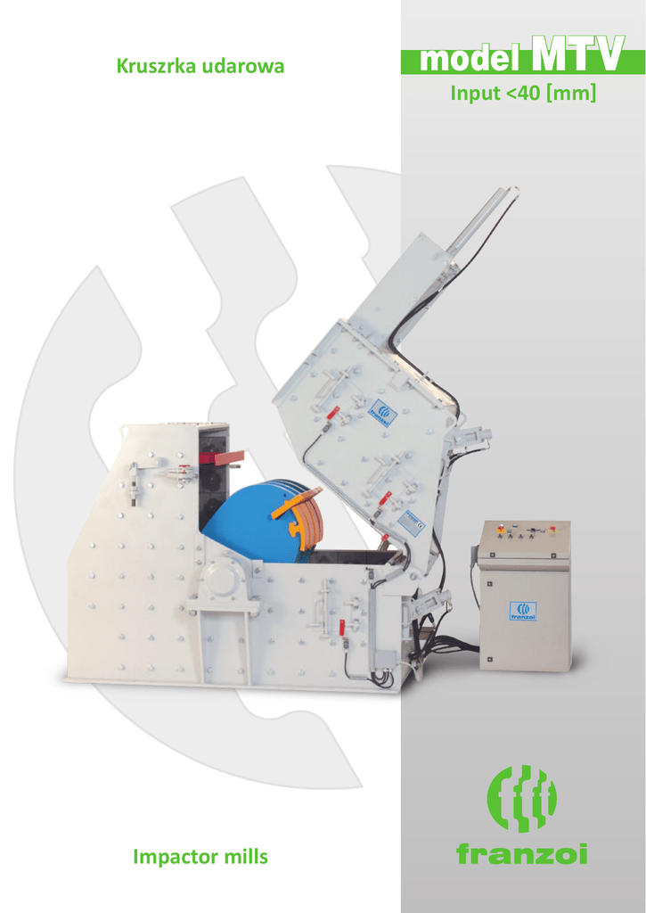 Kruszrka udarowa Impactor mills model MTV Input <40 [mm] OPIS URZĄDZENIA Kruszarka MTV firmy Franzoi METALMECCANICA S.r.l. jest to stacjonarna kruszarka młotkowa kruszenia trzeciego stopnia, zaprojektowana i wykonana do produkcji piasków bogatych w drobne ziarna . Dzięki specjalnej konstrukcji komory rozdrabniania, kruszenie następuje za pomocą udaru, co umożliwia optymalizację wytwarzania i minimalizuje wytwarzanie niepożądanego wypełniacza. Konstrukcja gwarantuje również zauważalne zmniejszenie kosztów zużycia i kosztów eksploatacyjnych. Urządzenie zawiera innowacyjne rozwiązania techniczne w zakresie zamykania i otwierania obudowy , regulacji uchwytów płyty pancerza , wymiany młotków i pokryw koła zamachowego , co znacznie skraca czas przestoju maszyny w celu jej konserwacji. Ponadto automatyczny system czasowy pozwala na czyszczenie otworu wlotowego w trakcie pracy urządzenia bez konieczności interwencji ze strony operatora i bez potrzeby wyłączania młyna . Kruszarka MTV z kontrolą hydrauliczną jest dostarczana z konsolą sterowania zamontowaną na pulpicie. W sercu konsoli znajduje się PLC , który stale kontroluje stan maszyny i komunikuje się z resztą systemu. Panel kontrolny pulpitu pozwala na : pełną regulację , za pośrednictwem systemów hydraulicznych, uchwytów płyt pancernych - otwieranie / zamykanie ruchomej części maszyny za pomocą tłoka hydraulicznego. MACHINE DESCRIPTION The MTV Mill from Franzoi Metalmeccanica S.r.l. is a tertiary fixed hammer mill, designed and manufactured for the production of sands rich in fine polyhedral grains. Thanks to the special design of the crushing chamber, the milling is achieved entirely via impaction, permitting the optimisation of the production and minimising the production of unwanted filler. The design also guarantees a noticeable reduction in wear and operating costs. The machine includes innovative technical solutions for the closing and opening of the casing, the adjustment of the armour panel holders, replacement of the hammers, and of the flywheel covers, greatly reducing the downtime of the machine for maintenance purposes. Furthermore, an automatic timed system allows cleaning of the feed opening during operation of the machine without the need for intervention from the operator and without the need to shut down the mill. The MTV Mill with hydraulic controls is supplied with a control console mounted on a pulpit. At the heart of the console is a PLC that constantly monitors the state of the machine and communicates with the rest of the system. The pulpit’s control panel allows: complete adjustment, via the hydraulic systems, of the armour holders - opening / closing of the moving part of the machine via a hydraulic piston. D E Wymiary Model A długość B szerokość C wysokość D x E szerokość wlotu F Wirnik B Dimensions Model MTV0400MTV0600MTV0800MTV1200 Lenght [mm] 2.630 2.630 2.630 2.630 Width [mm] 1.080 1.340 1.560 1.960 Height [mm] 2.560 2.560 2.560 2.560 Feed opening width [mm] 350 x 100 550 x 100 750 x 100 1150 x 100 Rotor [mm] 1.400 1.400 1.400 1.400 Dane techniczne Technical Data Model Moc silnika Prędkość wirnika Wielkość nadawy Wydajność Ciężar METALMECCANICA Via G. Rossa, 18/A z.i. - Scorzè (VE) ITALIA tel. +39 041.445304 - fax +39 041.5847007 e-mail: [email protected] www.franzoisrl.com Model MTV0400MTV0600MTV0800MTV1200 Engine Power [kW] 45 ÷ 90 55 ÷ 110 90 ÷ 160 132 ÷ 200 Rotor speed [rpm] 700 ÷ 830 700 ÷ 830 700 ÷ 830 700 ÷ 830 Feed size [mm] maks. 40 maks. 40 maks. 40 maks. 40 Production [t/h] 30 ÷ 40 30 ÷ 60 40 ÷ 90 70 ÷ 120 Weight [kg] 5.900 6.500 7.800 9.400 Ref. no: FM-MTV-14 Printed: 02/2014 A Dane przedstawione w niniejszym katalogu są orientacyjne i mogą być modyfikowane zgodnie z oczekiwaniami klienta Data shown in this catalogue may change according with technical improvements C F