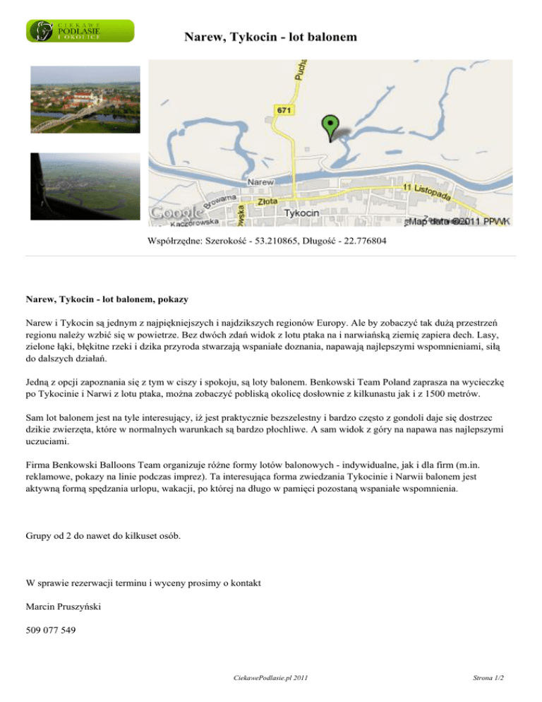 Narew, Tykocin - lot balonem Współrzędne: Szerokość - 53.210865, Długość - 22.776804 Narew, Tykocin - lot balonem, pokazy Narew i Tykocin są jednym z najpiękniejszych i najdzikszych regionów Europy. Ale by zobaczyć tak dużą przestrzeń regionu należy wzbić się w powietrze. Bez dwóch zdań widok z lotu ptaka na i narwiańską ziemię zapiera dech. Lasy, zielone łąki, błękitne rzeki i dzika przyroda stwarzają wspaniałe doznania, napawają najlepszymi wspomnieniami, siłą do dalszych działań. Jedną z opcji zapoznania się z tym w ciszy i spokoju, są loty balonem. Benkowski Team Poland zaprasza na wycieczkę po Tykocinie i Narwi z lotu ptaka, można zobaczyć pobliską okolicę dosłownie z kilkunastu jak i z 1500 metrów. Sam lot balonem jest na tyle interesujący, iż jest praktycznie bezszelestny i bardzo często z gondoli daje się dostrzec dzikie zwierzęta, które w normalnych warunkach są bardzo płochliwe. A sam widok z góry na napawa nas najlepszymi uczuciami. Firma Benkowski Balloons Team organizuje różne formy lotów balonowych - indywidualne, jak i dla firm (m.in. reklamowe, pokazy na linie podczas imprez). Ta interesująca forma zwiedzania Tykocinie i Narwii balonem jest aktywną formą spędzania urlopu, wakacji, po której na długo w pamięci pozostaną wspaniałe wspomnienia. Grupy od 2 do nawet do kilkuset osób. W sprawie rezerwacji terminu i wyceny prosimy o kontakt Marcin Pruszyński 509 077 549 CiekawePodlasie.pl 2011 Strona 1/2 [email protected] Narew, Tykocin - lot balonem CiekawePodlasie.pl 2011 Strona 2/2