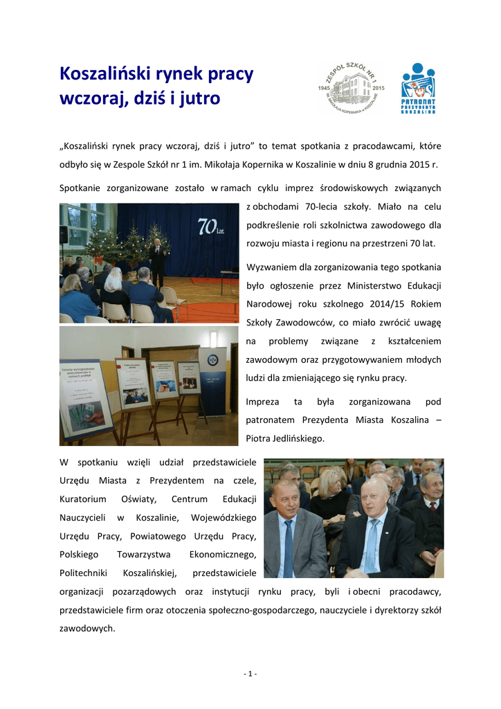 Koszaliński rynek pracy wczoraj, dziś i jutro „Koszaliński rynek pracy wczoraj, dziś i jutro” to temat spotkania z pracodawcami, które odbyło się w Zespole Szkół nr 1 im. Mikołaja Kopernika w Koszalinie w dniu 8 grudnia 2015 r. Spotkanie zorganizowane zostało w ramach cyklu imprez środowiskowych związanych z obchodami 70-lecia szkoły. Miało na celu podkreślenie roli szkolnictwa zawodowego dla rozwoju miasta i regionu na przestrzeni 70 lat. Wyzwaniem dla zorganizowania tego spotkania było ogłoszenie przez Ministerstwo Edukacji Narodowej roku szkolnego 2014/15 Rokiem Szkoły Zawodowców, co miało zwrócić uwagę na problemy związane z kształceniem zawodowym oraz przygotowywaniem młodych ludzi dla zmieniającego się rynku pracy. Impreza ta była zorganizowana pod patronatem Prezydenta Miasta Koszalina – Piotra Jedlińskiego. W spotkaniu wzięli udział przedstawiciele Urzędu Miasta z Prezydentem na czele, Kuratorium Nauczycieli Oświaty, w Centrum Koszalinie, Edukacji Wojewódzkiego Urzędu Pracy, Powiatowego Urzędu Pracy, Polskiego Politechniki Towarzystwa Koszalińskiej, Ekonomicznego, przedstawiciele organizacji pozarządowych oraz instytucji rynku pracy, byli i obecni pracodawcy, przedstawiciele firm oraz otoczenia społeczno-gospodarczego, nauczyciele i dyrektorzy szkół zawodowych. -1- Spotkanie rozpoczęło się powitaniem gości przez dyrektora szkoły – Jadwigę Topolan, a uroczystego otwarcia dokonał Prezydent Miasta - Piotr Jedliński. Witający podkreślali, że podejmowane inicjatywy lokalne mają na celu zwrócenie szczególnej uwagi na poprawę funkcjonowania szkolnictwa zawodowego, podniesienie jego jakości i atrakcyjności oraz przywrócenie jego społecznej rangi. W zapisane w tle spotkania jubileusze 70-lecia szkoły i 750-lecia miasta wprowadził wszystkich retrospektywny film „Życie gospodarcze Koszalina na przestrzeni 70 lat”. Film, zrealizowany został przez nauczyciela Zespołu Szkół nr 1, Marka Nyczkę, w oparciu o dostępne materiały źródłowe. Stanowił on próbę odniesienia się do tego co było, jak wyglądało życie gospodarcze i społeczne miasta oraz jaki był wpływ rozwoju szkolnictwa zawodowego na przestrzeni lat na budujący się przemysł, handel i administrację. W XXI wiek i strategie rozwoju nowoczesnego miasta wprowadziła uczestników prezentacja Prezydenta Miasta na temat „Gospodarka Koszalina – stan obecny i perspektywy”. Pokazane działania i zamierzenia inwestycyjne w obszarach kultury, sportu i rekreacji, komunikacji oraz infrastruktury miejskiej oraz -2- działania w obszarze szkolnictwa, wskazują na wielopłaszczyznowy rozwój miasta, zwiększającą się jego atrakcyjność oraz przybywające miejsca pracy. Do tego zagadnienia odniósł się w swoim wystąpieniu kolejny prelegent – dyrektor Powiatowego Urzędu Pracy w Koszalinie – Henryk Kozłowski. Prezentacja na temat „Rynek pracy a struktura zatrudnienia” pozwoliła uczestnikom spotkania na poznanie struktury zatrudnienia na koszalińskim rynku pracy. Rynek pracy ulega ciągłym zmianom. Nowoczesne technologie wymuszają nieustanne zmiany kwalifikacji oraz tworzenie nowych zawodów. Czy szkolnictwo zawodowe jest na to przygotowane… Czy szkoły nadążają za tak szybkimi zmianami… Te pytania skierowane zostały do doradcy zawodowego z Centrum Informacji i Planowania Kariery Zawodowej koszalińskiego oddziału WUP w Szczecinie - Ewy Ziółkowskiej. Prezentacja na temat „Zawody przyszłości” wskazywała na niedostosowanie kompetencji absolwentów szkół do potrzeb i oczekiwań pracodawców. Przedstawiono informacje dotyczące kierunków w jakich szkoły powinny przygotowywać młodego człowieka, w jakie umiejętności wyposażać go, kogo kształcić i dla jakiego rynku pracy. „Obszary działań miasta w zakresie wspierania przedsiębiorczości” to odpowiedź Prezydenta Miasta na umowę Ministerstwa Edukacji Narodowej z Ministerstwem Pracy i Polityki Społecznej w zakresie budowania relacji między światem biznesu a szkołami. Prezydent Piotr Jedliński w 2015 r. powołał Pełnomocnika Prezydenta ds. Inwestycji Kluczowych i Zatrudnienia – Joannę Piotrkowską-Ciechomską, -3- której zadaniem jest m.in. inicjowanie i koordynowanie działań związanych z przygotowaniem kadry zawodowej dla pracodawców oraz stworzenie stałej platformy, przyjmującej różne formy współpracy pomiędzy szkołami i przedstawicielami rynku pracy. Kolejnym punktem spotkania były przygotowane prezentacje koszalińskich szkół zawodowych. Przedstawiono współpracę i aktywność szkół z pracodawcami, uczelniami wyższymi oraz środowiskiem lokalnym na rożnych płaszczyznach, w zależności od specyfiki i przyjętej strategii rozwoju szkoły. Pokazano różne formy działalności szkół, które zwiększają atrakcyjność zdobywania wiedzy przez uczniów poprzez udział w warsztatach specjalistycznych, spotkaniach z praktykami życia gospodarczego i specjalistami, przez udział w stażach krajowych i zagranicznych, tworzenie klas patronackich i akademickich. Prezentacje wykazały, że koszalińskie szkoły zawodowe, wbrew utartym w niektórych środowiskach opiniom, uczą i przygotowują młodzież do podejmowania pracy w wybranych kierunkach. Wciąż jednak wiele jest wyzwań przed dyrektorami szkół, którzy muszą zadbać o szkolenia kadry i pozyskiwanie środków finansowych na doposażenie bazy, a także pozyskiwanie sympatii i zaufania pracodawców. Kolejno głos zabrała Elżbieta Waliszewska – nauczyciel przedmiotów zawodowych w Zespole Szkół nr 1 w Koszalinie, która podkreśliła kształcenia włączeniu znaczenie młodzieży do profesjonalnego i nauczycieli, współpracy przy pracodawców. W szczególności zaznaczyła, że stały monitoring rynku pracy pozwoli na dostosowywanie systemu edukacji do oczekiwań pracodawców. Jako szczególnie istotne czynniki wskazano: -4- – modernizację bazy techniczno-dyd