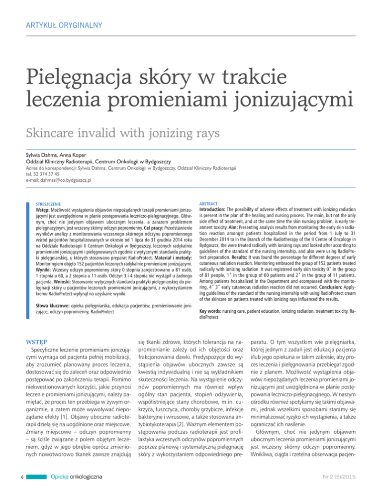 ARTYKUŁ ORYGINALNY Pielęgnacja skóry w trakcie leczenia promieniami jonizującymi Skincare invalid with jonizing rays Sylwia Dahms, Anna Koper Oddział Kliniczny Radioterapii, Centrum Onkologii w Bydgoszczy Adres do korespondencji: Sylwia Dahms, Centrum Onkologii w Bydgoszczy, Oddział Kliniczny Radioterapii tel. 52 374 37 45 e-mail: [email protected] ABSTRACT STRESZCZENIE Wstęp: Możliwość wystąpienia objawów niepożądanych terapii promieniami jonizującymi jest uwzględniona w planie postępowania leczniczo-pielęgnacyjnego. Głównym, choć nie jedynym objawem ubocznym leczenia, a zarazem problemem pielęgnacyjnym, jest wczesny skórny odczyn popromienny. Cel pracy: Przedstawienie wyników analizy z monitorowania wczesnego skórnego odczynu popromiennego wśród pacjentów hospitalizowanych w okresie od 1 lipca do 31 grudnia 2014 roku na Oddziale Radioterapii II Centrum Onkologii w Bydgoszczy, leczonych radykalnie promieniami jonizującymi i pielęgnowanych zgodnie z wytycznymi standardu praktyki pielęgniarskiej, u których stosowano preparat RadioProtect. Materiał i metody: Monitoringiem objęto 152 pacjentów leczonych radykalnie promieniami jonizującymi. Wyniki: Wczesny odczyn popromienny skóry 0 stopnia zarejestrowano u 81 osób, 1 stopnia u 60, a 2 stopnia u 11 osób. Odczyn 3 i 4 stopnia nie wystąpił u żadnego pacjenta. Wnioski: Stosowanie wytycznych standardu praktyki pielęgniarskiej do pielęgnacji skóry u pacjentów leczonych promieniami jonizującymi, z wykorzystaniem kremu RadioProtect wpłynął na uzyskane wyniki. Słowa kluczowe: opieka pielęgniarska, edukacja pacjentów, promieniowanie jonizujące, odczyn popromienny, RadioProtect WSTĘP Specyficzne leczenie promieniami jonizującymi wymaga od pacjenta pełnej mobilizacji, aby zrozumieć planowany proces leczenia, dostosować się do zaleceń oraz odpowiednio postępować po zakończeniu terapii. Pomimo niekwestionowanych korzyści, jakie przynosi leczenie promieniami jonizującymi, należy pamiętać, że proces ten przebiega w żywym organizmie, a zatem może wywoływać niepożądane efekty [1]. Objawy uboczne radioterapii dzielą się na uogólnione oraz miejscowe. Zmiany miejscowe – odczyn popromienny – są ściśle związane z polem objętym leczeniem, gdyż w jego obrębie oprócz zmienionych nowotworowo tkanek zawsze znajdują 6 Opieka onkologiczna Introduction: The possibility of adverse effects of treatment with ionizing radiation is present in the plan of the healing and nursing process. The main, but not the only side effect of treatment, and at the same time the skin nursing problem, is early treatment toxicity. Aim: Presenting analysis results from monitoring the early skin radiation reaction amongst patients hospitalized in the period from 1 July to 31 December 2014 to in the Branch of the Radiotherapy of the II Centre of Oncology in Bydgoszcz, the were treated radically with ionizing rays and looked after according to guidelines of the standard of the nursing internship, and also were using RadioProtect preparation. Results: It was found the percentage for different degrees of early cutaneous radiation reaction. Monitoring embraced the group of 152 patients treated radically with ionizing radiation. It was registered early skin toxicity 0˚ in the group of 81 people, 1˚ in the group of 60 patients and 2˚ in the group of 11 patients. Among patients hospitalized in the Department and ecompassed with the monitoring, 4˚ 3˚ early cutaneous radiation reaction did not occurred. Conclusion: Applying guidelines of the standard of the nursing internship with using RadioProtect cream of the skincare on patients treated with ionizing rays influenced the results. Key words: nursing care, patient education, ionizing radiation, treatment toxicity, RadioProtect się tkanki zdrowe, których tolerancja na napromienianie zależy od ich objętości oraz frakcjonowania dawki. Predyspozycje do wystąpienia objawów ubocznych zawsze są kwestią indywidualną i nie są wykładnikiem skuteczności leczenia. Na wystąpienie odczynów popromiennych ma również wpływ ogólny stan pacjenta, stopień odżywienia, współistniejące stany chorobowe, m.in. cukrzyca, łuszczyca, choroby grzybicze, infekcje bakteryjne i wirusowe, a także stosowana antybiotykoterapia [2]. Ważnym elementem postępowania podczas radioterapii jest profilaktyka wczesnych odczynów popromiennych poprzez planową i systematyczną pielęgnację skóry z wykorzystaniem odpowiedniego pre- paratu. O tym wszystkim wie pielęgniarka, której jednym z zadań jest edukacja pacjenta i/lub jego opiekuna w takim zakresie, aby proces leczenia i pielęgnowania przebiegał zgodnie z planem. Możliwość wystąpienia objawów niepożądanych leczenia promieniami jonizującymi jest uwzględniona w planie postępowania leczniczo-pielęgnacyjnego. W naszym ośrodku również spotykamy się takimi objawami, jednak wszelkimi sposobami staramy się minimalizować ryzyko ich wystąpienia, a także ograniczać ich nasilenie. Głównym, choć nie jedynym objawem ubocznym leczenia promieniami jonizującymi jest wczesny skórny odczyn popromienny. Wnikliwa, ciągła i rzetelna obserwacja pacjen- Nr 2 (5)/2015 ARTYKUŁ ORYGINALNY ta przez personel pielęgniarski, nawiązanie z chorym życzliwego kontaktu, opartego na wzajemnym zaufaniu wpływa na prawidłowy przebieg pielęgnowania oraz skuteczne przygotowanie go do radzenia sobie w problematycznych sytuacjach po zakończeniu leczenia i hospitalizacji. Personel pielęgniarski Oddziału Radioterapii II Centrum Onkologii w Bydgoszczy posiada wysokie kwalifikacje oraz szerokie kompetencje. Wszystkie osoby ukończyły kurs dokształcający w zakresie opieki pielęgniarskiej w radioterapii, a 69% personelu pielęgniarskiego ma specjalizację w dziedzinie pielęgniarstwa onkologicznego. Zespół realizuje swoje zadania w zakresie edukacji i pielęgnacji w oparciu o opracowane standardy praktyki pielęgniarskiej 