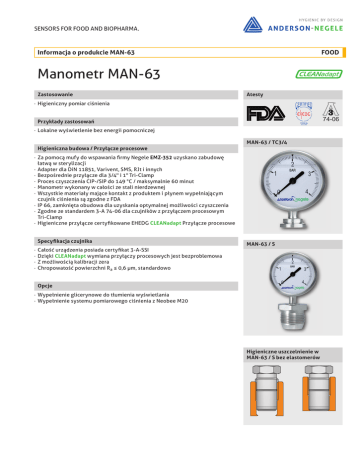 SENSORS FOR FOOD AND BIOPHARMA. Informacja o produkcie MAN-63 FOOD Manometr MAN-63 Zastosowanie Atesty · Higieniczny pomiar ciśnienia Przykłady zastosowań TYPE EL March 2006 · Lokalne wyświetlenie bez energii pomocniczej Higieniczna budowa / Przyłącze procesowe MAN-63 / TC3/4 · Za pomocą mufy do wspawania firmy Negele EMZ-352 uzyskano zabudowę łatwą w sterylizacji · Adapter dla DiN 11851, Varivent, SMS, RJt i innych · Bezpośrednie przyłącze dla 3/4" i 1" Tri-Clamp · Proces czyszczenia CIP-/SIP do 149 °C / maksymalnie 60 minut · Manometr wykonany w całości ze stali nierdzewnej · Wszystkie materiały mające kontakt z produktem i płynem wypełniającym czujnik ciśnienia są zgodne z FDA · IP 66, zamknięta obudowa dla uzyskania optymalnej możliwości czyszczenia · Zgodne ze standardem 3-A 74-06 dla czujników z przyłączem procesowym Tri-Clamp · Higieniczne przyłącze certyfikowane EHEDG CLEANadapt Przyłącze procesowe Specyfikacja czujnika · · · · Całość urządzenia posiada certyfikat 3-A-SSI Dzięki CLEANadapt wymiana przyłączy procesowych jest bezproblemowa Z możliwością kalibracji zera Chropowatość powierzchni Ra ≤ 0,6 µm, standardowo MAN-63 / S Opcje · Wypełnienie glicerynowe do tłumienia wyświetlania · Wypełnienie systemu pomiarowego ciśnienia z Neobee M20 Higieniczne uszczelnienie w MAN-63 / S bez elastomerów 74-06 Dane techniczne | Adapter FOOD Dane techniczne Materiał Membrana Przyłącze procesowe Rurka Burdona System pomiarowy Obudowa Wziernik Wypełnienie obudowy Medium czujnika Numer dopuszczenia FDA opcjonalnie 1.4404 (316L) Ra ≤ 0,6 µm (0,6 mikrona, 24 mikrocali) 1.4404 (316L) 1.4301 (304) 1.4301 (304) 1.4301 (304) Poliwęglan Gliceryna (opcjonalnie) Olej parafinowy / biały olej medyczny 21 CFR 172.878 i 21 CFR 178.3620(a) Neobee M20 Stopień ochrony IP 66 Stabilność nadciśnieniowa minimalnie 25 % wartości krańcowej Dokładność ± 1,5 % wartości krańcowej Powtarzalność ± 0,5 % wartości krańcowej Liniowość ± 0,5 % wartości krańcowej Histereza ± 0,5 % wartości krańcowej Temperatura Prozes Proces czyszczenia CIP-/SIP Otoczenie -3 °C...140 °C (25 °F...284 °F) 149 °C (300°F) / maksymalnie 60 minut 4 °C...49 °C (40 °F...120 °F) spowolniona reakcja przy niskich temperaturach Dryft temp. w zakresie 10...90 % < ±0,01 % / K wartości krańcowej Proces i otoczenie Waga 140 g...390 g (w zależności od podłączenia procesowego i wypełnienia) Wybór przyłączy procesowych dla MAN-63 / S (Adaptery należy zamawiać oddzielnie!) Kompletne zestawienie wszystkich dostępnych adapterów można znaleźć w informacji o produktach CLEANadapt. MAN-63 / S Tri-Clamp Mleczarskie (DIN 11851) DRD (Pierścień ciśnieniowy dostarczany opcjonalnie) Przyłącze procesowe Rura EHG (DIN 11850 serii 2) Mufa do wspawania Negele DN25 1" - EMZ-352 AMC-352/DN25 AMK-352/DN25 - DN40 1½" EHG-DIN2-40/1" AMC-352/DN25 AMK-352/DN40 - DN50 2" EHG-DIN2-50/1" nadaje się do zabudowy w zbiornikach AMC-352/DN50 AMK-352/DN50 AMK-352/DN50 DN65 3" EHG-DIN2-65/1" EMS-352 AMC-352/DN65 AMK-352/DN65 AMK-352/DN50 DN80 EHG-DIN2-80/1" AMC-352/DN80 AMK-352/DN80 AMK-352/DN50 DN100 EHG-DIN2-100/1" nadają się do zabudowy w rurociągach AMC-352/DN100 AMK-352/DN100 AMK-352/DN50 2 Rysunki wymiarowe FOOD MAN-63 / TC3/4 MAN-63 / TC3/4 MAN-63 / TC1 Ø 24,8 mm (0,97") 81 mm (3.20") 81 mm (3.20") Zatyczki do wypełnienia 4,2 mm (0,16") Ø 50,5 mm (1") Ø 25 mm (3/4") MAN-63 / TC3/4 opcjonalnie podłączenie L / R MAN-63 /S opcjonalnie podłączenie L / R L L R MAN-63 / S MAN-63 / S Ø 24,8 mm (0,97") Ø 63 mm (2,48") Zatyczki do wypełnienia 4,2 mm (0,16") 107 mm (4.20") 3 G 1" Śruba złączkowa SW38 R Informacja o produkcie MAN-63 FOOD Oznaczenie zamówienia MAN-63 (Średnica obudowy 63 mm) Przyłącza procesowe TC3/4 (Tri-Clamp 3/4") TC1 (Tri-Clamp 1") S (CLEANadapt G1"; bez dopuszczenia 3-A TPV) Zakres pomiarowy (-1,0...2,0 bar) -1...+2 -1...+4 (-1,0...4,0 bar) 0...2 (0...2,0 bar) (0...4,0 bar) 0...4 0...6 (0...6,0 bar) (0...7,0 bar) 0...7 0...11 (0...11,0 bar) Płynne medium X (Olej parafinowy) GC (Neobee M20) Możliwość kalibracji X (bez) tłumienia X (bez) GZ (Wypełnienia glicerynowego) Kierunek przyłączenia U (dół) L (lewy) R (prawy) MAN-63 / TC1 / 0...2 / X/ X/ X/ U Warunki dla punktu pomiarowego według standardu 3-A 74-06 ·· Czujniki MAN-63 / TC ... są seryjnie zgodne ze standardem 3-A. ·· Czujniki są przystosowane do procesu czyszczenia CIP / SIP. Maksymalnie 149°C / 60 minut. ·· Tylko w połączeniu z przyłączem procesowym Tri-Clamp zgodnym ze standardem 3-A . ·· Pozycja montażowa: Należy przestrzegać odpowiednich instrukcji według obowiązującego standardu 3-A dla pozycji montażowej i samoczynnego opróżniania oraz dla pozycji otworu przeciekowego. 50039 / 3.0 / 2015-01-21 / MU / EU NEGELE MESSTECHNIK GMBH Raiffeisenweg 7 87743 Egg an der Guenz Phone +49 (0) 83 33 . 92 04 - 0 Fax +49 (0) 83 33 . 92 04 - 49 [email protected] Tech. Support: [email protected] Phone +49 (0) 83 33 . 92 04 - 720 4