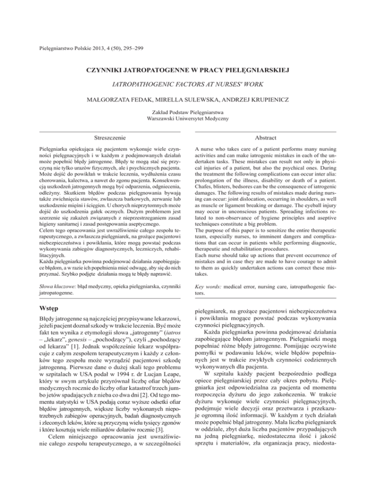 Pielęgniarstwo Polskie 2013, 4 (50), 295–299 CZYNNIKI JATROPATOGENNE W PRACY PIELĘGNIARSKIEJ IATROPATHOGENIC FACTORS AT NURSES' WORK MAŁGORZATA FEDAK, MIRELLA SULEWSKA, ANDRZEJ KRUPIENICZ Zakład Podstaw Pielęgniarstwa Warszawski Uniwersytet Medyczny Streszczenie Abstract Pielęgniarka opiekująca się pacjentem wykonuje wiele czynności pielęgnacyjnych i w każdym z podejmowanych działań może popełnić błędy jatrogenne. Błędy te mogą stać się przyczyną nie tylko urazów fizycznych, ale i psychicznych pacjenta. Może dojść do powikłań w trakcie leczenia, wydłużenia czasu chorowania, kalectwa, a nawet do zgonu pacjenta. Konsekwencją uszkodzeń jatrogennych mogą być odparzenia, odgniecenia, odleżyny. Skutkiem błędów podczas pielęgnowania bywają także zwichnięcia stawów, zwłaszcza barkowych, zerwanie lub uszkodzenie mięśni i ścięgien. U chorych nieprzytomnych może dojść do uszkodzenia gałek ocznych. Dużym problemem jest szerzenie się zakażeń związanych z nieprzestrzeganiem zasad higieny sanitarnej i zasad postępowania aseptycznego. Celem tego opracowania jest uwrażliwienie całego zespołu terapeutycznego, a zwłaszcza pielęgniarek, na grożące pacjentowi niebezpieczeństwa i powikłania, które mogą powstać podczas wykonywania zabiegów diagnostycznych, leczniczych, rehabilitacyjnych. Każda pielęgniarka powinna podejmować działania zapobiegające błędom, a w razie ich popełnienia mieć odwagę, aby się do nich przyznać. Szybko podjęte działania mogą te błędy naprawić. A nurse who takes care of a patient performs many nursing activities and can make iatrogenic mistakes in each of the undertaken tasks. These mistakes can result not only in physical injuries of a patient, but also the psychical ones. During the treatment the following complications can occur inter alia: prolongation of the illness, disability or death of a patient. Chafes, blisters, bedsores can be the consequence of iatrogenic damages. The following results of mistakes made during nursing can occur: joint dislocation, occurring in shoulders, as well as muscle or ligament breaking or damage. The eyeball injury may occur in unconscious patients. Spreading infections related to non-observance of hygiene principles and aseptive techniques constitute a big problem. The purpose of this paper is to sensitize the entire therapeutic team, especially nurses, to imminent dangers and complications that can occur in patients while performing diagnostic, therapeutic and rehabilitation procedures. Each nurse should take up actions that prevent occurrence of mistakes and in case they are made to have courage to admit to them as quickly undertaken actions can correct these mistakes. Słowa kluczowe: błąd medyczny, opieka pielęgniarska, czynniki jatropatogenne. Key words: medical error, nursing care, iatropathogenic factors. Wstęp Błędy jatrogenne są najczęściej przypisywane lekarzowi, jeżeli pacjent doznał szkody w trakcie leczenia. Być może fakt ten wynika z etymologii słowa „jatrogenny” (iatros – „lekarz”, genesis – „pochodzący”), czyli „pochodzący od lekarza” [1]. Jednak współcześnie lekarz współpracuje z całym zespołem terapeutycznym i każdy z członków tego zespołu może wyrządzić pacjentowi szkodę jatrogenną. Pierwsze dane o dużej skali tego problemu w szpitalach w USA podał w 1994 r. dr Lucjan Leape, który w swym artykule przyrównał liczbę ofiar błędów medycznych rocznie do liczby ofiar katastrof trzech jumbo jetów spadających z nieba co dwa dni [2]. Od tego momentu statystyki w USA podają coraz wyższe odsetki ofiar błędów jatrogennych, większe liczby wykonanych niepotrzebnych zabiegów operacyjnych, badań diagnostycznych i zleconych leków, które są przyczyną wielu tysięcy zgonów i które kosztują wiele miliardów dolarów rocznie [3]. Celem niniejszego opracowania jest uwrażliwienie całego zespołu terapeutycznego, a w szczególności pielęgniarek, na grożące pacjentowi niebezpieczeństwa i powikłania mogące powstać podczas wykonywania czynności pielęgnacyjnych. Każda pielęgniarka powinna podejmować działania zapobiegające błędom jatrogennym. Pielęgniarki mogą popełniać różne błędy jatrogenne. Pomijając oczywiste pomyłki w podawaniu leków, wiele błędów popełnianych jest w trakcie zwykłych czynności codziennych wykonywanych dla pacjenta. W szpitalu każdy pacjent bezpośrednio podlega opiece pielęgniarskiej przez cały okres pobytu. Pielęgniarka jest odpowiedzialna za pacjenta od momentu rozpoczęcia dyżuru do jego zakończenia. W trakcie dyżuru wykonuje wiele czynności pielęgnacyjnych, podejmuje wiele decyzji oraz przetwarza i przekazuje ogromną ilość informacji. W każdym z tych działań może popełnić błąd jatrogenny. Mała liczba pielęgniarek w oddziale, zbyt duża liczba pacjentów przypadających na jedną pielęgniarkę, niedostateczna ilość i jakość sprzętu i materiałów, zła organizacja pracy, niedosta- 296 Małgorzata Fedak, Mirella Sulewska, Andrzej Krupienicz teczna wiedza i nieznajomość często uaktualnianych procedur oraz wiele innych czynników predysponuje do popełniania błędów. Błędy powstałe w wyniku wykonywanych czynności pielęgniarskich mogą spowodować różne szkody dla pacjenta, począwszy od niepokoju i dyskomfortu, poprzez powikłania w trakcie leczenia i wydłużenie czasu pobytu w szpitalu, aż po trwałe kalectwo lub zgon pacjenta. Wiele czynności pielęgniarka jest zmuszona wykonywać w pośpiechu, aby zdążyć ze wszystkimi zadaniami podczas dyżuru. Pośpiesznie wykonywane toalety, podmywanie chorego i inne działania mogą być przyczyną odparzeń w wyniku niedostatecznego osuszania skóry lub zamoczenia bielizny po toalecie, przeciekających, długo niezmienianych opatrunków, zbyt grubo nałożonych opatrunków, zwłaszcza podczas upałów, źle ułożonych, przylegających do ciała dre