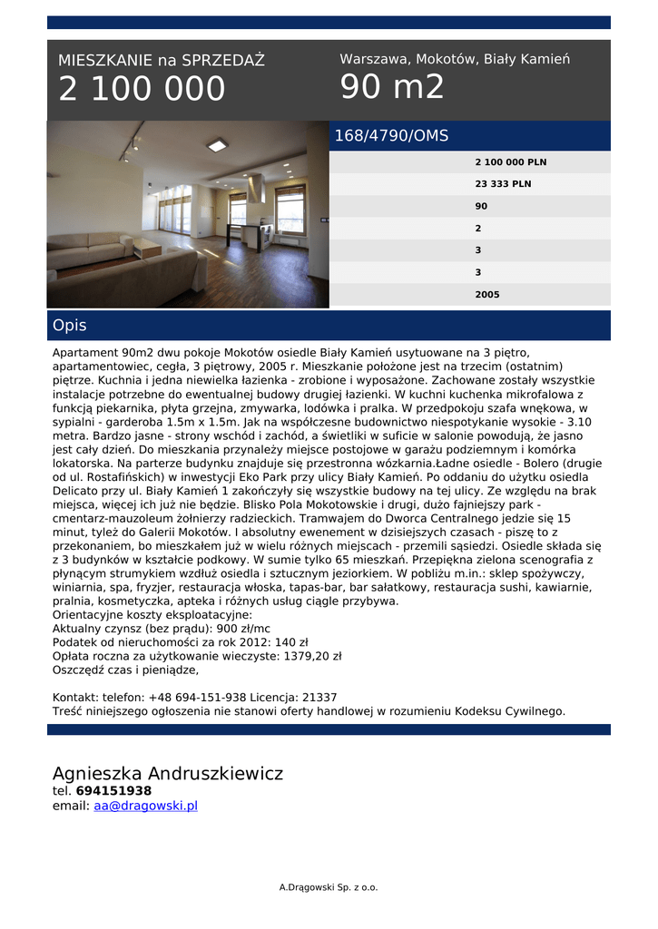 Warszawa, Mokotów, Biały Kamień MIESZKANIE na SPRZEDAŻ 90 m2 2 100 000 168/4790/OMS 2 100 000 PLN 23 333 PLN 90 2 3 3 2005 Opis Apartament 90m2 dwu pokoje Mokotów osiedle Biały Kamień usytuowane na 3 piętro, apartamentowiec, cegła, 3 piętrowy, 2005 r. Mieszkanie położone jest na trzecim (ostatnim) piętrze. Kuchnia i jedna niewielka łazienka - zrobione i wyposażone. Zachowane zostały wszystkie instalacje potrzebne do ewentualnej budowy drugiej łazienki. W kuchni kuchenka mikrofalowa z funkcją piekarnika, płyta grzejna, zmywarka, lodówka i pralka. W przedpokoju szafa wnękowa, w sypialni - garderoba 1.5m x 1.5m. Jak na współczesne budownictwo niespotykanie wysokie - 3.10 metra. Bardzo jasne - strony wschód i zachód, a świetliki w suficie w salonie powodują, że jasno jest cały dzień. Do mieszkania przynależy miejsce postojowe w garażu podziemnym i komórka lokatorska. Na parterze budynku znajduje się przestronna wózkarnia.Ładne osiedle - Bolero (drugie od ul. Rostafińskich) w inwestycji Eko Park przy ulicy Biały Kamień. Po oddaniu do użytku osiedla Delicato przy ul. Biały Kamień 1 zakończyły się wszystkie budowy na tej ulicy. Ze względu na brak miejsca, więcej ich już nie będzie. Blisko Pola Mokotowskie i drugi, dużo fajniejszy park cmentarz-mauzoleum żołnierzy radzieckich. Tramwajem do Dworca Centralnego jedzie się 15 minut, tyleż do Galerii Mokotów. I absolutny ewenement w dzisiejszych czasach - piszę to z przekonaniem, bo mieszkałem już w wielu różnych miejscach - przemili sąsiedzi. Osiedle składa się z 3 budynków w kształcie podkowy. W sumie tylko 65 mieszkań. Przepiękna zielona scenografia z płynącym strumykiem wzdłuż osiedla i sztucznym jeziorkiem. W pobliżu m.in.: sklep spożywczy, winiarnia, spa, fryzjer, restauracja włoska, tapas-bar, bar sałatkowy, restauracja sushi, kawiarnie, pralnia, kosmetyczka, apteka i różnych usług ciągle przybywa. Orientacyjne koszty eksploatacyjne: Aktualny czynsz (bez prądu): 900 zł/mc Podatek od nieruchomości za rok 2012: 140 zł Opłata roczna za użytkowanie wieczyste: 1379,20 zł Oszczędź czas i pieniądze, Kontakt: telefon: +48 694-151-938 Licencja: 21337 Treść niniejszego ogłoszenia nie stanowi oferty handlowej w rozumieniu Kodeksu Cywilnego. Agnieszka Andruszkiewicz tel. 694151938 email: [email protected] A.Drągowski Sp. z o.o. Powered by TCPDF (www.tcpdf.org)