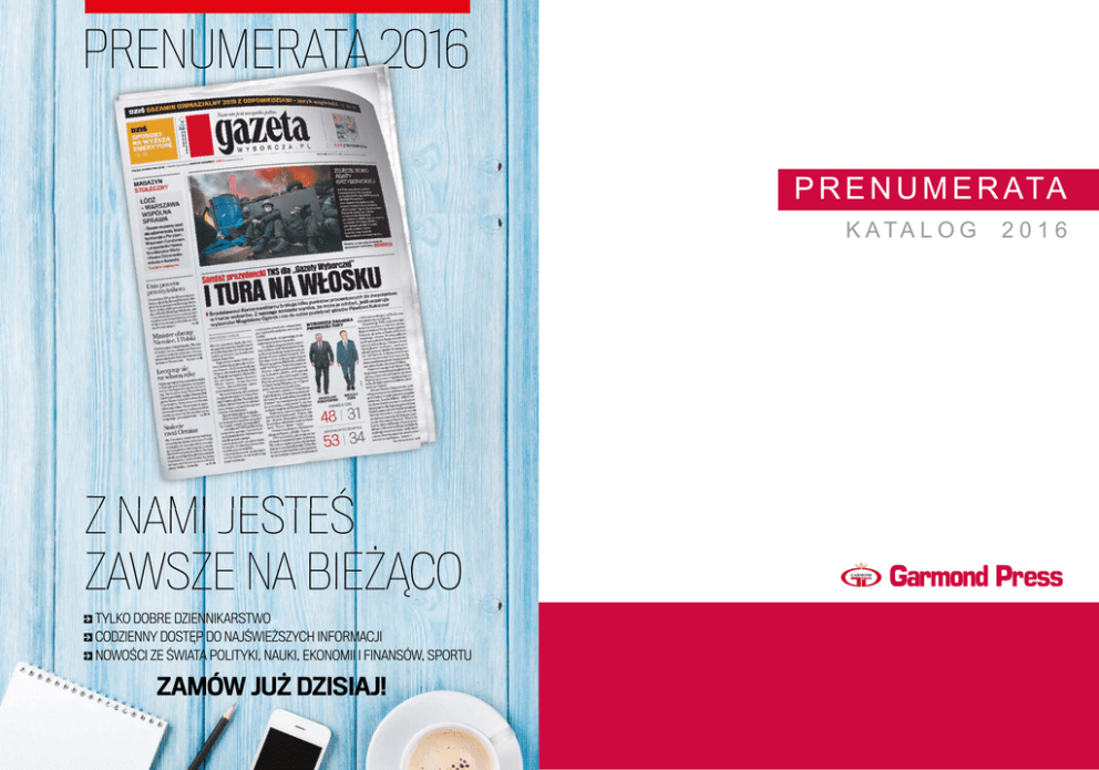 PRENUMERATA 2016 K ATA L O G Z NAMI JESTEŚ ZAWSZE NA BIEŻĄCO % TYLKO DOBRE DZIENNIKARSTWO % CODZIENNY DOSTĘP DO NAJŚWIEŻSZYCH INFORMACJI % NOWOŚCI ZE ŚWIATA POLITYKI, NAUKI, EKONOMII I FINANSÓW, SPORTU ZAMÓW JUŻ DZISIAJ! 2016 Zamów prenumeratę Dziennika Gazety Prawnej na 2016 r. Oddziały i filie Oddział Białystok Białystok, ul. Handlowa 5 tel./fax. 85 878-03-00 [email protected] Oddział Katowice Sosnowiec, ul. Małobądzka 13 tel./fax. 32 209-26-62 [email protected] Oddział Kraków Kraków, ul. Powstańców 66 tel./fax. 12 412-75-60 [email protected] Oddział Rzeszów Rzeszów, ul. Baczyńskiego 7 tel./fax. 17 852-91-01 [email protected] Oddział Bydgoszcz Bydgoszcz, ul. Grunwaldzka 207 tel./fax. 52 320-45-49 [email protected] Filia Częstochowa Częstochowa, ul. Równoległa 63 tel./fax. 34 371-06-05 [email protected] Filia Gliwice Gliwice, ul. Pszczyńska 306 tel./fax. 32 270-55-31 [email protected] Filia Kielce Kielce, ul. Hauke-Bosaka 7 tel./fax. 41 362-19-22 [email protected] Oddział Szczecin Szczecin, ul. Letnia 12 tel./fax. 91 460-12-77 [email protected] Filia Nowy Sącz Nowy Sącz, ul. Lwowska 74 A Tel./fax. 18 449-12-33 [email protected] Oddział Warszawa Warszawa, ul. Jagiellońska 88 tel./fax. 22 837-30-08 [email protected] Oddział Łódź Łódź, ul. Łąkowa 7 A tel./fax. 42 640-26-43 [email protected] Filia Lublin Lublin, ul. Energetyków 7 tel./fax. 81 524-40-82 [email protected] Oddział Olsztyn Olsztyn, ul. Poprzeczna 11A tel./fax. 89 526-07-28 [email protected] Filia Radom Radom, ul. Barlickiego 8 tel./fax. 48 333-03-29 [email protected] Oddział Poznań Poznań, ul. Unii Lubelskiej 3 tel./fax. 61 879-33-72 [email protected] Oddział Wrocław Wrocław, ul. Krakowska 141-155 tel./fax. 71 796-30-11 [email protected] Oddział Gdańsk Gdańsk, ul. Elbląska 54 tel. 58 340-98-14, fax. 58 340-96-59 [email protected] Filia Gorzów Wielkopolski Gorzów Wielkopolski, ul. Bierzarina 43 tel./fax. 95 735-33-92 [email protected] SPRAWDŻ OFERTĘ NA 2016 r. Jesteśmy tam, gdzie dzieje się coś ważnego w podatkach, prawie, gospodarce. Korzystamy z wyjaśnień ministerstw i urzędów, analizujemy przepisy, rozmawiamy z ekspertami. Codziennie dostarczamy fachową wiedzę dla specjalistów. Dbamy o Twoje bezpieczeństwo, bo wiemy, że trafne decyzje podejmuje się na podstawie wiarygodnych i kompleksowych informacji. Zamów prenumeratę, korzystaj codziennie. Czasopisma krajowe w układzie alfabetycznym i tematycznym Terminowa niezawodna dostawa prasy Szanowni Państwo! Mamy zaszczyt zaprezentować Państwu najlepszą spośród istniejących na rynku ofertę prenumeraty czasopism. Posiadamy ponad 5000 tytułów prasy polskiej i zagranicznej. Zaufało nam już ponad 13 000 największych firm i instytucji w kraju. Zapraszamy do współpracy. Przy zamówieniu prenumeraty rocznej promocyjne ceny na wybrane dzienniki i czasopisma. Udzielamy korzystnych rabatów.* Stały rabat w zależności od okresu opłacenia prenumeraty: kwartał – 10% rabatu pół roku – 12% rabatu rok – 15% rabatu Dodatkowy rabat – do negocjacji. Zamówione czasopisma dostarczamy bezpłatnie w uzgodnione miejsce już od godziny 5.00. Zamówienia Wszelkie formalności związane z zamówieniem załatwiamy bezpośrednio u Klienta. Złożone zamówienie można zmieniać w całym okresie trwania umowy w dowolnie wybranym dniu tygodnia. Zamówienia na I kwartał, półrocze lub cały 2016 rok przyjmujemy do 10 grudnia 2015. * dotyczy zamówień o wartości powyżej 900 złotych w okresie kwartału GAZETA WYBORCZA W PRENUMERACIE NA ROK 2016 W prenumeracie rocznej TANIEJ O 61 ZŁ ! Z NAMI WIESZ I ROZUMIESZ WIĘCEJ % NAJWIĘKSZY OPINIOTWÓRCZY DZIENNIK W POLSCE % ATRAKCYJNE DODATKI TEMATYCZNE I MAGAZYNOWE % ROZBUDOWANE STRONY LOKALNE ZAMÓW JUŻ DZISIAJ! Zamawiając 1 egz. więcej* Power Bank GRATIS! * na okres co najmniej pierwszego kwartału 2016 roku w stosunku do poziomu prenumeraty z października 2015 roku P A T R Z Y M Y O B I E K T Y W N I E . P I S Z E M Y O D P O W I E D Z I A L N I E Najlepiej ułożona oferta dla specjalistów NO WO Ś Ć! spe por cjalis pra adnik tyczn y -po wnodat kow y dodatki dla księgowych dodatek dla urzędników publikacje dla specjalistów pakiet narzędzi online dodatek dla prawników Korzyści z prenumeraty 2016 ● Nowość! Specjalistyczny poradnik prawno-podatkowy W całości o podatkach, rachunkowości, prawie pracy i gospodarczym, ubezpieczeniach społecznych. Kompleksowe omówienie tematów, rozwiązania konkretnych problemów, praktyczne wyjaśnienia. dodatek dla przedsiębiorców dodatki dla kadrowych ■ Fachowe dodatki: Podatki i Księgowść; Rachunkowość i Audyt; Firma i Prawo; Samorząd i Administracja; Kadry i Płace; Ubezpieczenia i Świadczenia; Prawnik ■ Pakiet przydatnych w pracy narzędzi online: Wskaźniki i stawki, akty prawne, kalkulatory, aktywne formularze i druki ■ Publikacje dla specjalistów: Książki i płyty z zakresu podatków (szczególnie VAT, PIT, CIT), prawa pracy oraz rachunkowości www.gazetaprawna.pl/oferta2016 I Zadzwoń: 22 761 31 27, 801 626 666 4 czasopisma zagraniczne dzienniki ogólnopolskie T Y TUŁ DZIENNIK GAZETA PRAWNA wersja standard cena I kwartał 62 wydania średnia cena wydania w prenumeracie rocznej 5,00 *4,75 DZIENNIK GAZETA PRAWNA wersja premium I kwartał 62 wydania średnia cena wydania w prenumeracie rocznej 5,80 *5,55 DZIENNIK GAZETA PRAWNA wersja standard + NEWSWEEK DZIENNIK GAZETA PRAWNA wersja premium + NEWSWEEK e-wydanie DZIENNIKA GAZETY PRAWNEJ I kwartał prenumerata roczna I kwartał prenumerata roczna I kwartał I półrocze prenumerata roczna I kwartał I półrocze prenumerata roczna PAKIET Z BONIFIKATĄ DZIENNIK GAZETA PRAWNA wersja standard + e-wydanie DZIENNIKA GAZETY PRAWNEJ cena pakietu cena pakietu cena pakietu I kwartał I półrocze prenumerata roczna FAKT pon. – śr. czw. – pt. sob. pon. – sob. I kwartał cena pakietu cena pakietu cena pakietu GAZETA WYBORCZA w pakiecie 