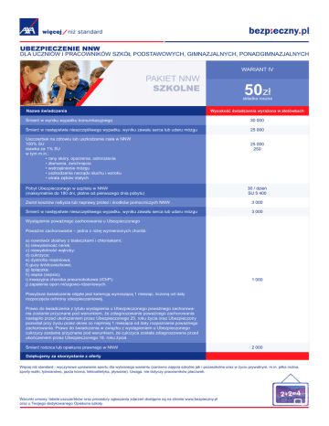 UBEZPIECZENIE NNW DLA UCZNIÓW I PRACOWNIKÓW SZKÓŁ PODSTAWOWYCH, GIMNAZJALNYCH, PONADGIMNAZJALNYCH WARIANT IV PAKIET NNW SZKOLNE 50zł składka roczna Nazwa świadczenia Wysokość świadczenia wyrażona w złotówkach Śmierć w wyniku wypadku komunikacyjnego 30 000 Śmierć w następstwie nieszczęśliwego wypadku, wyniku zawału serca lub udaru mózgu 25 000 Uszczerbek na zdrowiu lub uszkodzenie ciała w NNW 100% SU stawka za 1% SU w tym m.in.: • rany skóry, oparzenia, odmrożenia • złamania, zwichnięcia • wstrząśnienie mózgu • uszkodzenia narządu słuchu i wzroku • utrata zębów stałych Pobyt Ubezpieczonego w szpitalu w NNW (maksymalnie do 180 dni, płatne od pierwszego dnia pobytu) 25 000 250 30 / dzień SU 5 400 Zwrot kosztów nabycia lub naprawy protez i środków pomocniczych NNW 3 000 Śmierć w następstwie nieszczęśliwego wypadku, wyniku zawału serca lub udaru mózgu 3 000 Wystąpienie poważnego zachorowania u Ubezpieczonego Poważne zachorowanie – jedna z niżej wymienionych chorób: a) nowotwór złośliwy z białaczkami i chłoniakami; b) niewydolność nerek; c) niewydolność wątroby; d) cukrzyca; e) dystrofia mięśniowa; f) guzy śródczaszkowe; g) śpiączka; h) sepsa (sepsis); i) inwazyjna choroba pneumokokowa (IChP); j) zapalenie opon mózgowo-rdzeniowych. 1 000 Powyższe świadczenie objęte jest karencją wynoszącą 1 miesiąc, liczoną od daty rozpoczęcia ochrony ubezpieczeniowej. Prawo do świadczenia z tytułu wystąpienia u Ubezpieczonego poważnego zachorowania zostanie przyznane pod warunkiem, że zdiagnozowanie poważnego zachorowania nastąpiło przed ukończeniem przez Ubezpieczonego 25. roku życia oraz Ubezpieczony pozostał przy życiu przez okres co najmniej 1 miesiąca od daty rozpoznania poważnego zachorowania. Prawo do świadczenia w związku z wystąpieniem u Ubezpieczonego cukrzycy zostanie przyznane pod warunkiem, że cukrzyca została zdiagnozowana przed ukończeniem przez Ubezpieczonego 18. roku życia. Śmierć rodzica lub opiekuna prawnego w NNW 2 000 Dziękujemy za skorzystanie z oferty Więcej niż standard - wyczynowe uprawianie sportu dla wybranego wariantu (zarówno zajęcia szkolne jak i pozaszkolne oraz w życiu prywatnym, m.in. piłka nożna, sporty walki, łyżwiarstwo, jazda konna, lekkoatletyka, pływanie). Uwaga: nie dotyczy pracowników placówek. Warunki umowy, tabele uszczerbków oraz procedury zgłaszania zdarzeń dostępne są na stronie www.bezpieczny.pl oraz u Twojego dedykowanego Opiekuna szkoły.
