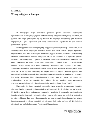 1 David Martin Wzory religijne w Europie W niniejszym eseju zamierzam poczynić pewne założenia niezwiązane z jakimikolwiek osobistymi poglądami na temat dalszej integracji europejskiej. Zakładam, że pytanie, czy religia przyczynia się czy też nie do integracji europejskiej, jest pytaniem empirycznym i jeśli odpowiedź jest raczej zniechęcająca, negatywna, to tym właśnie powinienem się zająć. Interesują mnie więc różne przejawy religijności pomiędzy Galway i Salonikami, a nie określony zbiór norm religijnych. Gdybym musiał ująć rzecz krótko i podjąć wyzwanie, sugerowałbym, że – poza klasycznymi źródłami – pojęcia wolności, równości i braterstwa są świeckim tłumaczeniem tekstów biblijnych, takich jak równość w Chrystusie, jedność ludzkości „pod opieką Boga” i sposób, w jaki każda istota ludzka jest królem i kapłanem „dla Boga”. Dodałbym do tego: „Bogu niech będą dzięki”, „Pokój Boży” i „chrześcijańska wolność” dzięki Bożej łasce. Gdy pominiemy odniesienia do Chrystusa i do Boga, otrzymamy zrozumiałe hasła republikańskich zasad i cnót. Ponieważ chrześcijański język może być w ten sposób zamieniony na zwykłe świeckie pojęcia, powstaje pytanie, czy specyficznie religijny standard złota, przechowywany (dosłownie) w skarbcach i kryptach, jest wciąż konieczny jako zabezpieczająca rezerwa, czy też został już ostatecznie przekształcony w to, co świeckie. Gdy odrzuci się ten standard, łatwo otrzymamy relatywistyczny nihilizm, który John Gray opisał w książce „Straw Dogs” (2002). Utrzymuję, że ukryty standard złota daje ciągle wsparcie oświeconym, świeckim użyciom, chociaż opiera się próbom definitywnej konwersji. Język religijny jest sui generis. W każdym razie jego podstawowa gramatyka wcielenia i zbawienia, przekształcenia i zniekształcenia, akceptacji i alienacji, ofiary i zmartwychwstania nie może być wciągnięta do sfery publicznej bez strat i kompromisów po obu stronach. Risorgimento jest echem Zmartwychwstania w sferze świeckiej, ale nie może być z nim mylone, tak jak świeckie odrodzenie nie może być mylone z Powtórnymi Narodzinami. 2 Język religijny jest zakorzeniony w specyficznym rodzaju patrzenia, specyficznych sposobach ludzkiego współbycia oraz w miejscach świętych specyficznie naznaczonych i ukształtowanych przez gesty, obrazy i okrzyki uwielbienia. Takie miejsca święte są rozproszone po całej Europie i są częścią jej jedności, tak że nawet jeśli odrzucimy chrześcijaństwo jako zasiedziałego i fałszywego lokatora, ten depozyt wiary pozostaje obecny i jest faktem społecznym. Zatem pytanie może być przeformułowane i dotyczyć tego, jak owa obecność i ów fakt mogą lub nie mogą być uznane w sferze publicznej? Powyżej nawiązałem do oświeconych programów jako do oczywistości. Z bezpiecznego punktu widzenia tego programu oświecone elity zakładają ustalony uniwersalizm, który musi jakoś współdziałać, a może przekraczać niewygodny, skłonny do podziałów i archaiczny religijny partykularyzm. Jednak w rzekomo postmodernistycznym wieku można pozwolić sobie na myślenie poza tym punktem widzenia. W praktyce mamy bowiem do czynienia z rywalizacją świeckich uniwersalizmów, reprezentowanych przez Francję, Stany Zjednoczone i (do niedawna) Rosję, a każdy z nich uwikłany jest w skomplikowane relacje z rywalizującymi religijnymi uniwersalizmami. Z pewnością w tych relacjach powinno się badać i wykorzystywać podzielane przez ludzi poglądy, dopełniające się słowniki i trwałe wspólne porozumienia, takie jak sprawiedliwy pokój czy ludzka odpowiedzialność. Ale aby ludzka godność nie była zagrożona albo łamana przez różne religie albo różne oświecenia, musi istnieć szacunek dla różnic i poczucie istnienia niezajętej neutralnej przestrzeni. Ani Bóg, ani prawda nie mogą być zastąpione przez świeckie miasto. W każdym razie abstrakcyjne prawa są stale podatne na wykorzystanie do przeciwnych celów: geje nie powinni być dyskryminowani, gdy idzie o zatrudnienie, a religijne organizacje powinny móc zatrudniać tych, którzy podzielają ich moralne przekonania. Oświecenia są więc w konflikcie, a w szczególności francuskie oświecenie, jako sprzymierzone z wszechwładnym i zsekularyzowanym państwem, jest atakowane przez mniej etatystyczne oświecenia (angielskie, szkockie, holenderskie, niemieckie i amerykańskie). Posiadały one albo, jak w przypadku Niemiec, późno wykształciły ograniczone i federalistyczne rozumienie państwa i wszystkie ukazują pobożność i rozum w częściowym przymierzu. Główny historyczny konflikt miał miejsce między wersją brytyjską i francuską, a teraz stał się konfliktem między wersją amerykańską i francuską, podczas gdy brytyjska skłania się ku zachodowi. Angielsko-holenderska genealogia z roku 1689 i amerykańska genealogia z 1776 roku długo musiały stawiać czoła genealogiom lat 1789 i 1917. 3 Nie tylko istnieją charakterystyczne i silne związki chrześcijaństwa z oświeceniami, idące na wschód i zachód przez północną linię od Harvardu po Halle, ale istnieją także silne i równoległe teologiczne szlaki komunikacyjne, zwykle idące na zachód od niemieckich źródeł. Z religijnego, językowego i historycznego punktu widzenia Wielka Brytania spogląda na zachód ku Ameryce Północnej, a także Australazji i ku globalnej anglosferze. To tutaj protestancki charakter Wielkiej Brytanii zachowuje jakieś znaczenie, mimo namiętnego romansu, jaki brytyjska klasa średnia ma z Francją, Włochami i Grecją, w poszukiwaniu miejsc, gdzie może sobie pozwolić na odprężenie zmysłów w południowym słońcu. Niezależnie od tego, postprotestancka Północ wciąż pyszni się raczej swoją zdolnością do uwewnętrznienia reguł i praw, niż do akceptowania ich w teorii i jednocześnie zaprzedawania w praktyce.