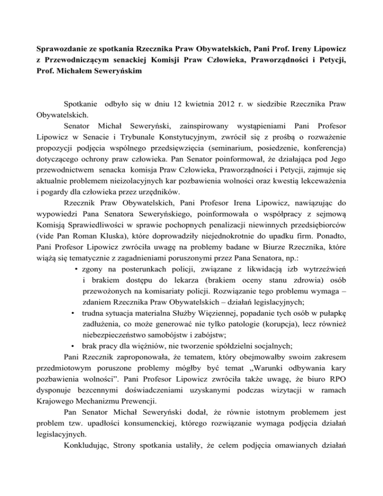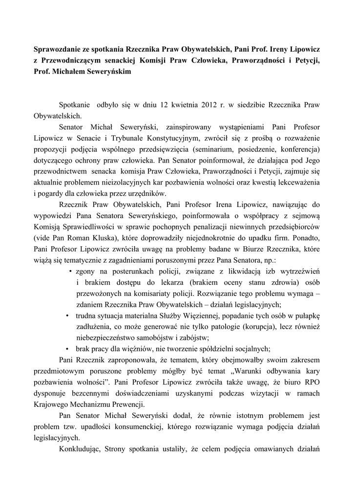 Sprawozdanie ze spotkania Rzecznika Praw Obywatelskich, Pani Prof. Ireny Lipowicz z Przewodniczącym senackiej Komisji Praw Człowieka, Praworządności i Petycji, Prof. Michałem Seweryńskim Spotkanie odbyło się w dniu 12 kwietnia 2012 r. w siedzibie Rzecznika Praw Obywatelskich. Senator Michał Seweryński, zainspirowany wystąpieniami Pani Profesor Lipowicz w Senacie i Trybunale Konstytucyjnym, zwrócił się z prośbą o rozważenie propozycji podjęcia wspólnego przedsięwzięcia (seminarium, posiedzenie, konferencja) dotyczącego ochrony praw człowieka. Pan Senator poinformował, że działająca pod Jego przewodnictwem senacka komisja Praw Człowieka, Praworządności i Petycji, zajmuje się aktualnie problemem nieizolacyjnych kar pozbawienia wolności oraz kwestią lekceważenia i pogardy dla człowieka przez urzędników. Rzecznik Praw Obywatelskich, Pani Profesor Irena Lipowicz, nawiązując do wypowiedzi Pana Senatora Seweryńskiego, poinformowała o współpracy z sejmową Komisją Sprawiedliwości w sprawie pochopnych penalizacji niewinnych przedsiębiorców (vide Pan Roman Kluska), które doprowadziły niejednokrotnie do upadku firm. Ponadto, Pani Profesor Lipowicz zwróciła uwagę na problemy badane w Biurze Rzecznika, które wiążą się tematycznie z zagadnieniami poruszonymi przez Pana Senatora, np.: • zgony na posterunkach policji, związane z likwidacją izb wytrzeźwień i brakiem dostępu do lekarza (brakiem oceny stanu zdrowia) osób przewożonych na komisariaty policji. Rozwiązanie tego problemu wymaga – zdaniem Rzecznika Praw Obywatelskich – działań legislacyjnych; • trudna sytuacja materialna Służby Więziennej, popadanie tych osób w pułapkę zadłużenia, co może generować nie tylko patologie (korupcja), lecz również niebezpieczeństwo samobójstw i zabójstw; • brak pracy dla więźniów, nie tworzenie spółdzielni socjalnych; Pani Rzecznik zaproponowała, że tematem, który obejmowałby swoim zakresem przedmiotowym poruszone problemy mógłby być temat „Warunki odbywania kary pozbawienia wolności”. Pani Profesor Lipowicz zwróciła także uwagę, że biuro RPO dysponuje bezcennymi doświadczeniami uzyskanymi podczas wizytacji w ramach Krajowego Mechanizmu Prewencji. Pan Senator Michał Seweryński dodał, że równie istotnym problemem jest problem tzw. upadłości konsumenckiej, którego rozwiązanie wymaga podjęcia działań legislacyjnych. Konkludując, Strony spotkania ustaliły, że celem podjęcia omawianych działań miałoby być zidentyfikowanie problemów, ich gradacja oraz wyłonienie takich, które wymagałyby podjęcia inicjatywy ustawodawczej. Ze strony Pani Profesor Lipowicz zostaną przekazane propozycje tematów, z których Pan Senator Seweryński dokona wyboru i podejmie działania dotyczące dalszych prac. Do uzgodnienia pozostaje także forma, w której Rzecznik Praw Obywatelskich weźmie udział w planowanym przedsięwzięciu (np. jako gość, który wygłosi referat). Drugim problem, z którym Pan Senator Seweryński wystąpił do Pani Profesor Lipowicz, to prośba o utworzenie biura terenowego RPO w Łodzi. Pani Profesor Lipowicz poinformowała, że z powodów finansowych nie ma aktualnie takiej możliwości, lecz zaproponowała inne formy współpracy, np. praktyki studenckie w biurze RPO, których uwieńczeniem mógłby być tytuł „Ambasadora Praw Człowieka” i możliwość działalności tych osób przy uniwersyteckich klinikach prawa. Podczas spotkania omówiono także inicjatywę Rzecznika Praw Obywatelskich w sprawie urzędowego języka polskiego, realizowaną we współpracy z Radą Języka Polskiego. Pan Senator został poinformowany o działaniach już podjętych i planowanych, w tym o planowanym na 30 października 2012 r., I Kongresie Języka Urzędowego. Inicjatywa ta spotkała się z bardzo pozytywną reakcją Pana Profesora Seweryńskiego, który dodatkowo zwrócił uwagę, że „walka” o przyjazny język powinna objąć także etap tworzenia prawa. Pan Senator Seweryński został zaproszony przez Panią Profesor Lipowicz na mające odbyć się w maju b.r. posiedzenie przygotowawcze z Radą Języka Polskiego. Propozycja została przyjęta. Ponadto, w związku z przewodniczeniem przez Pana Senatora Seweryńskiego Komisji Praw Człowieka, Praworządności i Petycji, Pani Profesor Lipowicz poinformowała o konferencji na temat petycji, która odbędzie się w Erfurcie i przekazała materiały jej dotyczące. Udział w tej konferencji byłby bardzo cenny - z uwagi na bogate w tym względzie doświadczenie niemieckie - dla członków tej senackiej komisji, do której obowiązków należy rozpatrywanie petycji kierowanych do Senatu i jego organów. Pan Profesor Seweryński, poinformował także o wznowieniu prac nad ustawą o petycjach i wyraził nadzieję, że Pani Rzecznik sformułuje opinię na jej temat. Na zakończenie spotkania, Pani Profesor Irena Lipowicz poinformowała o możliwości przeszkolenia w Biurze RPO, pracowników biur senatorskich. Pan Senator Seweryński, który organizuje kolejne swoje biuro oświadczył, że bardzo chętnie skorzysta z takiej propozycji. Sprawozdanie sporządziła: Dorota Bieniasz Zastępca Dyrektora Zespołu Prawa Pracy i Zabezpieczenia Społecznego