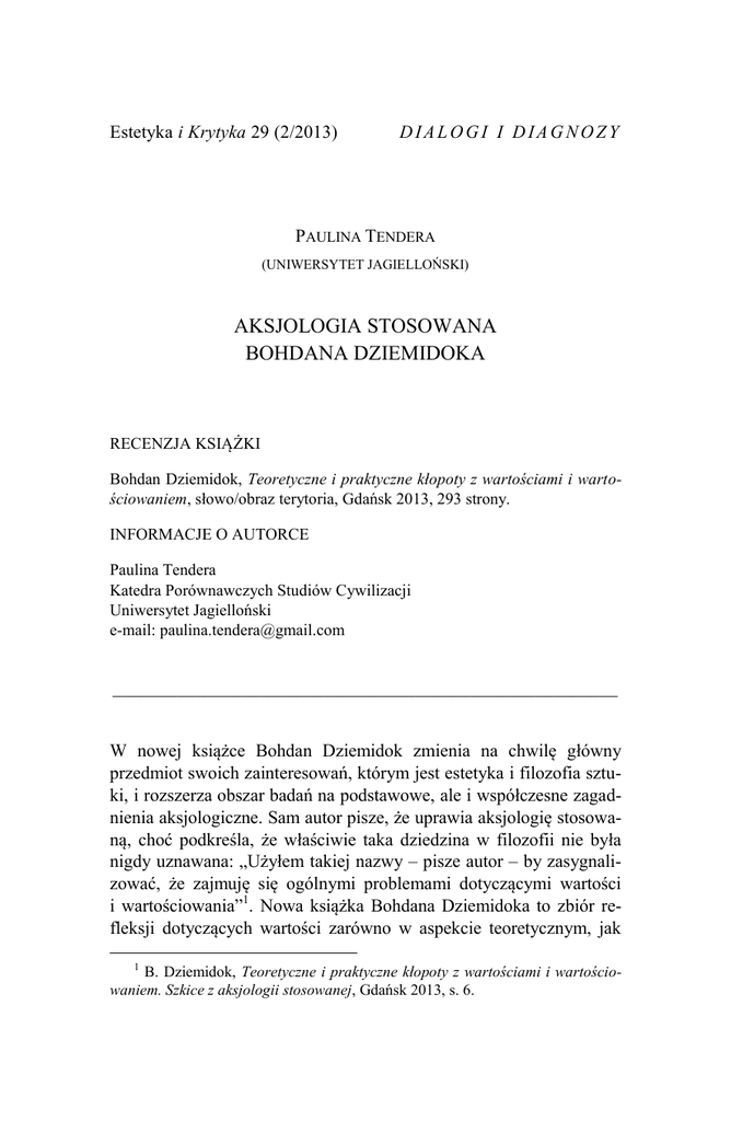 Estetyka i Krytyka 29 (2/2013) DIALOGI I DIAGNOZY PAULINA TENDERA (UNIWERSYTET JAGIELLOŃSKI) AKSJOLOGIA STOSOWANA BOHDANA DZIEMIDOKA RECENZJA KSIĄŻKI Bohdan Dziemidok, Teoretyczne i praktyczne kłopoty z wartościami i wartościowaniem, słowo/obraz terytoria, Gdańsk 2013, 293 strony. INFORMACJE O AUTORCE Paulina Tendera Katedra Porównawczych Studiów Cywilizacji Uniwersytet Jagielloński e-mail: [email protected] _______________________________________________________ W nowej książce Bohdan Dziemidok zmienia na chwilę główny przedmiot swoich zainteresowań, którym jest estetyka i filozofia sztuki, i rozszerza obszar badań na podstawowe, ale i współczesne zagadnienia aksjologiczne. Sam autor pisze, że uprawia aksjologię stosowaną, choć podkreśla, że właściwie taka dziedzina w filozofii nie była nigdy uznawana: „Użyłem takiej nazwy – pisze autor – by zasygnalizować, że zajmuję się ogólnymi problemami dotyczącymi wartości i wartościowania”1. Nowa książka Bohdana Dziemidoka to zbiór refleksji dotyczących wartości zarówno w aspekcie teoretycznym, jak 1 B. Dziemidok, Teoretyczne i praktyczne kłopoty z wartościami i wartościowaniem. Szkice z aksjologii stosowanej, Gdańsk 2013, s. 6. 232 Paulina Tendera ______________________________________________________________________________________________________________________________________________________________________________________________________ i praktycznym. Czytelnik otrzymuje niejako „aksjologię Bohdana Dziemidoka”, osadzoną w tradycji filozoficznej jego mistrza i nauczyciela – Władysława Tatarkiewicza. Dziemidok podkreśla, że impulsem do wydania książki było spostrzeżenie, iż problemy wartości, tożsamości i szczęścia są jednymi z najważniejszych problemów współczesności. Autor przywołuje tu słowa dwudziestowiecznego socjologa francuskiego Edgara Morina, który stwierdza, iż „idea szczęścia staje się w cywilizacjach indywidualistycznych ideą najważniejszą […]. Nigdy niewątpliwie w historii ludzkości nie znaliśmy tak powszechnego i tak potężnego, a zarazem tak naiwnego i ślepego wołania o szczęście”2. Dziemidok zwraca uwagę na typową dla XX i XXI wieku upartą pogoń za szczęściem i jego gloryfikację, co łączy się przede wszystkim z ogólnie pojętą kulturą popularną. Nie można jednak powiedzieć, że Dziemidok krytykuje tę kulturę, bowiem podejmuje jej zagadnienie wielopłaszczyznowo, często jej broni. Autor pisze we wstępie do swojej książki: „Problematykę wartości i wartościowania sztuki popularnej podjąłem z dwóch zasadniczych względów. Sztuka ta odgrywa coraz większą rolę w naszych czasach, niezależnie więc od czynników komercyjnych, z którymi wiąże się ten fakt, musi zaspokajać jakieś ważne potrzeby odbiorców”3. Dziemidok deklaruje wybór dwóch najważniejszych dla niego wartości, które zadecydowały o ostatecznym kształcie jego książki. Wartościami tymi są wolość i tożsamość. Pierwszą wybiera ze względu na niepodważalną rolę dla całej aksjologii i etyki, drugą zaś ze względu na specyfikę swojego własnego doświadczenie i obserwacji – tożsamość narodowa, konieczność jej określania, budowania i walki o nią jest niemal genetycznie wpisana w narodowość Polaków. Autor nie ucieka też od aktualnych problemów Polski, wypowiada się krytycznie w sprawach moralnych i etycznych dotyczących polityki, która (często w formie gorszącej i ośmieszającej) rozgrywa się na naszych oczach. Padają pytania o świadomość polityków, skutki społeczne ich zachowań i decyzji, które przecież podejmować muszą (jakże często jednak robią to niezgodnie z właściwie pojętym dobrem wspólnym i uczciwością). Swoje rozważania kończy autor wspomnieniem o Władysławie Tatarkiewiczu i jego teorii aksjologicznej. Mó2 3 E. Morin, Duch czasu (1965), [za:] B. Dziemidok, wyd. cyt., s. 6. B. Dziemidok, wyd. cyt., s. 10. Aksjologia stosowana Bohdana Dziemidoka 233 ______________________________________________________________________________________________________________________________________________________________________________________________________ wię tu o wspomnieniu, ponieważ rozdział ten oparty jest na własnych spostrzeżeniach profesora Dziemidoka, na wieloletniej współpracy i korespondencji z profesorem Tatarkiewiczem. W niniejszym krótkim opracowaniu dotyczącym książki Bohdana Dziemidoka odniosę się do dwóch wybranych rozdziałów: (VII) „Wartości i wartościowanie sztuki popularnej”4 oraz (VIII) „Aksjologia Władysława Tatarkiewicza”5. Poza tymi dwoma rozdziałami na książkę złożyły się: (I) „Teoretyczne i praktyczne kłopoty z wolnością człowieka”6, (II) „Teoretyczne i praktyczne kłopoty ze szczęściem”7, (III) „Teoretyczne i praktyczne kłopoty z tożsamością narodową”8, (IV) „Aksjologiczne aspekty starości. Czy starość może być piękna, mądra, dobra i szczęśliwa?”9, (V) „Etyczne dylematy polityków”10, (VI) „Etyka zawodowa nauczyciela akademickiego”11. Aby właściwie ocenić wartość sztuki popularnej, Bohdan Dziemidok odwołuje się do wybranych przykładów dzieł z tej dziedziny, którymi są między innymi filmy Woody’ego Allena, powieści kryminalne oraz piosenki. Autor zastrzega tu, że zarówno pojęcie sztuki popularnej, jak i poznania traktuje w swoim opracowaniu szeroko. Założenie takie, o ile nie budzi żadnych zastrzeżeń co do sztuki popularnej, może mieć – i w tekście Dziemidoka faktycznie ma – bardzo znaczące konsekwencje dla całego wywodu. Jak się bowiem okazuje, 4 Pierwodruk: tenże, Wartości i wartościowanie sztuki popularnej. Czy sens i znaczenie sztuki popularnej sprowadza się do jej wartości rozrywkowych?, „Estetyka i Krytyka” 2011, nr 21, s. 47–63; tenże, Sztuka popularna w kontekście współczesnej moralności i obyczajowości,