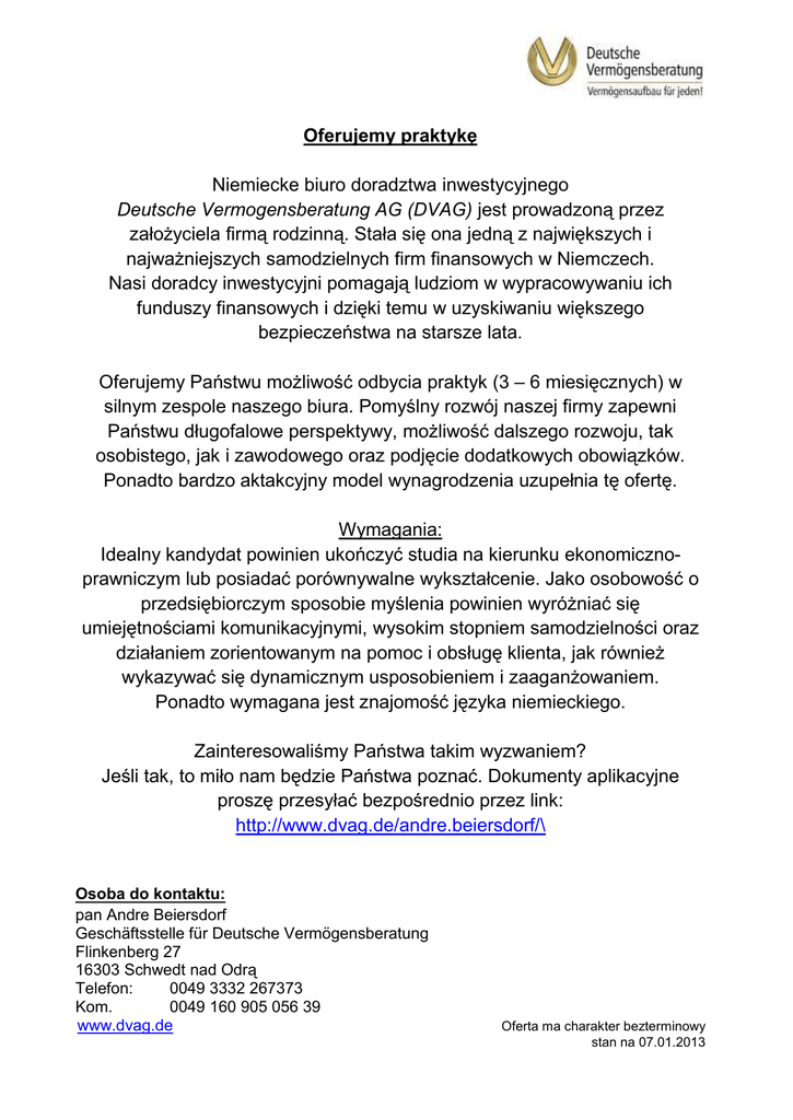 Oferujemy praktykę Niemiecke biuro doradztwa inwestycyjnego Deutsche Vermogensberatung AG (DVAG) jest prowadzoną przez założyciela firmą rodzinną. Stała się ona jedną z największych i najważniejszych samodzielnych firm finansowych w Niemczech. Nasi doradcy inwestycyjni pomagają ludziom w wypracowywaniu ich funduszy finansowych i dzięki temu w uzyskiwaniu większego bezpieczeństwa na starsze lata. Oferujemy Państwu możliwość odbycia praktyk (3 – 6 miesięcznych) w silnym zespole naszego biura. Pomyślny rozwój naszej firmy zapewni Państwu długofalowe perspektywy, możliwość dalszego rozwoju, tak osobistego, jak i zawodowego oraz podjęcie dodatkowych obowiązków. Ponadto bardzo aktakcyjny model wynagrodzenia uzupełnia tę ofertę. Wymagania: Idealny kandydat powinien ukończyć studia na kierunku ekonomicznoprawniczym lub posiadać porównywalne wykształcenie. Jako osobowość o przedsiębiorczym sposobie myślenia powinien wyróżniać się umiejętnościami komunikacyjnymi, wysokim stopniem samodzielności oraz działaniem zorientowanym na pomoc i obsługę klienta, jak również wykazywać się dynamicznym usposobieniem i zaaganżowaniem. Ponadto wymagana jest znajomość języka niemieckiego. Zainteresowaliśmy Państwa takim wyzwaniem? Jeśli tak, to miło nam będzie Państwa poznać. Dokumenty aplikacyjne proszę przesyłać bezpośrednio przez link: http://www.dvag.de/andre.beiersdorf/\ Osoba do kontaktu: pan Andre Beiersdorf Geschäftsstelle für Deutsche Vermögensberatung Flinkenberg 27 16303 Schwedt nad Odrą Telefon: 0049 3332 267373 Kom. 0049 160 905 056 39 www.dvag.de Oferta ma charakter bezterminowy stan na 07.01.2013