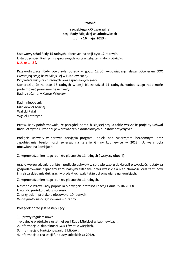 Protokół z przebiegu XXX zwyczajnej sesji Rady Miejskiej w Lubniewicach z dnia 16 maja 2013 r. Ustawowy skład Rady 15 radnych, obecnych na sesji było 12 radnych. Lista obecności Radnych i zaproszonych gości w załączeniu do protokołu. (zał. nr 1 i 2 ). Przewodnicząca Rady otworzyła obrady o godz. 12.00 wypowiadając sława „Otwieram XXX zwyczajną sesję Rady Miejskiej w Lubniewicach„ Przywitała wszystkich radnych oraz zaproszonych gości. Stwierdziła, że na stan 15 radnych w sesji bierze udział 11 radnych, wobec czego rada może podejmować prawomocne uchwały. Radny spóźniony Komar Wiesław Radni nieobecni: Kilinkiewicz Maciej Walicki Rafał Wąsiel Katarzyna Przew. Rady poinformowała, że porządek obrad dzisiejszej sesji a także wszystkie projekty uchwał Radni otrzymali. Proponuje wprowadzenie dodatkowych punktów dotyczących: Podjęcie uchwały w sprawie przyjęcia programu opieki nad zwierzętami bezdomnymi oraz zapobiegania bezdomności zwierząt na terenie Gminy Lubniewice w 2013r. Uchwała była omawiana na komisjach Za wprowadzeniem tego punktu głosowało 11 radnych ( wszyscy obecni) oraz o wprowadzenie punktu - podjęcie uchwały w sprawie wzoru deklaracji o wysokości opłaty za gospodarowanie odpadami komunalnymi składanej przez właściciela nieruchomości oraz terminów i miejsca składania deklaracji – projekt uchwały także był omawiany na komisjach. Za wprowadzeniem tego punktu głosowało 11 radnych. Następnie Przew. Rady poprosiła o przyjęcie protokołu z sesji z dnia 25.04.2013r Uwag do protokołu nie zgłoszono. Za przyjęciem protokołu głosowało 10 radnych Wstrzymało się od głosowania – 1 radny Porządek obrad jest następujący : 1. Sprawy regulaminowe -przyjęcie protokołu z ostatniej sesji Rady Miejskiej w Lubniewicach. 2. Informacja o działalności GOK i świetlic wiejskich. 3. Informacja o funkcjonowaniu Biblioteki. 4. Informacja o realizacji funduszy sołeckich za 2012r. 5 .Informacja o zgłoszonych zadaniach z zakresu funduszy sołeckich na 2013r. 6. Podjęcie uchwały w sprawie przystąpienia do opracowania strategii na lata 2014-2020r. 7. Podjęcie uchwały w sprawie: stypendiów i nagród sportowych dla zawodników osiągających wysokie wyniki sportowe we współzawodnictwie międzynarodowym lub krajowym. 8. Podjęcie uchwały w sprawie regulaminu udzielania pomocy materialnej o charakterze socjalnym dla uczniów zamieszkałych na terenie Gminy Lubniewice. 9. Podjęcie uchwały w sprawie wyrażenia woli przystąpienia do projektu pod nazwą „Przeciwdziałanie wykluczeniu cyfrowemu na terenie Gminy Lubniewice”. 10.Podjęcie uchwały w sprawie zmiany uchwały budżetowej. 11.Stanowisko w sprawie wymiaru podatku od nieruchomości od osób fizycznych. 12.Podjęcie uchwały w sprawie wymagań jakie powinien spełniać przedsiębiorca ubiegający się o uzyskanie zezwolenia na prowadzenie działalności w zakresie ochrony przed bezdomnymi zwierzętami, prowadzenia schronisk dla bezdomnych zwierząt, a także grzebowisk i spalarni zwłok zwierzęcych i ich części na terenie gminy Lubniewice. 13.Podjęcie uchwały w sprawie wyrażenia zgody na nabycie na mienie komunalne nieruchomości niezabudowanej położonej w obrębie Rogi. 14.Podjęcie uchwały w sprawie wyrażenia zgody na nabycie na mienie komunalne nieruchomości niezabudowanej położonej w obrębie Lubniewice. 15.Podjęcie uchwały w sprawie wyrażenia zgody na sprzedaż nieruchomości stanowiącej mienie komunalne. 16.Podjęcie uchwały w sprawie odpowiedzi na skargę wniesioną do Woj. Sądu Administracyjnego na uchwałę Rady Miejskiej w Lubniewicach w sprawie określenia wysokości stawek podatku od nieruchomości. 17.Informacja Burmistrza o podjętych decyzjach. 18.Interpelacje i zapytania. 19.Zakończenie obrad. Odnośnie pkt 2 porządku obrad Przew. Rady - Informację Radni otrzymali ( zał. nr 3), na komisjach były zapytania min dot. likwidacji etatu w GOK oraz wielkości kosztów poniesionych na świetlicę, prosiła o informację w tym temacie. Pani Dyrektor Małgorzata Chołuj- Pytanie dotyczące wynagrodzenia pracowników, Pani księgowa przygotowała takie porównanie i jest to wynagrodzenie osobowe, z tym, że z pominięciem ZUSu dlatego, że ZUS jest odprowadzany zbiorczo zarówno z wynagrodzeń osobowych jak i bezosobowych. W 2011 roku na wynagrodzenia osobowe Gminny Ośrodek Kultury w Lubniewicach przeznaczył 182.625,51 zł, w 2012 roku 156.934,65 złotych. Jeżeli chodzi o działalność świetlic i utrzymanie tych świetlic to w planie finansowym na 2013 rok na działalność świetlicy w Świerczowie zaplanowano 9.177 złotych. Wiejski Dom Kultury w Jarnatowie 20.383 złote, świetlica Glisno 18.835 złotych, sala wiejska Glisno 5.371 złotych. Środki w poszczególnych jednostkach zaplanowano na niezbędne wydatki przewidziane do wykonania w roku bieżącym. Wynagrodzenie wraz z pochodnymi, energia, woda, gaz, olej grzewczy, usługi telekomunikacyjne, opłaty za internet, zakup materiałów do prowadzenia zajęć w świetlicach. Natomiast szczegółowe zestawienie znajduje się jako załącznik do planu finansowego Gminnego Ośrodka Kultury, gdzie wszystkie te pozycje są wyszczególnione i kwoty do poszczególnych pozycji. Wobec braku innych pytań Przew. Rady podziękowała Pani Dyrektor za przekazaną informację. Odnośnie pkt 3 porządku obrad Przew. Rady - Informacja o funkcjonowaniu Biblioteki ( zał. nr 4). Materiały w tym temacie Radni otrzymali, temat był przedstawiany na komisjach. Poinformowała, że Pani Kierownik Biblioteki dziś nie ma, ale jak będą jakieś pytania na które nie będziemy znali odpowiedzi to udzielimy w terminie późniejszym. Wobec braku pytań przystąpiono do kolejnego punktu porządku. Odnośnie pkt.4 porządku obrad Informacja o realizacji funduszy sołeckich za 2012r ( zał. nr 5). Temat był przedstawiany na komisjach. Pytań nie zgłoszono Przew. Rady podziękowała za przygotowaną inf