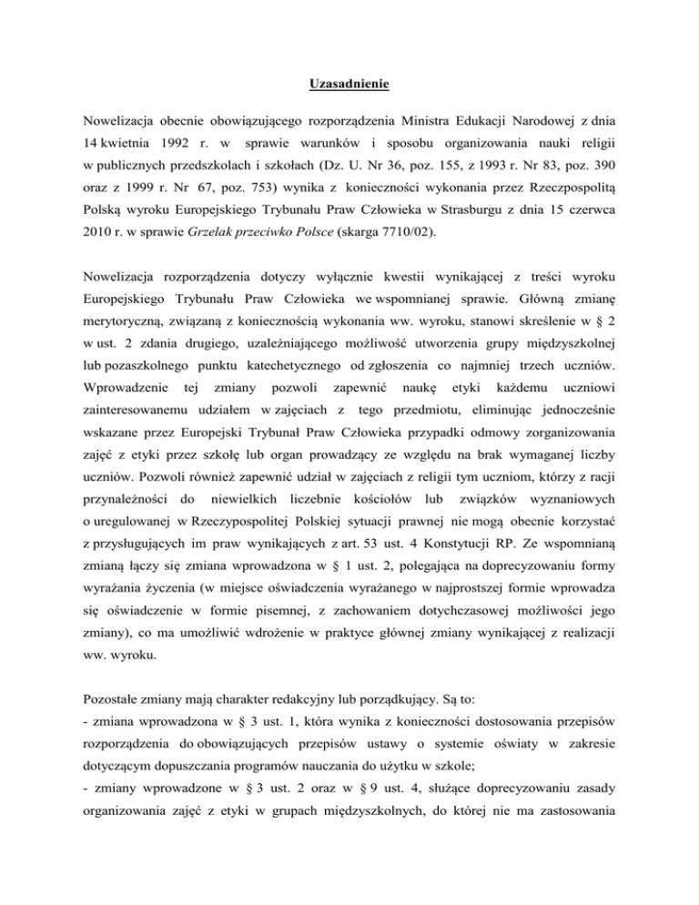 Uzasadnienie Nowelizacja obecnie obowiązującego rozporządzenia Ministra Edukacji Narodowej z dnia 14 kwietnia 1992 r. w sprawie warunków i sposobu organizowania nauki religii w publicznych przedszkolach i szkołach (Dz. U. Nr 36, poz. 155, z 1993 r. Nr 83, poz. 390 oraz z 1999 r. Nr 67, poz. 753) wynika z konieczności wykonania przez Rzeczpospolitą Polską wyroku Europejskiego Trybunału Praw Człowieka w Strasburgu z dnia 15 czerwca 2010 r. w sprawie Grzelak przeciwko Polsce (skarga 7710/02). Nowelizacja rozporządzenia dotyczy wyłącznie kwestii wynikającej z treści wyroku Europejskiego Trybunału Praw Człowieka we wspomnianej sprawie. Główną zmianę merytoryczną, związaną z koniecznością wykonania ww. wyroku, stanowi skreślenie w § 2 w ust. 2 zdania drugiego, uzależniającego możliwość utworzenia grupy międzyszkolnej lub pozaszkolnego punktu katechetycznego od zgłoszenia co najmniej trzech uczniów. Wprowadzenie tej zmiany pozwoli zapewnić zainteresowanemu udziałem w zajęciach z naukę etyki każdemu uczniowi tego przedmiotu, eliminując jednocześnie wskazane przez Europejski Trybunał Praw Człowieka przypadki odmowy zorganizowania zajęć z etyki przez szkołę lub organ prowadzący ze względu na brak wymaganej liczby uczniów. Pozwoli również zapewnić udział w zajęciach z religii tym uczniom, którzy z racji przynależności do niewielkich liczebnie kościołów lub związków wyznaniowych o uregulowanej w Rzeczypospolitej Polskiej sytuacji prawnej nie mogą obecnie korzystać z przysługujących im praw wynikających z art. 53 ust. 4 Konstytucji RP. Ze wspomnianą zmianą łączy się zmiana wprowadzona w § 1 ust. 2, polegająca na doprecyzowaniu formy wyrażania życzenia (w miejsce oświadczenia wyrażanego w najprostszej formie wprowadza się oświadczenie w formie pisemnej, z zachowaniem dotychczasowej możliwości jego zmiany), co ma umożliwić wdrożenie w praktyce głównej zmiany wynikającej z realizacji ww. wyroku. Pozostałe zmiany mają charakter redakcyjny lub porządkujący. Są to: - zmiana wprowadzona w § 3 ust. 1, która wynika z konieczności dostosowania przepisów rozporządzenia do obowiązujących przepisów ustawy o systemie oświaty w zakresie dotyczącym dopuszczania programów nauczania do użytku w szkole; - zmiany wprowadzone w § 3 ust. 2 oraz w § 9 ust. 4, służące doprecyzowaniu zasady organizowania zajęć z etyki w grupach międzyszkolnych, do której nie ma zastosowania przepis wymagający porozumienia organu prowadzącego z właściwymi władzami zwierzchnimi kościoła lub związku wyznaniowego, jaki obowiązuje w przypadku organizowania zajęć z religii w grupie międzyszkolnej. Zmiany wprowadzane niniejszym rozporządzeniem będą obowiązywać od początku nowego roku szkolnego tj. od dnia 1 września 2014 r. W związku z tym, oświadczenie, o którym mowa w § 2 ust. 2 rozporządzenia będzie składane w przypadku osób, które rozpoczynają naukę w danej szkole lub, które chciałyby zacząć uczęszczać na zajęcia religii lub etyki. Projekt rozporządzenia został udostępniony w Biuletynie Informacji Publicznej Ministerstwa Edukacji Narodowej, zgodnie z art. 5 ustawy z dnia 7 lipca 2005 r. o działalności lobbingowej w procesie stanowienia prawa (Dz. U. Nr 169, poz. 1414, z późn. zm.) oraz w Biuletynie Informacji Publicznej Rządowego Centrum Legislacji w zakładce Rządowy Proces Legislacyjny, zgodnie z § 52 ust. 1 uchwały nr 190 Rady Ministrów z dnia 29 października 2013 r. – Regulamin pracy Rady Ministrów (M. P. poz. 979). Żaden podmiot nie zgłosił zainteresowania pracami nad projektem rozporządzenia. Rozporządzenie nie zawiera przepisów technicznych w rozumieniu rozporządzenia Rady Ministrów z dnia 23 grudnia 2002 r. w sprawie sposobu funkcjonowania krajowego systemu notyfikacji norm i aktów prawnych (Dz. U. Nr 239, poz. 2039 oraz z 2004 r. Nr 65, poz. 597) i w związku z tym nie podlega notyfikacji w rozumieniu tego rozporządzenia. Przedmiot regulacji nie jest objęty zakresem prawa Unii Europejskiej.