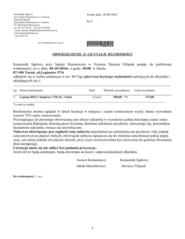 Komornik Sądowy przy Sądzie Rejonowym w Toruniu Dariusz Filipiak Kancelaria Komornicza w Toruniu 87-100 Toruń Ślusarska 4 tel. 56 475 44 82 Fax 56 4754585 e-mail: [email protected] www.komorniktorun.eu Km 2075/14 #AF *0020000389432*/0419/ Toruń, dnia 30-08-2016 Sz P . *0020000389432* OBWIESZCZENIE O LICYTACJI RUCHOMOŚCI Komornik Sądowy przy Sądzie Rejonowym w Toruniu Dariusz Filipiak podaje do publicznej wiadomości, że w dniu 04-10-2016r. o godz. 10:00 w lokalu: 87-100 Toruń, ul.Legionów 57/6 odbędzie się w trybie ustalonym w art. 867 kpc pierwsza licytacja ruchomości należących do dłużnika i składających się z: ____________________________________________________________________________________________________ Lp. Nazwa ruchomości Ilość Wartość szacunkowa Cena wywołania _____________________________________________________________________________________________________ 1. Laptop DELL Inspiron 1720 ok. 7-letni 1 [szt.] 500,00 **) 375,00 _______________________________________________________________________________________________________________________ *) cena za sztukę Ruchomości można oglądać w dzień licytacji w miejscu i czasie oznaczonym wyżej. Suma wywołania wynosi 75% sumy oszacowania. Przystępujący do przetargu obowiazany jest złożyć rękojmię w wysokości jednej dziesiątej części sumy oszacowania.Rękojmię złożoną przez licytanta, któremu udzielono przybicia, zatrzymuje się; pozostałym licytantom rejkojmię zwraca się niezwłocznie. Nabywca obowiązany jest zapłacić cenę nabycia natychmiast po udzieleniu mu przybicia. Gdy jednak cena przewyższa pięćset złotych, obowiązek nabycia ogranicza się do złożenia natychmiast jednej piątej ceny, nie mniej jednak niż pięćset złotych, przy czym reszta powinna być uiszczona do godziny dwunastej dnia następnego. Licytacja może się nie odbyć bez podania przyczyny. Jeżeli drzwi będą zamknięte, będą otwierane na koszt i odpowiedzialność dłużnika. Asesor Komorniczy Komornik Sądowy Jakub Marchlewicz Dariusz Filipiak Do wiadomości: 1. a/a 1