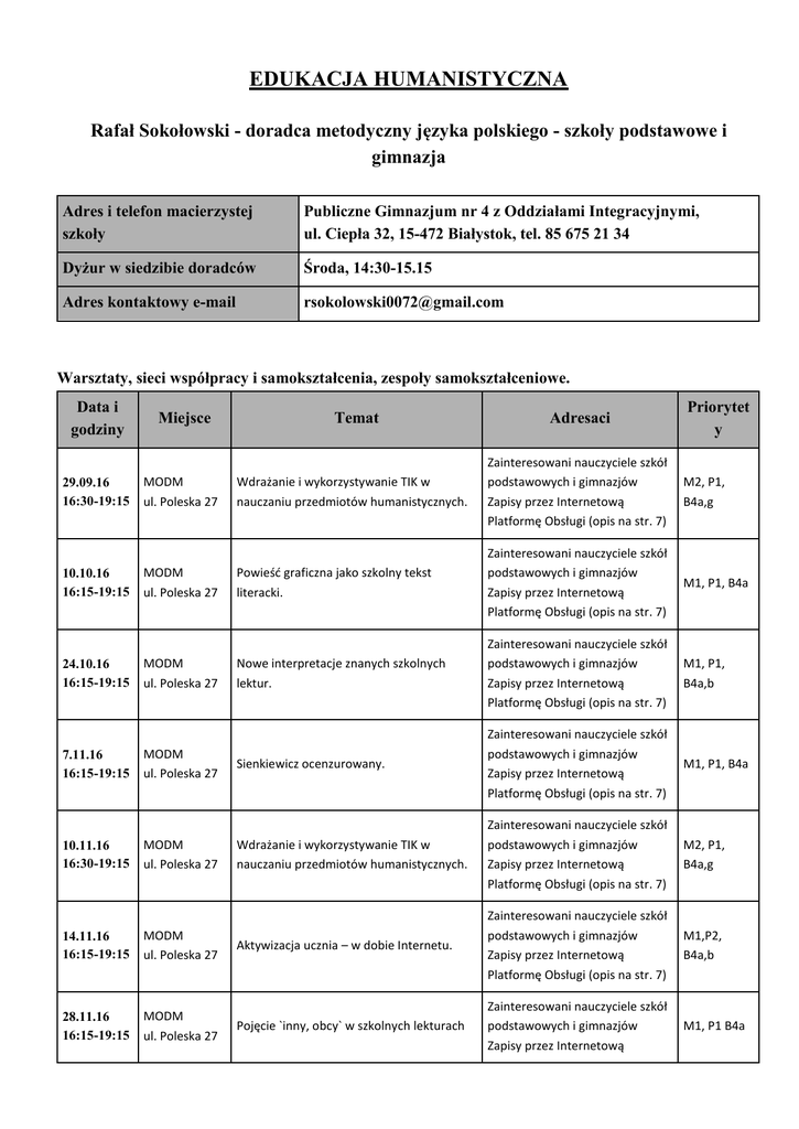 EDUKACJA HUMANISTYCZNA Rafał Sokołowski - doradca metodyczny języka polskiego - szkoły podstawowe i gimnazja Adres i telefon macierzystej szkoły Publiczne Gimnazjum nr 4 z Oddziałami Integracyjnymi, ul. Ciepła 32, 15-472 Białystok, tel. 85 675 21 34 Dyżur w siedzibie doradców Środa, 14:30-15.15 Adres kontaktowy e-mail [email protected] Warsztaty, sieci współpracy i samokształcenia, zespoły samokształceniowe. Data i godziny Miejsce 29.09.16 16:30-19:15 MODM ul. Poleska 27 10.10.16 16:15-19:15 24.10.16 16:15-19:15 7.11.16 16:15-19:15 10.11.16 16:30-19:15 MODM ul. Poleska 27 MODM ul. Poleska 27 MODM ul. Poleska 27 MODM ul. Poleska 27 14.11.16 16:15-19:15 MODM ul. Poleska 27 28.11.16 16:15-19:15 MODM ul. Poleska 27 Temat Adresaci Priorytet y Wdrażanie i wykorzystywanie TIK w nauczaniu przedmiotów humanistycznych. Zainteresowani nauczyciele szkół podstawowych i gimnazjów Zapisy przez Internetową Platformę Obsługi (opis na str. 7) M2, P1, B4a,g Powieść graficzna jako szkolny tekst literacki. Zainteresowani nauczyciele szkół podstawowych i gimnazjów Zapisy przez Internetową Platformę Obsługi (opis na str. 7) M1, P1, B4a Nowe interpretacje znanych szkolnych lektur. Zainteresowani nauczyciele szkół podstawowych i gimnazjów Zapisy przez Internetową Platformę Obsługi (opis na str. 7) M1, P1, B4a,b Sienkiewicz ocenzurowany. Zainteresowani nauczyciele szkół podstawowych i gimnazjów Zapisy przez Internetową Platformę Obsługi (opis na str. 7) M1, P1, B4a Wdrażanie i wykorzystywanie TIK w nauczaniu przedmiotów humanistycznych. Zainteresowani nauczyciele szkół podstawowych i gimnazjów Zapisy przez Internetową Platformę Obsługi (opis na str. 7) M2, P1, B4a,g Aktywizacja ucznia – w dobie Internetu. Zainteresowani nauczyciele szkół podstawowych i gimnazjów Zapisy przez Internetową Platformę Obsługi (opis na str. 7) M1,P2, B4a,b Pojęcie `inny, obcy` w szkolnych lekturach Zainteresowani nauczyciele szkół podstawowych i gimnazjów Zapisy przez Internetową M1, P1 B4a Data i godziny Miejsce Temat Adresaci Priorytet y Platformę Obsługi (opis na str. 7) 12.12.16 16:15-19:15 MODM ul. Poleska 27 Kultura języka - frazeologizmy Zainteresowani nauczyciele szkół podstawowych i gimnazjów Zapisy przez Internetową Platformę Obsługi (opis na str. 7) M1, P1, B4a M2, P1, B4a,g 15.12.16 16:30-19:15 MODM ul. Poleska 27 Wdrażanie i wykorzystywanie TIK w nauczaniu przedmiotów humanistycznych. Zainteresowani nauczyciele szkół podstawowych i gimnazjów Zapisy przez Internetową Platformę Obsługi (opis na str. 7) 19.12.16 16:15-19:15 MODM ul. Poleska 27 Teksty terapeutyczne – interpretuję i tworzę Zainteresowani nauczyciele szkół podstawowych i gimnazjów Zapisy przez Internetową Platformę Obsługi (opis na str. 7) M3, P3, B4b,c 16.01.17 16:15-19:15 MODM ul. Poleska 27 Od myśli do tekstu – ćwiczenia praktyczne Zainteresowani nauczyciele szkół podstawowych i gimnazjów Zapisy przez Internetową Platformę Obsługi (opis na str. 7) M1, P1, B4a,b Lekcje otwarte Data i godziny Miejsce 21.11.16 9:50-10:35 Publiczne Gimnazjum nr 4, ul. Ciepła 32, Białystok 12.12.16 9:50-10:35 Publiczne Gimnazjum nr 4, ul. Ciepła 32, Białystok Temat Adresaci Priorytety Bieżący temat lekcyjny Zainteresowani nauczyciele szkół podstawowych i gimnazjów Zapisy przez Internetową Platformę Obsługi (opis na str. 7) M1, P1 Bieżący temat lekcyjny Zainteresowani nauczyciele szkół podstawowych i gimnazjów Zapisy przez Internetową Platformę Obsługi (opis na str. 7) M1, P1