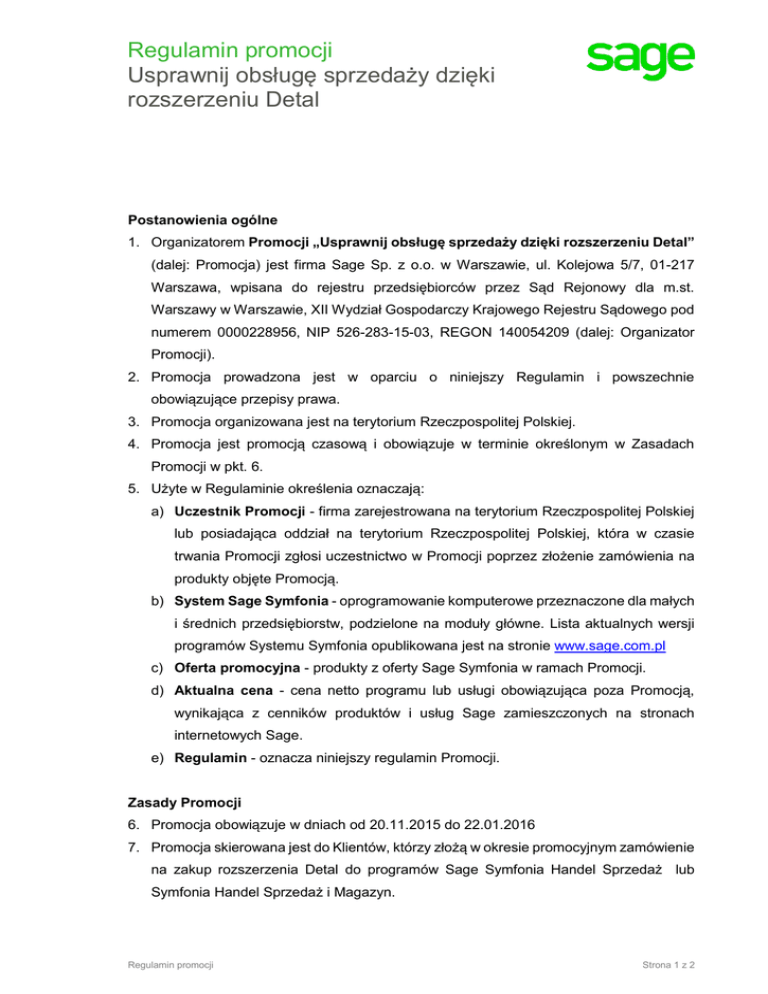 Regulamin promocji Usprawnij obsługę sprzedaży dzięki rozszerzeniu Detal Postanowienia ogólne 1. Organizatorem Promocji „Usprawnij obsługę sprzedaży dzięki rozszerzeniu Detal” (dalej: Promocja) jest firma Sage Sp. z o.o. w Warszawie, ul. Kolejowa 5/7, 01-217 Warszawa, wpisana do rejestru przedsiębiorców przez Sąd Rejonowy dla m.st. Warszawy w Warszawie, XII Wydział Gospodarczy Krajowego Rejestru Sądowego pod numerem 0000228956, NIP 526-283-15-03, REGON 140054209 (dalej: Organizator Promocji). 2. Promocja prowadzona jest w oparciu o niniejszy Regulamin i powszechnie obowiązujące przepisy prawa. 3. Promocja organizowana jest na terytorium Rzeczpospolitej Polskiej. 4. Promocja jest promocją czasową i obowiązuje w terminie określonym w Zasadach Promocji w pkt. 6. 5. Użyte w Regulaminie określenia oznaczają: a) Uczestnik Promocji - firma zarejestrowana na terytorium Rzeczpospolitej Polskiej lub posiadająca oddział na terytorium Rzeczpospolitej Polskiej, która w czasie trwania Promocji zgłosi uczestnictwo w Promocji poprzez złożenie zamówienia na produkty objęte Promocją. b) System Sage Symfonia - oprogramowanie komputerowe przeznaczone dla małych i średnich przedsiębiorstw, podzielone na moduły główne. Lista aktualnych wersji programów Systemu Symfonia opublikowana jest na stronie www.sage.com.pl c) Oferta promocyjna - produkty z oferty Sage Symfonia w ramach Promocji. d) Aktualna cena - cena netto programu lub usługi obowiązująca poza Promocją, wynikająca z cenników produktów i usług Sage zamieszczonych na stronach internetowych Sage. e) Regulamin - oznacza niniejszy regulamin Promocji. Zasady Promocji 6. Promocja obowiązuje w dniach od 20.11.2015 do 22.01.2016 7. Promocja skierowana jest do Klientów, którzy złożą w okresie promocyjnym zamówienie na zakup rozszerzenia Detal do programów Sage Symfonia Handel Sprzedaż lub Symfonia Handel Sprzedaż i Magazyn. Regulamin promocji Strona 1 z 2 8. Promocja polega na udzieleniu specjalnej ceny na zakup rozszerzenia Detal do programów Sage Symfonia Handel Sprzedaż i Magazyn oraz Sage Symfonia Handel Sprzedaż. Cena specjalna na sprzedaż rozszerzenia:: dla zakupu w licencji: 590 zł netto dla zakupu w subskrypcji rocznej: 340 zł netto dla zakupu w subskrypcji 3-letniej: 930 zł netto 9. Cena specjalna dotyczy zamówień złożonych do organizatora promocji do dnia 22.01.2016. Postanowienia końcowe 10. Skorzystanie z Promocji oznacza akceptację zasad określonych w niniejszym Regulaminie. 11. Zasady licencjonowania programów określa każdorazowo umowa licencji. 12. Oferty promocyjne nie łączą się z innymi promocjami i rabatami. 13. Zasady świadczenia Usług abonamentowych Sage zawarte są w odpowiednich regulaminach. Regulaminy świadczenia usług dostępne są odpowiednio na stronie http://www.sage.com.pl/uslugi/regulaminy 14. Z Promocji mogą skorzystać Klienci, którzy w Okresie promocyjnym złożą u Organizatora lub sieci Partnerów Sage (lista Partnerów Sage opublikowana jest na stronie internetowej http://www.sage.com.pl/gdzie-kupic) zamówienie na zasadach objętych Promocją. 15. Organizator zastrzega sobie prawo wykluczenia Uczestnika z Promocji ze skutkiem natychmiastowym, w przypadku stwierdzenia naruszenia postanowienia Regulaminu, mogącego mieć wpływ na przyznanie rabatu. W takim wypadku Uczestnik promocji będzie zobowiązany do zwrotu przyznanego rabatu. 16. Niniejszy regulamin jest jedynym dokumentem określającym zasady Promocji. 17. Materiały reklamowe mają jedynie charakter promocyjno-informacyjny. 18. Aktualnie obowiązujący cennik Sage dostępny jest na stronie www.sage.com.pl 19. W sprawach nieuregulowanych niniejszym Regulaminem stosuje się odpowiednio przepisy Kodeksu Cywilnego. 20. Wszelkie spory mogące wyniknąć w związku z realizacją Promocji będą rozstrzygane przez sąd właściwy miejscowo dla siedziby Organizatora Promocji. 21. Organizator promocji zastrzega sobie prawo do dokonania zmian w niniejszym Regulaminie lub zawieszenia promocji w każdym czasie bez podania przyczyny. Regulamin promocji Strona 2 z 2