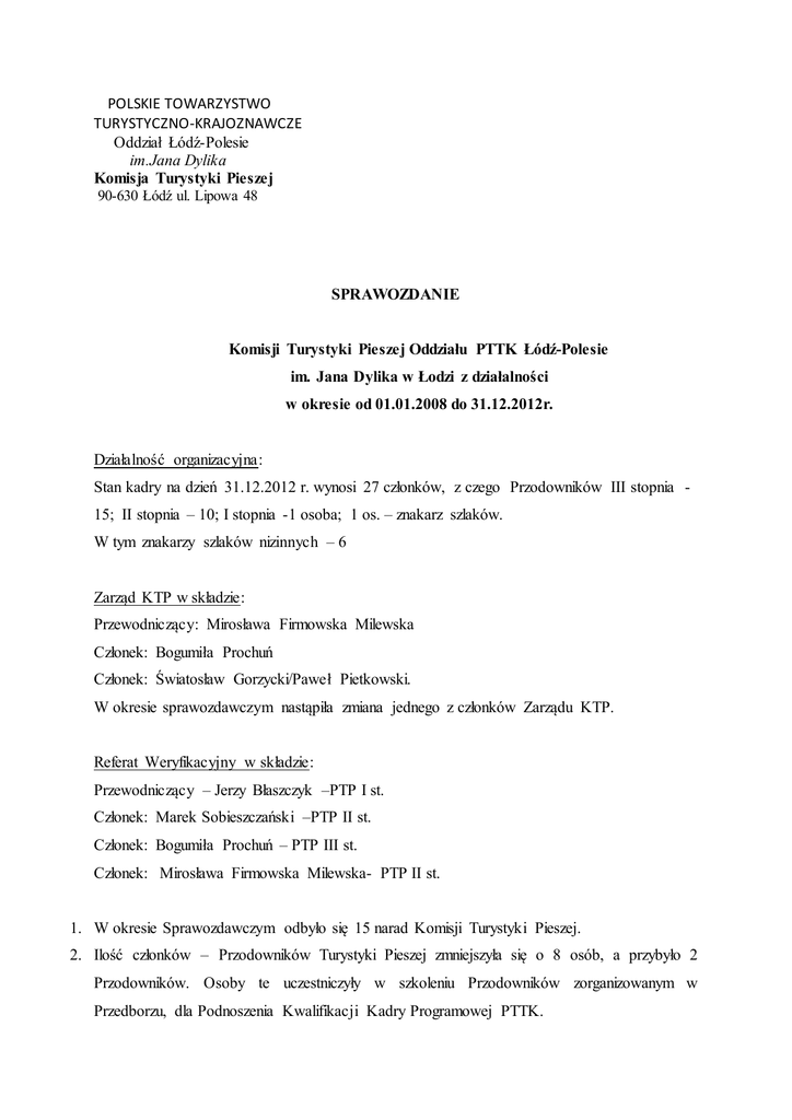 POLSKIE TOWARZYSTWO TURYSTYCZNO-KRAJOZNAWCZE Oddział Łódź-Polesie im.Jana Dylika Komisja Turystyki Pieszej 90-630 Łódź ul. Lipowa 48 SPRAWOZDANIE Komisji Turystyki Pieszej Oddziału PTTK Łódź-Polesie im. Jana Dylika w Łodzi z działalności w okresie od 01.01.2008 do 31.12.2012r. Działalność organizacyjna: Stan kadry na dzień 31.12.2012 r. wynosi 27 członków, z czego Przodowników III stopnia 15; II stopnia – 10; I stopnia -1 osoba; 1 os. – znakarz szlaków. W tym znakarzy szlaków nizinnych – 6 Zarząd KTP w składzie: Przewodniczący: Mirosława Firmowska Milewska Członek: Bogumiła Prochuń Członek: Światosław Gorzycki/Paweł Pietkowski. W okresie sprawozdawczym nastąpiła zmiana jednego z członków Zarządu KTP. Referat Weryfikacyjny w składzie: Przewodniczący – Jerzy Błaszczyk –PTP I st. Członek: Marek Sobieszczański –PTP II st. Członek: Bogumiła Prochuń – PTP III st. Członek: Mirosława Firmowska Milewska- PTP II st. 1. W okresie Sprawozdawczym odbyło się 15 narad Komisji Turystyki Pieszej. 2. Ilość członków – Przodowników Turystyki Pieszej zmniejszyła się o 8 osób, a przybyło 2 Przodowników. Osoby te uczestniczyły w szkoleniu Przodowników zorganizowanym w Przedborzu, dla Podnoszenia Kwalifikacji Kadry Programowej PTTK. 3. Od 2010 roku KTP jest organizatorem dorocznego Rajdu dla dzieci młodszych „MIKRUS”. Jest to kontynuacja imprezy organizowanej wcześniej przez rozwiązany Klub Turystyki Pieszej „Piechur”. Odbyły się już 32 takie rajdy, w ostatnich 3 rajdach wzięło udział 347 dzieci. 4. Udział Przodowników w Ogólnopolskim Wysokokwalifikowanym Rajdzie Pieszym to 2 osoby: Rafał Sobytkowski i Andrzej Żebrowski. 5. W Ogólnopolskich Zlotach Przodowników Turystyki Pieszej, co roku brała udział 1 osoba – Mirosława Firmowska Milewska. 6. Rozszerzenia uprawnień przodownickich na inne regiony dokonały 3 osoby: Mirosława Grzelak, Rafał Sobytkowski i Mirosława Firmowska Milewska. W minionym okresie Komisja brała udział w naradach programowych i organizacyjnych Zarządu Oddziału PTTK Łódź-Polesie. Przodownicy przygotowują trasy i prowadzą wycieczki niedzielne w Klubie Turystów Pieszych STONOGA, (1 lub 2 w niedzielę), jak też trasy dla rajdów młodzieżowych. Również przygotowanie tras pieszych na ŚWIATOWY DZIEŃ TURYSTYKI we współpracy z Towarzystwem Krzewienia Kultury Fizycznej w Łodzi. W mienionym okresie odbyło się 27 takich rajdów. Lata 2008 2009 2010 2011 2012 Razem Ilość wycieczek niedzielnych w roku 87 90 84 76 67 404 Rajdy młodzieżowetrasy 13 13 13 13 12 64 Liczba uczestników Razem wycieczek 100 103 97 89 79 468 1902 2001 2282 1905 2593 10 683 Liczba uczestników rajdów młodzieżowych 762 961 792 617 682 3814 Ogółem uczestnicy 2664 2962 3074 2522 3275 14 497 2 4 1 2 9 2 1 3 Mała brązowa Mała srebrna Mała złota 18 15 27 18 2 80 4 12 15 15 4 50 2 2 1 5 2 1 3 Za wytrwałość w turystyce pieszej Złota 2008 2009 2010 2011 2012 Razem Srebrna Lata 7-milowe Butki Popularna W okresie sprawozdawczym Referat Weryfikacyjny dokonał weryfikacji Odznak Turystyki Pieszej: Dla Najwytrwalszych Ogółem 60-lecie PTTK Jubileuszowa 1 1 2 2 2 8 1 1 27 32 47 43 10 159 KTP Podkomisja ds. Szlaków w składzie: Przewodniczący: Mirosława Firmowska Milewska Członkowie: – Marek Sobieszczański, Anna Dudaczyk, Krzysztof Góra, Wanda Fabijańczyk, Rafał Sobytkowski. Wykaz Szlaków pieszych przydzielonych przez ZG PTTK pod opiekę Grupy Znakarskiej ŁD-7: Grupa Kod, nr, kolor Początek szlaku Koniec szlaku Długość znakarska ŁD-4543-n Warta muzeum Burzenin PKS ŁD-7 MFM 54 ŁD-4541-c Warta muzeum Wojków PKS ŁD-7 MFM 50 ŁD-4542-y Warta muzeum Otok PKP ŁD-7 MFM 39 ŁD-4544-z Warta muzeum Sieradz PKP ŁD-7 MFM 34,3 ŁD-4535-n Poddębice PKP Kłudna PKP ŁD-7 MFM 16 RAZEM 193,3 km Znakarze nizinnych szlaków pieszych wyznaczyli i odnowili znaki na długości 70 km. Dotyczy to szlaków: ŁD-4543-n, Szlak Walk nad Wartą 1939r.- 54 km w 2010 roku i ŁD-4535-n Szlak im. Marii Konopnickiej - 10 km w 2011 roku. Przewodniczący Komisji Turystyki Pieszej Mirosława Firmowska-Milewska