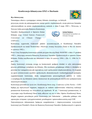 Konferencja klimatyczna ONZ w Durbanie Rys historyczny Narastająca obawa o postępujące zmiany klimatu ziemskiego, za których przyczynę uważa się antropogeniczne emisje gazów cieplarnianych, swoje pierwsze formalne odzwierciedlenie na arenie międzynarodowej znalazła w dniu 9 maja 1992 r. Wówczas, w Nowym Jorku powstała Ramowa Konwencja Narodów Zjednoczonych w Sprawie Zmian Klimatu (ang. United Nations Framework Convention on Climate Change – UNFCCC). Konwencję sygnowała większość państw uczestniczących w Konferencji Narodów Zjednoczonych na temat Środowiska i Rozwoju zwanej Szczytem Ziemi w Rio de Janeiro w czerwcu 1992 r. Przez Unię Europejską konwencja została przyjęta decyzją Rady 94/69/WE z dnia 15 grudnia 1993 r., dotyczącą zawarcia Ramowej Konwencji Narodów Zjednoczonych w sprawie Zmian Klimatu. Polska ratyfikowała ten dokument w dniu 16 czerwca 1994 r. (Dz. U. 1996 Nr 53, poz. 238). Zapisy konwencji zwracają uwagę na konieczność podjęcia działań w celu zatrzymania procesu globalnego ocieplania się klimatu. Dla uzyskania pożądanego efektu w działania te powinna być zaangażowana jak największą część społeczności międzynarodowej. Ze względu na spore zróżnicowanie zasobów społecznych, ekonomicznych i technologicznych pomiędzy sygnatariuszami konwencji, skalę zaangażowania poszczególnych państw w walce z ocieplającym się klimatem należy dostosować do potencjalnych możliwości podejmowania stosownych inicjatyw. Konwencja powołała do życia tzw. Konferencję Stron (ang. Conference of the Parties - COP) będącą jej najwyższym organem, mającym za zadanie nadzorowanie właściwej realizacji postanowień Konwencji we wszystkich jej aspektach. W art. 7 konwencji postanowione, iż zwyczajne sesje Konferencji Stron będą odbywać się raz w roku. Oprócz Konferencji Stron, drugim organem powołanym przez Konwencję jest Sekretariat – jednostka pełniąca role operacyjne związane z przygotowaniami, przebiegiem i sprawozdawczością sesji COP. Najważniejszym dokumentem będącym uzupełnieniem i doprecyzowaniem wytycznych konwencji jest Protokół z Kioto do Ramowej Konwencji Narodów Zjednoczonych w sprawie zmian klimatu. Protokół został sporządzony w dniu 11 grudnia 1997 r. w celu dążenia zgodnie z zasadami zrównoważonego rozwoju - do realizacji najważniejszych zadań konwencji. Protokół zobowiązuje Strony konwencji do działań mających na celu ograniczenie emisji gazów cieplarnianych. Protokół z Kioto określa limity redukcji emisji dwutlenku węgla przez poszczególne państwa. Część krajów nie przystąpiła do protokołu, wśród nich są potęgi gospodarcze o największym udziale w światowej emisji CO2, takie jak Chiny i USA. Celem działań ograniczających emisję gazów cieplarnianych jest zahamowanie wzrostu średniej temperatury na powierzchni Ziemi. Chodzi o niepodwyższenie temperatury ponad 2°C powyżej średniej z okresu przed rozwojem przemysłu. Cel konferencji klimatycznej w Durbanie Jako cel konferencji klimatycznej ONZ w Durbanie Afryki) (Republika określono Południowej podjęcie decyzji o przyszłości ochrony klimatu na świecie. Od jej wyników uzależniano dalsze losy Protokołu z Kioto, którego okres zobowiązań kończy się w roku 2012, a tym samym wygasają zobowiązania krajów rozwiniętych do redukcji emisji gazów cieplarnianych. Unia Europejska jest światowym liderem w polityce ochrony klimatu – głównie dzięki realizacji pakietu energetyczno – klimatycznego i dlatego niezwykle ważne jest, aby inne kraje świata podjęły równie ambitne zobowiązania w tej dziedzinie. Ochrona klimatu ma bowiem sens tylko wtedy, kiedy jest prowadzona globalnie. Za główne zadania służące realizacji celu konferencji w Durbanie uznano: 1. Ustalenie planu dojścia do nowego globalnego porozumienia w sprawie ochrony klimatu. 2. Osiągnięcie porozumienia w sprawie przyjęcia drugiego okresu zobowiązań Protokołu z Kioto. 3. Osiągnięcie postępu we wdrażaniu decyzji podjętych podczas Konferencji Klimatycznej w Cancun (Meksyk), dotyczących mierzenia, raportowania i weryfikacji emisji oraz w sprawach instytucjonalnych. Wyniki konferencji w Durbanie W siedemnastej Konferencji Stron Konwencji Klimatycznej w Durbanie, uczestniczyło ponad 190 państw. Obrady konferencji zostały zaplanowane na dwa tygodnie: od 28 listopada do 9 grudnia 2011 r. W zaplanowanym terminie stronom konferencji nie udało się osiągnąć porozumienia – w związku z czym spotkanie przedłużono do niedzieli - 11 grudnia 2011 r. Dotychczas nie zdarzyło się, aby negocjacje trwały tak długo po planowanym zamknięciu konferencji klimatycznej. Wynikiem konferencji klimatycznej w Durbanie jest przyjęcie pakietu rozwiązań prowadzących do nowego porozumienia klimatycznego. Pakiet ma status dokumentu prawnie obowiązującego wszystkie państwa. Pakiet zawiera mapę drogową dojścia w 2015 r. do nowego porozumienia, które ma obowiązywać po 2020 r., a także deklarację prowadzącą do przedłużenia obowiązywania protokołu z Kioto na drugi okres rozliczeniowy. Umowa klimatyczna z Kioto obowiązuje do końca 2012 r. Unia Europejska uzależniła swoje poparcie dla przedłużenia obowiązywania protokołu z Kioto na kolejny okres od przyjęcia przez szczyt „mapy drogowej” - ścieżki dojścia do nowego globalnego porozumienia klimatycznego po 2020 r. W pakiecie przyjętym w Durbanie znalazł się też szereg zapisów o ochronie klimatu Ziemi i sposobów wsparcia inwestycji chroniących środowisko w krajach najbiedniejszych i najbardziej narażonych na zmiany klimatu. Jak podano w komunikacie resortu środowiska, wynikiem konferencji w Durbanie jest ponadto ustanowienie ram instytucjonalnych i struktury tzw. zielonego funduszu klimatycznego (ang. Green Climate Fund). Fundusz ma być zasilony w przyszłości kwotą 100 mld dolarów. Ze środków Funduszu będą finansowane projekty dotyc