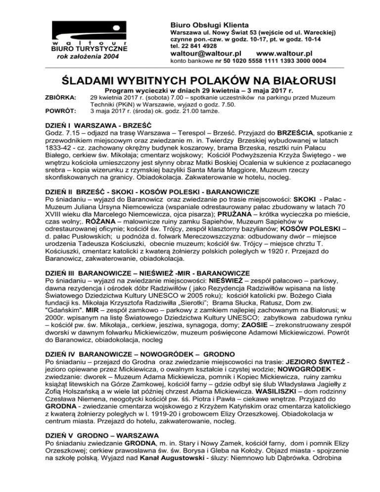 Biuro Obsługi Klienta BIURO TURYSTYCZNE rok założenia 2004 Warszawa ul. Nowy Świat 53 (wejście od ul. Wareckiej) czynne pon.-czw. w godz. 10-17, pt. w godz. 10-14 tel. 22 841 4928 [email protected] www.waltour.pl konto bankowe nr 50 1020 5558 1111 1393 3000 0004 ______________________________________________________________________________ ŚLADAMI WYBITNYCH POLAKÓW NA BIAŁORUSI Program wycieczki w dniach 29 kwietnia – 3 maja 2017 r. ZBIÓRKA: POWRÓT: 29 kwietnia 2017 r. (sobota) 7.00 – spotkanie uczestników na parkingu przed Muzeum Techniki (PKiN) w Warszawie, wyjazd o godz. 7.50. 3 maja 2017 r. (środa) ok. godz. 21.00 tamże. DZIEŃ I WARSZAWA - BRZEŚĆ Godz. 7.15 – odjazd na trasę Warszawa – Terespol – Brześć. Przyjazd do BRZEŚCIA, spotkanie z przewodnikiem miejscowym oraz zwiedzanie m. in. Twierdzy Brzeskiej wybudowanej w latach 1833-42 - cz. zachowany okrężny budynek koszarowy, brama Brzeska, resztki ruin Pałacu Białego, cerkiew św. Mikołaja; cmentarz wojskowy; Kościół Podwyższenia Krzyża Świętego - we wnętrzu kościoła umieszczony jest słynny obraz Matki Boskiej Ocalenia w sukience z pozłacanego srebra – kopia wizerunku z rzymskiej bazyliki Santa Maria Maggiore, Muzeum rzeczy skonfiskowanych na granicy. Obiadokolacja. Zakwaterowanie w hotelu, nocleg. DZIEŃ II BRZEŚĆ - SKOKI - KOSÓW POLESKI - BARANOWICZE Po śniadaniu – wyjazd do Baranowicz oraz zwiedzanie po trasie miejscowości: SKOKI - Pałac Muzeum Juliana Ursyna Niemcewicza (wspaniale odrestaurowany pałac zbudowany w latach 70 XVIII wieku dla Marcelego Niemcewicza, ojca pisarza); PRUŻANA – krótka wycieczka po mieście, czas wolny;. RÓŻANA – malownicze ruiny zamku Sapiehów, Muzeum Sapiehów w odrestaurowanej oficynie; kościół św. Trójcy, zespół klasztorny bazylianów; KOSÓW POLESKI – d. pałac Pusłowskich; u podnóża d. folwark Mereczowszczyzna: odbudowany dwór – miejsce urodzenia Tadeusza Kościuszki, obecnie muzeum; kościół św. Trójcy – miejsce chrztu T. Kościuszki, cmentarz katolicki z kwaterą żołnierzy polskich poległych w 1920 r. Przejazd do Baranowicz, zakwaterowanie, obiadokolacja. DZIEŃ III BARANOWICZE – NIEŚWIEŻ -MIR - BARANOWICZE Po śniadaniu – wyjazd na zwiedzanie miejscowości: NIEŚWIEŻ – zespół pałacowo – parkowy, dawna rezydencja i ośrodek dóbr Radziwiłłów ( jako Rezydencja Radziwiłłów wpisana na listę Światowego Dziedzictwa Kultury UNESCO w 2005 roku); kościół katolicki pw. Bożego Ciała fundacji ks. Mikołaja Krzysztofa Radziwiłła „Sierotki”; Brama Słucka, Ratusz, Dom zw. "Gdańskim". MIR – zespół zamkowo – parkowy z zamkiem najlepiej zachowanym na Białorusi; w 2000r. wpisanym na listę Światowego Dziedzictwa Kultury UNESCO; zabytkowa zabudowa rynku – kościół pw. św. Mikołaja,, cerkiew, jesziwa, synagoga, domy; ZAOSIE – zrekonstruowany zespół dworski w dawnym folwarku Mickiewiczów, muzeum poświęcone Adamowi Mickiewiczowi. Powrót do Baranowicz, obiadokolacja, nocleg DZIEŃ IV BARANOWICZE – NOWOGRÓDEK – GRODNO Po śniadaniu – przejazd do Grodna oraz zwiedzanie miejscowości na trasie: JEZIORO ŚWITEŹ jezioro opiewane przez Mickiewicza, o owalnym kształcie i czystej wodzie; NOWOGRÓDEK zwiedzanie: dworek – Muzeum Adama Mickiewicza, pomnik i Kopiec Mickiewicza, ruiny zamku książąt litewskich na Górze Zamkowej, kościół farny – gdzie odbył się ślub Władysława Jagiełły z Zofią Holszańską a w wiele lat później chrzest Adama Mickiewicza. WASILISZKI – dom rodzinny Czesława Niemena, neogotycki kościół pw. śś. Piotra i Pawła – ciekawe wnętrze. Przyjazd do GRODNA - zwiedzanie cmentarza wojskowego z Krzyżem Katyńskim oraz cmentarza katolickiego z kwaterą żołnierzy poległych w l. 1919-20 i grobowcem Elizy Orzeszkowej. Obiadokolacja w centrum miasta. Przejazd do hotelu, zakwaterowanie, nocleg. DZIEŃ V GRODNO – WARSZAWA Po śniadaniu zwiedzanie GRODNA, m. in. Stary i Nowy Zamek, kościół farny, dom i pomnik Elizy Orzeszkowej; cerkiew prawosławna św. św. Borysa i Gleba na Kołoży. Objazd miasta - spojrzenie na szkołę polską. Wyjazd nad Kanał Augustowski - śluzy: Niemnowo lub Dąbrówka. Odrobina Biuro Obsługi Klienta Warszawa ul. Nowy Świat 53 (wejście od ul. Wareckiej) czynne pon.-czw. w godz. 10-17, pt. w godz. 10-14 tel. 22 841 4928 BIURO TURYSTYCZNE [email protected] www.waltour.pl rok założenia 2004 konto bankowe nr 50 1020 5558 1111 1393 3000 0004 czasu wolnego w Grodnie. Wyjazd do Polski przez przejście graniczne Bruzgi – Kuźnica Białostocka, przyjazd do Warszawy około godz. 21.00 Uwaga: wszyscy uczestnicy muszą mieć ze sobą ważny dokument tożsamości: paszport co najmniej 90 dni od daty wyjazdu z terytorium Białorusi i zawierający czyste strony (dotyczy to również uczestników niepełnoletnich) i złożyć w BT Waltour wnioski wizowe wraz z aktualnym, kolorowym zdjęciem o wymiarach 3,5 x 4,5 cm (twarz na 70-80% powierzchni zdjęcia), nie starszym niż 6 m-cy, umożliwiającym identyfikację osoby aplikującej. Uwaga: zapisy do dnia 15.04.2017 r. Cena: podstawowa: 980 zł + 70 zł (koszt wizy) Cena obejmuje: * przejazd autokarem lub busem dostosowanym do wielkości grupy, usługi pilotarskie przejazd autokarem lub busem, * zakwaterowanie: hotele w Brześciu i Grodnie - pokoje 2-osobowe z łazienkami, w Baranowiczach – pokoje 2-3-osobowe z łazienkami; * wyżywienie: dwa posiłki dziennie od obiadokolacji w pierwszym dniu do śniadania w dniu wyjazdu, * obsługę pilota na całej trasie, * ubezpieczenie NNW i KL; * opłaty miejscowe. Dopłata do gwarantowanego pokoju 1.os. – 210 zł. Cena nie obejmuje kosztów wstępów do muzeów i innych obiektów, do których wstęp jest płatny a nie wymienionych powyżej. Bilety wstępu do tych obiektów uczestnicy zakupują indywidualnie. Dodatkowy koszt wstępów i lokalnych przewodników – 35 € Organizatorem jest PTTK Oddział Mazowsze - nr zezwol