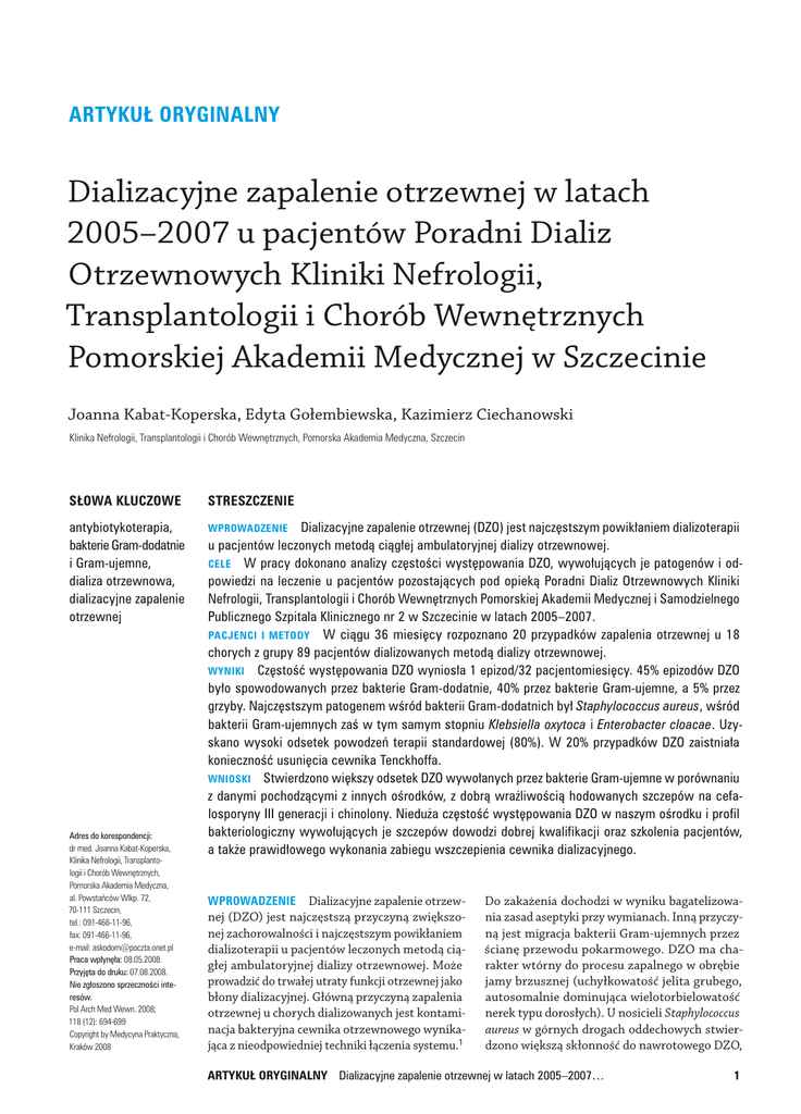 ARTYKUŁ ORYGINALNY Dializacyjne zapalenie otrzewnej w latach 2005–2007 u pacjentów Poradni Dializ Otrzewnowych Kliniki Nefrologii, Transplantologii i Chorób Wewnętrznych Pomorskiej Akademii Medycznej w Szczecinie Joanna Kabat‑Koperska, Edyta Gołembiewska, Kazimierz Ciechanowski Klinika Nefrologii, Transplantologii i Chorób Wewnętrznych, Pomorska Akademia Medyczna, Szczecin Słowa kluczowe STRESZCZENIE antybiotykoterapia, bakterie Gram‑dodatnie i Gram‑ujemne, dializa otrzewnowa, dializacyjne zapalenie otrzewnej Wprowadzenie Adres do korespondencji: dr med. Joanna Kabat‑Koperska, Klinika Nefrologii, Transplanto logii i Chorób Wewnętrznych, Pomorska Akademia Medyczna, al. Powstańców Wlkp. 72, 70-111 Szczecin, tel.: 091‑466‑11‑96, fax: 091‑466‑11‑96, e‑mail: [email protected] Praca wpłynęła: 08.05.2008. Przyjęta do druku: 07.08.2008. Nie zgłoszono sprzeczności inte resów. Pol Arch Med Wewn. 2008; 118 (12): 694-699 Copyright by Medycyna Praktyczna, Kraków 2008 Dializacyjne zapalenie otrzewnej (DZO) jest najczęstszym powikłaniem dializoterapii u pacjentów leczonych metodą ciągłej ambulatoryjnej dializy otrzewnowej. Cele W pracy dokonano analizy częstości występowania DZO, wywołujących je patogenów i od powiedzi na leczenie u pacjentów pozostających pod opieką Poradni Dializ Otrzewnowych Kliniki Nefrologii, Transplantologii i Chorób Wewnętrznych Pomorskiej Akademii Medycznej i Samodzielnego Publicznego Szpitala Klinicznego nr 2 w Szczecinie w latach 2005–2007. Pacjenci i metody W ciągu 36 miesięcy rozpoznano 20 przypadków zapalenia otrzewnej u 18 chorych z grupy 89 pacjentów dializowanych metodą dializy otrzewnowej. Wyniki Częstość występowania DZO wyniosła 1 epizod/32 pacjentomiesięcy. 45% epizodów DZO było spowodowanych przez bakterie Gram‑dodatnie, 40% przez bakterie Gram‑ujemne, a 5% przez grzyby. Najczęstszym patogenem wśród bakterii Gram‑dodatnich był Staphylococcus aureus, wśród bakterii Gram‑ujemnych zaś w tym samym stopniu Klebsiella oxytoca i Enterobacter cloacae. Uzy skano wysoki odsetek powodzeń terapii standardowej (80%). W 20% przypadków DZO zaistniała konieczność usunięcia cewnika Tenckhoffa. Wnioski Stwierdzono większy odsetek DZO wywołanych przez bakterie Gram‑ujemne w porównaniu z danymi pochodzącymi z innych ośrodków, z dobrą wrażliwością hodowanych szczepów na cefa losporyny III generacji i chinolony. Nieduża częstość występowania DZO w naszym ośrodku i profil bakteriologiczny wywołujących je szczepów dowodzi dobrej kwalifikacji oraz szkolenia pacjentów, a także prawidłowego wykonania zabiegu wszczepienia cewnika dializacyjnego. Wprowadzenie Dializacyjne zapalenie otrzew‑ nej (DZO) jest najczęstszą przyczyną zwiększo‑ nej zachorowalności i najczęstszym powikłaniem dializoterapii u pacjentów leczonych metodą cią‑ głej ambulatoryjnej dializy otrzewnowej. Może prowadzić do trwałej utraty funkcji otrzewnej jako błony dializacyjnej. Główną przyczyną zapalenia otrzewnej u chorych dializowanych jest kontami‑ nacja bakteryjna cewnika otrzewnowego wynika‑ jąca z nieodpowiedniej techniki łączenia systemu.1 Do zakażenia dochodzi w wyniku bagatelizowa‑ nia zasad aseptyki przy wymianach. Inną przyczy‑ ną jest migracja bakterii Gram‑ujemnych przez ścianę przewodu pokarmowego. DZO ma cha‑ rakter wtórny do procesu zapalnego w obrębie jamy brzusznej (uchyłkowatość jelita grubego, autosomalnie dominująca wielotorbielowatość nerek typu dorosłych). U nosicieli Staphylococcus aureus w górnych drogach oddechowych stwier‑ dzono większą skłonność do nawrotowego DZO, ARTYKUŁ ORYGINALNY Dializacyjne zapalenie otrzewnej w latach 2005–2007… 1 Tabela 1 Etiologia dializacyjnego zapalenia otrzewnej (Klinika Nefrologii, Transplantologii i Chorób Wewnętrznych Pomorskiej Akademii Medycznej) Patogen Częstość (n = 20) flora Gram‑dodatnich Staphylococcus epidermidis 3 (15%) MRSE‑1 Staphylococcus aureus 4 (20%) MRSA‑0 Staphylococcus heamolyticus 1 (5%) MR Staphylococcus hominis 1 (5%) MR flora Gram‑ujemnych Escherichia coli 1 (5%) Klebsiella oxytoca 3 (15%) Enterobacter cloacae 3 (15%) Moraxella catharralis 1 (5%) grzyby Candida albicans posiew ujemny 1 (5%) 2 (10%) Skróty: MR – szczep metycylinooporny, MRSA – metycylinooporny Staphylococcus aureus, MRSE-1 – metycylinooporny Staphylococcus epidermidis a obecność kolonii gronkowca złocistego na skó‑ rze w okolicy cewnika stwarza zagrożenie powsta‑ nia biofilmu bakteryjnego wewnątrz cewnika.2 Wraz z udoskonalaniem systemu i sprzętu słu‑ żącego do wymian, częstość występowania DZO zmieniała się – w 1982 roku obserwowano 1–2 epizody przypadające na pacjenta w ciągu roku (1 epizod na 4–5 pacjentomiesięcy leczenia),3,4 w la‑ tach 90. częstość występowania tego powikłania zmalała do 1 epizodu na około 24 pacjentomie‑ siące leczenia.1 W latach 2002–2004 był to 1 epi‑ zod na 24–34 pacjentomiesięcy5,6 ; w 2005 roku częstość występowania DZO ustabilizowała się na poziomie 1 epizodu na 24 miesiące leczenia.7 Wśród patogenów będących sprawcami DZO do‑ minują bakterie Gram‑dodatnie. Bakterie Gram ‑ujemne odpowiadają za około 20% przypadków DZO. Pacjenci leczeni metodą automatycznej dia‑ lizy otrzewnowej (ADO) są narażeni na mniej‑ sze ryzyko DZO niż chorzy leczeni metodą wy‑ mian ręcznych (CADO)1 (ADO to forma terapii, w której płyn dializacyjny w jamie otrzewnowej jest wymieniany za pomocą tzw. cyklera, czyli automatycznego urządzenia według ustalonego przepisu dializy). W naszej pracy dokonaliśmy analizy często‑ ści występowania DZO, wywołujących je patoge‑ nów i odpowiedzi na leczenie u pacjentów pozo‑ stających pod opieką Poradni Dializ Otrzewno‑ wych Kliniki Nefrologii, Transplantologii i Chorób Wewnętrznych Pomorskiej Akademii Medycznej i Samodzielnego Publi