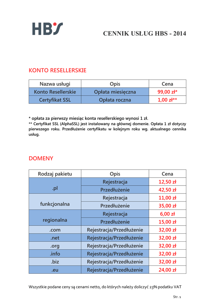 CENNIK USŁUG HBS - 2014 KONTO RESELLERSKIE Nazwa usługi Opis Cena Konto Resellerskie Opłata miesięczna 99,00 zł* Certyfikat SSL Opłata roczna 1,00 zł** * opłata za pierwszy miesiąc konta resellerskiego wynosi 1 zł. ** Certyfikat SSL (AlphaSSL) jest instalowany na głównej domenie. Opłata 1 zł dotyczy pierwszego roku. Przedłużenie certyfikatu w kolejnym roku wg. aktualnego cennika usług. DOMENY Rodzaj pakietu Opis Cena Rejestracja 12,50 zł Przedłużenie 42,50 zł Rejestracja 11,00 zł Przedłużenie 35,00 zł regionalna Rejestracja 6,00 zł Przedłużenie 15,00 zł .com Rejestracja/Przedłużenie 32,00 zł .net Rejestracja/Przedłużenie 32,00 zł .org Rejestracja/Przedłużenie 32,00 zł .info Rejestracja/Przedłużenie 32,00 zł .biz Rejestracja/Przedłużenie 32,00 zł .eu Rejestracja/Przedłużenie 24,00 zł .pl funkcjonalna Wszystkie podane ceny są cenami netto, do których należy doliczyć 23% podatku VAT Str. 1 CENNIK USŁUG HBS - 2014 .cz Rejestracja/Przedłużenie 50,00 zł .ru Rejestracja/Przedłużenie 50,00 zł .co.uk Rejestracja/Przedłużenie 35,00 zł .be Rejestracja/Przedłużenie 19,00 zł .nl Rejestracja/Przedłużenie 29,00 zł .es Rejestracja/Przedłużenie 29,00 zł .it Rejestracja/Przedłużenie 29,00 zł .fr Rejestracja/Przedłużenie 29,00 zł .co Rejestracja/Przedłużenie 72,00 zł Rodzaj pakietu Opis Cena AlphaSSL Rejestracja/Przedłużenie 29,00 zł RapidSSL Rejestracja/Przedłużenie 39,00 zł RapidSSL Wildcard Rejestracja/Przedłużenie 294,00 zł True BusinessID Rejestracja/Przedłużenie 245,00 zł True BusinessID Wildcard Rejestracja/Przedłużenie True BusinessID EV Rejestracja/Przedłużenie CERTYFIKATY SSL 980,00 zł 391,00 zł Wszystkie podane ceny są cenami netto, do których należy doliczyć 23% podatku VAT Str. 2 CENNIK USŁUG HBS - 2014 SERWERY – VIRTUAL PRIVATE SERVER Rodzaj pakietu eVPS Micro eVPS Basic eVPS Advanced eVPS Professional Opis Opłata miesięczna Opłata kwartalna Opłata półroczna Opłata roczna Opłata miesięczna Opłata kwartalna Opłata półroczna Opłata roczna Opłata miesięczna Opłata kwartalna Opłata półroczna Opłata roczna Opłata miesięczna Opłata kwartalna Opłata półroczna Opłata roczna Cena 20,00 zł 60,00 zł 120 zł 240 zł 35,00 zł 105 zł 210 zł 420 zł 52,00 zł 156,00 zł 312,00 zł 624,00 zł 78,00 zł 234,00 zł 468,00 zł 936,00 zł VIRTUAL PRIVATE SERVER – DODATKOWE ZASOBY Rodzaj pakietu Opis Cena Adres IP Plesk Panel VPS do 100 domen Plesk Panel VPS bez limitu domen Plesk Panel VPS Power Pack Opłata miesięczna 15,00 zł Opłata miesięczna 21,24 zł Opłata miesięczna 33,99 zł Opłata miesięczna 21,24 zł Wszystkie podane ceny są cenami netto, do których należy doliczyć 23% podatku VAT Str. 3 CENNIK USŁUG HBS - 2014 SERWERY – HOSTING WSPÓŁDZIELONY Rodzaj pakietu Opis Cena Opłata roczna 72,00 zł Opłata miesięczna 7,00 zł Opłata roczna 90,00 zł Opłata miesięczna 8,50 zł Opłata roczna 138,00 zł Opłata miesięczna 13,50 zł Opłata roczna 216,00 zł Opłata miesięczna 21 zł Rodzaj pakietu Opis Cena eMail Private Opłata roczna 30,00 zł eMail Business Opłata roczna 60,00 zł Opis Cena Opłata roczna 426,00 zł Opłata miesięczna 50 zł Opłata roczna 540,00 zł Opłata miesięczna 55 zł eHost Basic eHost Medium eHost Advanced eHost Professional POCZTA E-MAIL E-SKLEPY Rodzaj pakietu eShop eShop Pro Wszystkie podane ceny są cenami netto, do których należy doliczyć 23% podatku VAT Str. 4