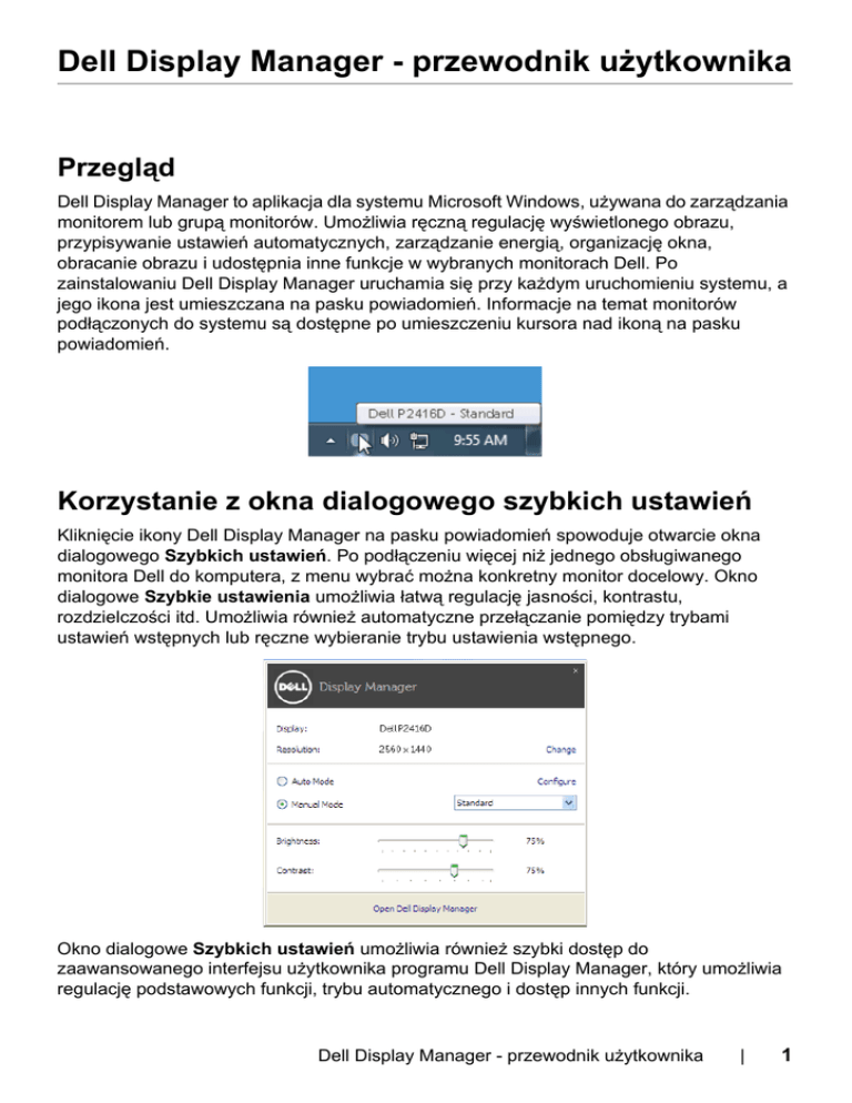 Dell Display Manager - przewodnik użytkownika Przegląd Dell Display Manager to aplikacja dla systemu Microsoft Windows, używana do zarządzania monitorem lub grupą monitorów. Umożliwia ręczną regulację wyświetlonego obrazu, przypisywanie ustawień automatycznych, zarządzanie energią, organizację okna, obracanie obrazu i udostępnia inne funkcje w wybranych monitorach Dell. Po zainstalowaniu Dell Display Manager uruchamia się przy każdym uruchomieniu systemu, a jego ikona jest umieszczana na pasku powiadomień. Informacje na temat monitorów podłączonych do systemu są dostępne po umieszczeniu kursora nad ikoną na pasku powiadomień. Korzystanie z okna dialogowego szybkich ustawień Kliknięcie ikony Dell Display Manager na pasku powiadomień spowoduje otwarcie okna dialogowego Szybkich ustawień. Po podłączeniu więcej niż jednego obsługiwanego monitora Dell do komputera, z menu wybrać można konkretny monitor docelowy. Okno dialogowe Szybkie ustawienia umożliwia łatwą regulację jasności, kontrastu, rozdzielczości itd. Umożliwia również automatyczne przełączanie pomiędzy trybami ustawień wstępnych lub ręczne wybieranie trybu ustawienia wstępnego. Okno dialogowe Szybkich ustawień umożliwia również szybki dostęp do zaawansowanego interfejsu użytkownika programu Dell Display Manager, który umożliwia regulację podstawowych funkcji, trybu automatycznego i dostęp innych funkcji. Dell Display Manager - przewodnik użytkownika | 1 Ustawianie podstawowych funkcji wyświetlania Użytkownik może ręcznie wybrać tryb ustawienia wstępnego lub wybrać opcję Auto Mode (Tryb automatyczny), w którym stosowany jest tryb ustawienia wstępnego w zależności od aktywnej aplikacji. Wiadomość ekranowa wyświetla przez chwilę aktualny Preset Mode (Tryb ustawień wstępnych) w momencie jego zmiany. Brightness (Jasność) i Contrast (Kontrast) wybranego monitora można również wyregulować bezpośrednio z poziomu karty Basic (Podstawowe). Przypisywanie trybów ustawień wstępnych do aplikacji Karta Auto Mode (Tryb automatyczny) umożliwia powiązanie określonych Preset Mode (Tryb ustawień wstępnych) z konkretną aplikacją i ich automatyczne stosowanie. Gdy Auto Mode (Tryb automatyczny) jest włączony, program Dell Display Manager automatycznie włączy odpowiednie Preset Mode (Tryb ustawień wstępnych) w momencie aktywacji powiązanej z nimi aplikacji. Preset Mode (Tryb ustawień wstępnych) przypisany do konkretnej aplikacji może być taki sam w każdym podłączonym monitorze lub można też ustawić różny tryb ustawień wstępnych dla każdego z monitorów. Program Dell Display Manager został wstępnie skonfigurowany dla wielu popularnych aplikacji. Aby dodać nową aplikację do listy zadań, wystarczy ją przeciągnąć z pulpitu, menu Start systemu Windows lub innego miejsca i upuścić na bieżącą listę. UWAGA: Zadania Preset Mode (Tryb ustawień wstępnych) przypisane do plików wsadowych, skryptów, modułów ładujących, a także plików niewykonywalnych, takich jak archiwa zip czy inne pliki spakowane, nie są obsługiwane. 2 | Dell Display Manager - przewodnik użytkownika Można również skonfigurować tryb ustawienia wstępnego Game (Gra) tak, aby był używany za każdym razem, gdy aplikacja Direct3D zostaje uruchomiona w trybie pełnoekranowym. Aby uniemożliwić aplikacji używanie tego trybu, należy jej przypisać inny tryb ustawienia wstępnego. Stosowanie funkcji oszczędzania energii W przypadku obsługiwanych modeli Dell dostępna jest zakładka Options (Opcje), zawierająca opcje oszczędności energii PowerNap. Można ustawić jasność monitora do minimalnego poziomu lub uruchomić uśpienie monitora, gdy zostaje włączony wygaszacz ekranu. Dell Display Manager - przewodnik użytkownika | 3