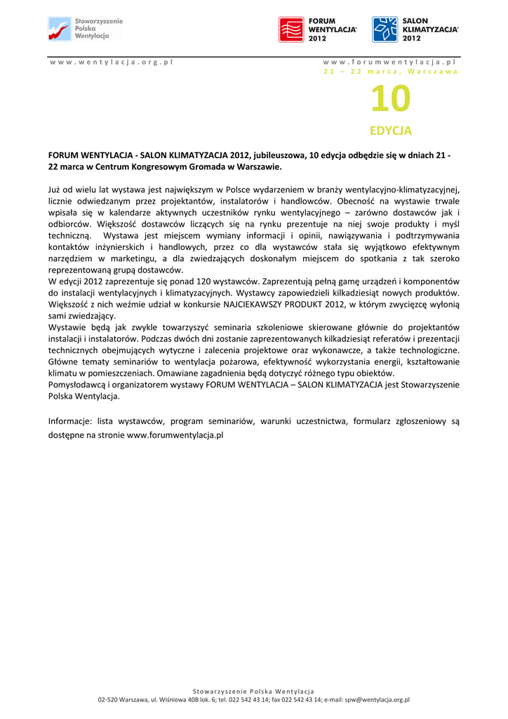 www.wentylacja.org.pl www.forumwentylacja.pl 21 – 22 marca, Warszawa 10 EDYCJA FORUM WENTYLACJA - SALON KLIMATYZACJA 2012, jubileuszowa, 10 edycja odbędzie się w dniach 21 22 marca w Centrum Kongresowym Gromada w Warszawie. Już od wielu lat wystawa jest największym w Polsce wydarzeniem w branży wentylacyjno-klimatyzacyjnej, licznie odwiedzanym przez projektantów, instalatorów i handlowców. Obecność na wystawie trwale wpisała się w kalendarze aktywnych uczestników rynku wentylacyjnego – zarówno dostawców jak i odbiorców. Większość dostawców liczących się na rynku prezentuje na niej swoje produkty i myśl techniczną. Wystawa jest miejscem wymiany informacji i opinii, nawiązywania i podtrzymywania kontaktów inżynierskich i handlowych, przez co dla wystawców stała się wyjątkowo efektywnym narzędziem w marketingu, a dla zwiedzających doskonałym miejscem do spotkania z tak szeroko reprezentowaną grupą dostawców. W edycji 2012 zaprezentuje się ponad 120 wystawców. Zaprezentują pełną gamę urządzeń i komponentów do instalacji wentylacyjnych i klimatyzacyjnych. Wystawcy zapowiedzieli kilkadziesiąt nowych produktów. Większość z nich weźmie udział w konkursie NAJCIEKAWSZY PRODUKT 2012, w którym zwycięzcę wyłonią sami zwiedzający. Wystawie będą jak zwykle towarzyszyć seminaria szkoleniowe skierowane głównie do projektantów instalacji i instalatorów. Podczas dwóch dni zostanie zaprezentowanych kilkadziesiąt referatów i prezentacji technicznych obejmujących wytyczne i zalecenia projektowe oraz wykonawcze, a także technologiczne. Główne tematy seminariów to wentylacja pożarowa, efektywność wykorzystania energii, kształtowanie klimatu w pomieszczeniach. Omawiane zagadnienia będą dotyczyć różnego typu obiektów. Pomysłodawcą i organizatorem wystawy FORUM WENTYLACJA – SALON KLIMATYZACJA jest Stowarzyszenie Polska Wentylacja. Informacje: lista wystawców, program seminariów, warunki uczestnictwa, formularz zgłoszeniowy są dostępne na stronie www.forumwentylacja.pl Stowarzyszenie Polska Wentylacja 02-520 Warszawa, ul. Wiśniowa 40B lok. 6; tel. 022 542 43 14; fax 022 542 43 14; e-mail: [email protected]