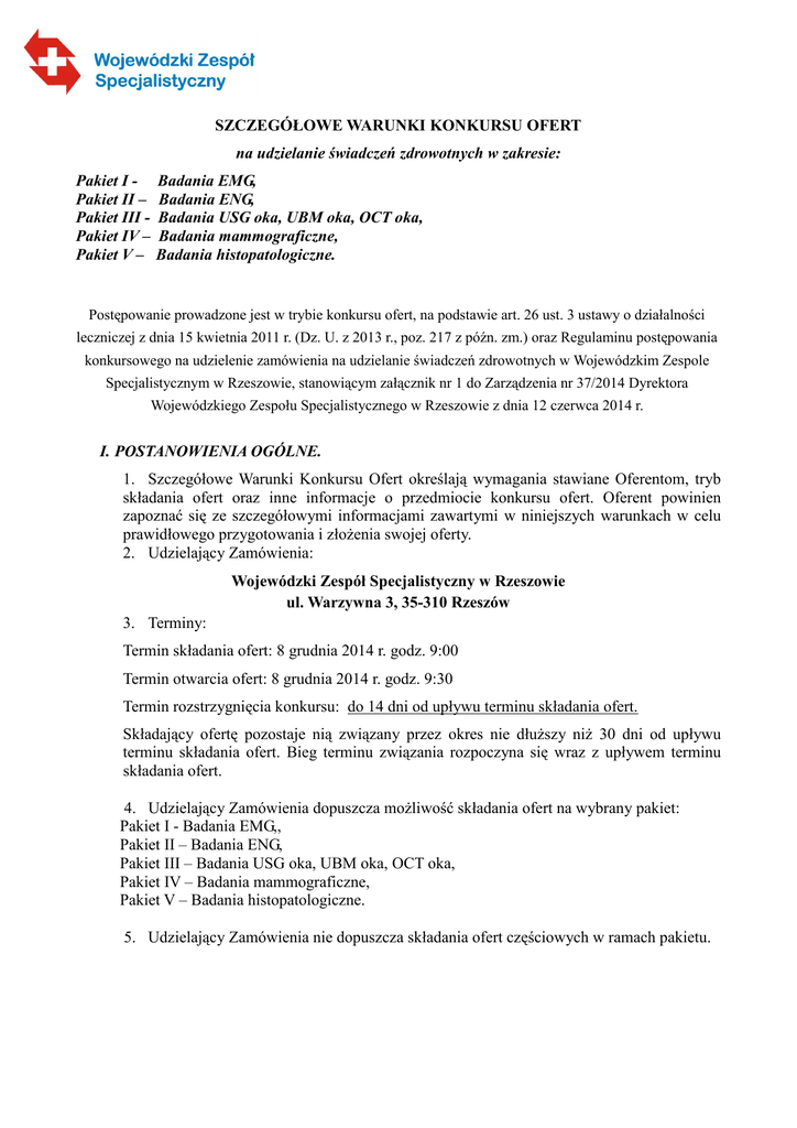 SZCZEGÓŁOWE WARUNKI KONKURSU OFERT na udzielanie świadczeń zdrowotnych w zakresie: Pakiet I Pakiet II – Pakiet III Pakiet IV – Pakiet V – Badania EMG, Badania ENG, Badania USG oka, UBM oka, OCT oka, Badania mammograficzne, Badania histopatologiczne. Postępowanie prowadzone jest w trybie konkursu ofert, na podstawie art. 26 ust. 3 ustawy o działalności leczniczej z dnia 15 kwietnia 2011 r. (Dz. U. z 2013 r., poz. 217 z późn. zm.) oraz Regulaminu postępowania konkursowego na udzielenie zamówienia na udzielanie świadczeń zdrowotnych w Wojewódzkim Zespole Specjalistycznym w Rzeszowie, stanowiącym załącznik nr 1 do Zarządzenia nr 37/2014 Dyrektora Wojewódzkiego Zespołu Specjalistycznego w Rzeszowie z dnia 12 czerwca 2014 r. I. POSTANOWIENIA OGÓLNE. 1. Szczegółowe Warunki Konkursu Ofert określają wymagania stawiane Oferentom, tryb składania ofert oraz inne informacje o przedmiocie konkursu ofert. Oferent powinien zapoznać się ze szczegółowymi informacjami zawartymi w niniejszych warunkach w celu prawidłowego przygotowania i złożenia swojej oferty. 2. Udzielający Zamówienia: Wojewódzki Zespół Specjalistyczny w Rzeszowie ul. Warzywna 3, 35-310 Rzeszów 3. Terminy: Termin składania ofert: 8 grudnia 2014 r. godz. 9:00 Termin otwarcia ofert: 8 grudnia 2014 r. godz. 9:30 Termin rozstrzygnięcia konkursu: do 14 dni od upływu terminu składania ofert. Składający ofertę pozostaje nią związany przez okres nie dłuższy niż 30 dni od upływu terminu składania ofert. Bieg terminu związania rozpoczyna się wraz z upływem terminu składania ofert. 4. Udzielający Zamówienia dopuszcza możliwość składania ofert na wybrany pakiet: Pakiet I - Badania EMG,, Pakiet II – Badania ENG, Pakiet III – Badania USG oka, UBM oka, OCT oka, Pakiet IV – Badania mammograficzne, Pakiet V – Badania histopatologiczne. 5. Udzielający Zamówienia nie dopuszcza składania ofert częściowych w ramach pakietu. II. WYMAGANIA WSTĘPNE DLA OFERENTÓW: a) Pakiet nr: 1,2,3 1. Pracownia diagnostyczna Oferenta, w której będą wykonywane badania znajduje się na terenie Rzeszowa. 2. Badania będą wykonywane na podstawie imiennego pisemnego skierowania i muszą być zakończone wydaniem wyniku autoryzowanego przez osobę z odpowiednimi w danym zakresie kwalifikacjami i uprawnieniami. 3. Badania winny być wykonywane przez osoby posiadające odpowiednie kwalifikacje i uprawnienia z zakresu wykonywanych świadczeń, określonych w Załącznik nr 2. 4. Wyniki badań winny być opisywane przez lekarza posiadającego kwalifikacje w zakresie oceny i opisywania badań. 5. Czas oczekiwania na wyniki badań nie powinien przekroczyć 7 dni. 6. Przyjmujący Zamówienie będzie dostarczać wyniki na własny koszt do siedziby Udzielającego Zamówienie: osobiście lub listownie 7. W przypadku nie przekazania Udzielającemu Zamówienia wyniku badania, badanie to nie będzie finansowane. 8. W przypadku wystąpienia zakłóceń w wykonywaniu badań przez Przyjmującego Zamówienie, winien on niezwłocznie poinformować o tym fakcie Udzielającego Zamówienie i uzgodnić termin wykonania badania. b) Pakiet nr: 4 1. Pracownia diagnostyczna Oferenta, w której będą wykonywane badania znajduje się na terenie Rzeszowa. 2. Badania będą wykonywane na podstawie imiennego pisemnego skierowania i muszą być zakończone wydaniem wyniku autoryzowanego przez osobę z odpowiednimi w danym zakresie kwalifikacjami i uprawnieniami. 3. Badania winny być z wykonywane przez osoby posiadające odpowiednie kwalifikacje i uprawnienia z zakresu wykonywanych świadczeń, określonych w Załącznik nr 2. 4. Wyniki badań winny być opisywane przez lekarza posiadającego kwalifikacje w zakresie oceny i opisywania badań. 5. Casz oczekiwania na wykonanie badanie nie powinien przekroczyć 3 dni. 6. Czas oczekiwania na wyniki badań nie powinien przekraczać 7 dni. 7. Przyjmujący Zamówienie będzie dostarczać wyniki na własny koszt do siedziby Udzielającego Zamówienie: osobiście lub listownie. 8. W przypadku nie przekazania Udzielającemu Zamówienia wyniku badania, badanie to nie będzie finansowane. 9. W przypadku wystąpienia zakłóceń w wykonywaniu badań przez Przyjmującego Zamówienie, winien on niezwłocznie poinformować o tym fakcie Udzielającego Zamówienie i uzgodnić termin wykonania badania. c) Pakiet nr: 5 1. Badania będą wykonywane na podstawie imiennego pisemnego skierowania i muszą być zakończone wydaniem wyniku autoryzowanego przez osobę z odpowiednimi w danym zakresie kwalifikacjami i uprawnieniami. 2. Oferent powinien posiadać personel z uprawnieniami do wykonywania badań będących przedmiotem konkursu oraz udokumentować że posiada min. dwóch lekarzy specjalistów z zakresu patomorfologi. 3. Oferent powinien zapewnić w przypadku konieczności dodatkowe konsultacje specjalistów. 4. W przypadku wystąpienia zakłóceń w wykonywaniu badań przez Przyjmującego Zamówienie, winien on niezwłocznie poinformować o tym fakcie Udzielającego Zamówienie i uzgodnić termin wykonania badania. 5. Oferent zapewni opracowanie materiałów tkankowych i przygotowanie preparatów z zastosowaniem jednorazowych, plastikowych kasetek do przygotowania bloczków parafinowych, zgodnie z wytycznymi Polskiego Towarzystwa Patologów oraz standardami określonymi przez Narodowy Fundusz Zdrowia. 6. Oferent zapewni transport pobranych tkanek/ płynów w cenie badania, min. dwa razy w tygodniu. 7. Oferent zapewni druki skierowań oraz jednorazowe opakowania jednostkowe do transportu materiału biologicznego na własny koszt. 8. Oferent odpowiada za sporządzenie i dostarczenie wyników na własny koszt z opisem badania mikroskopowego do placówki Udzielającego Zamówienie w terminie do 5 dni roboczych od dnia odbioru materiału do badań. 9. Oferent odpowiada za dostarczenie wyników do placówki Udzielającego Zamówienie: osobiście lub listownie na własny koszt min. dwa razy w tygodniu,