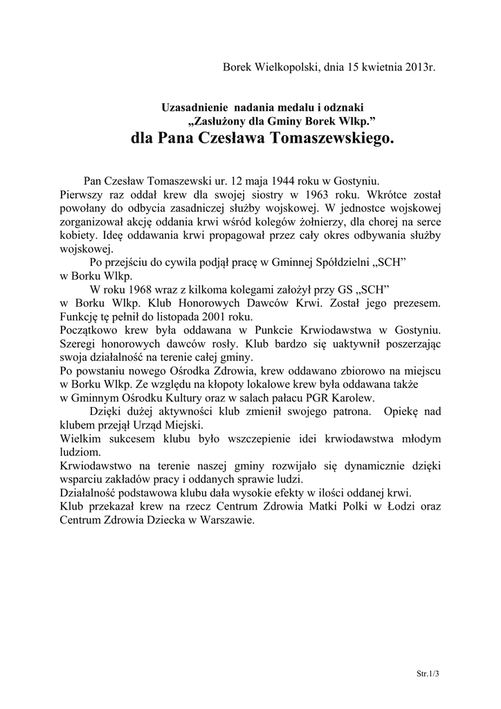 Borek Wielkopolski, dnia 15 kwietnia 2013r. Uzasadnienie nadania medalu i odznaki „Zasłużony dla Gminy Borek Wlkp.” dla Pana Czesława Tomaszewskiego. Pan Czesław Tomaszewski ur. 12 maja 1944 roku w Gostyniu. Pierwszy raz oddał krew dla swojej siostry w 1963 roku. Wkrótce został powołany do odbycia zasadniczej służby wojskowej. W jednostce wojskowej zorganizował akcję oddania krwi wśród kolegów żołnierzy, dla chorej na serce kobiety. Ideę oddawania krwi propagował przez cały okres odbywania służby wojskowej. Po przejściu do cywila podjął pracę w Gminnej Spółdzielni „SCH” w Borku Wlkp. W roku 1968 wraz z kilkoma kolegami założył przy GS „SCH” w Borku Wlkp. Klub Honorowych Dawców Krwi. Został jego prezesem. Funkcję tę pełnił do listopada 2001 roku. Początkowo krew była oddawana w Punkcie Krwiodawstwa w Gostyniu. Szeregi honorowych dawców rosły. Klub bardzo się uaktywnił poszerzając swoja działalność na terenie całej gminy. Po powstaniu nowego Ośrodka Zdrowia, krew oddawano zbiorowo na miejscu w Borku Wlkp. Ze względu na kłopoty lokalowe krew była oddawana także w Gminnym Ośrodku Kultury oraz w salach pałacu PGR Karolew. Dzięki dużej aktywności klub zmienił swojego patrona. Opiekę nad klubem przejął Urząd Miejski. Wielkim sukcesem klubu było wszczepienie idei krwiodawstwa młodym ludziom. Krwiodawstwo na terenie naszej gminy rozwijało się dynamicznie dzięki wsparciu zakładów pracy i oddanych sprawie ludzi. Działalność podstawowa klubu dała wysokie efekty w ilości oddanej krwi. Klub przekazał krew na rzecz Centrum Zdrowia Matki Polki w Łodzi oraz Centrum Zdrowia Dziecka w Warszawie. Str.1/3 Za pracę na rzecz honorowego krwiodawstwa i aktywnej działalności w klubie otrzymał następujące dyplomy i odznaczenia: 1) Odznaka „Zasłużony Honorowy Dawca Krwi” za 6 litrów krwi – w dowód uznania za najpiękniejszy dar humanitarny – bezinteresowne, długoletnie oddawanie krwi – Zarząd Główny PCK Warszawa – 15 luty 1973r., 2) Odznaka Honorowa PCK IV stopnia – Zarząd Główny PCK Warszawa – 19 września 1974r., 3) dyplom przyznany przez Prezesa ZGPCK – 22 listopada 1982 r. w Warszawie, 4) Pamiątkowy medal 25 – lecia Honorowego Krwiodawstwa – Zarząd Główny PCK Warszawa 10 listopada 1983r., 5) Medal 40 –lecia Polski Ludowej – Rada Państwa Warszawa – 22 lipca 1984r., 6) Odznaka „Zasłużony Honorowy Dawca Krwi” I stopnia po oddaniu 18 litrów krwi – ZG PCK – 18 marca 1987 r., 7) Srebrny Krzyż Zasługi – za 20 litrów krwi – 21 październik 1987 r. Warszawa, 8) Odznaka „Za zasługi dla Województwa Leszczyńskiego” Leszno – 11 listopada 1987 r., 9) Życzenia dla Czesława Tomaszewskiego – Telewizyjny Koncert Życzeń – 14 maja 1988r., 10) dyplom – za rozwój honorowego dawstwa krwi – 02 września 1988r. – Zarząd Główny PCK Warszawa, 11) podziękowanie dla członków Klubu HDK przy Urzędzie Miasta i Gminy w Borku Wlkp. za honorowe oddanie 4400 ml krwi 16 listopada 1988 r. – Społeczny Komitet Budowy Pomnika Szpitala Centrum Zdrowia Dziecka w Warszawie, 12) dyplom z okazji 30 – lecia Honorowego Krwiodawstwa w Polsce dla Klubu HDK w Borku Wlkp. – Kombinat PGR Karolew – grudzień 1988 r., 13) Odznaka „Zasłużony Honorowy Dawca Krwi” II stopnia za oddanie 12 litrów krwi – Warszawa ZG PCK – 23 września 1990 r., 14) Złoty Krzyż Zasługi – za 25 litrów krwi – 31 października 1990 r. Warszawa, 15) Kryształowe Serce – za wybitne zasługi w rozwoju honorowego krwiodawstwa – Warszawa – 14 października 1993 r. – po oddaniu 40 litrów krwi (jako jedyny w gminie). 16) Odznaka Honorowa PCK II stopnia – 15 październik 1993 r. Warszawa, 17) Pamiątkowy Medal 75 – lecia PCK dla Klubu HDK przy Urzędzie Miejskim w Borku Wlkp. – Warszawa 14 maja 1994 r., 18) dyplom za zasługi w zakresie popularyzacji i rozwoju HDK – Zarząd Główny PCK – 15 listopada 1994 r. Warszawa, Str.2/3 19) dyplom nadany przez Zarząd Główny PCK – jako wyraz wdzięczności i podziękowania za wieloletnie szczególne zasługi – 13 listopada 1995 r. Warszawa, 20) dyplom za zasługi w zakresie popularyzacji i rozwoju HDK – 15 listopada 1996 r. Warszawa – ZGPCK, 21) dyplom za osobiste zaangażowanie idei honorowego krwiodawstwa ZG PCK – 31 października 1997 r., 22) dyplom za osobiste zaangażowanie i udział w propagowaniu idei honorowego krwiodawstwa –ZGPCK 20 listopada 1998 r. Warszawa, 23) dyplom uznania za zasługi na rzecz Polskiego Czerwonego Krzyża dla współzałożyciela Klubu Honorowego Dawcy Krwi w Borku Wlkp. – za aktywną postawę i zaangażowanie w Klubie Dawców Krwi – Zarząd Miejski Borku Wlkp. – czerwiec 2000 r., 24) dyplom z okazji 45 – lecia ruchu honorowego krwiodawstwa w Polsce oraz 35 – lecia działalności klubu HDK PCK przy Urzędzie Miejskim w Borku Wlkp. – Poznań listopad 2003 r. Krwiodawca to człowiek o większej niż przeciętna wrażliwości na sprawy ludzkie, skłonny do bezinteresownego działania na rzecz nawet nieznanego chorego czy ofiary wypadku. Honorowy dawca krwi to także pewna postawa życiowa, wynikająca z dużego zrozumienia dla potrzeby leczenia krwią lub ratowania życia ludzkiego przez podanie tego niezastąpionego leku. To altruista, stawiający sobie za cel pomaganie innym, być może również swoim bliskim, kolegom przyjaciołom – czasem, jak wykazują liczne przypadki, także sobie samemu. Honorowy dawca krwi to człowiek taki, jak Czesław Tomaszewski, który podjął decyzję o podzieleniu się cząstką siebie z innymi. Pamiętaj, oddając krew – dajesz życie! Str.3/3