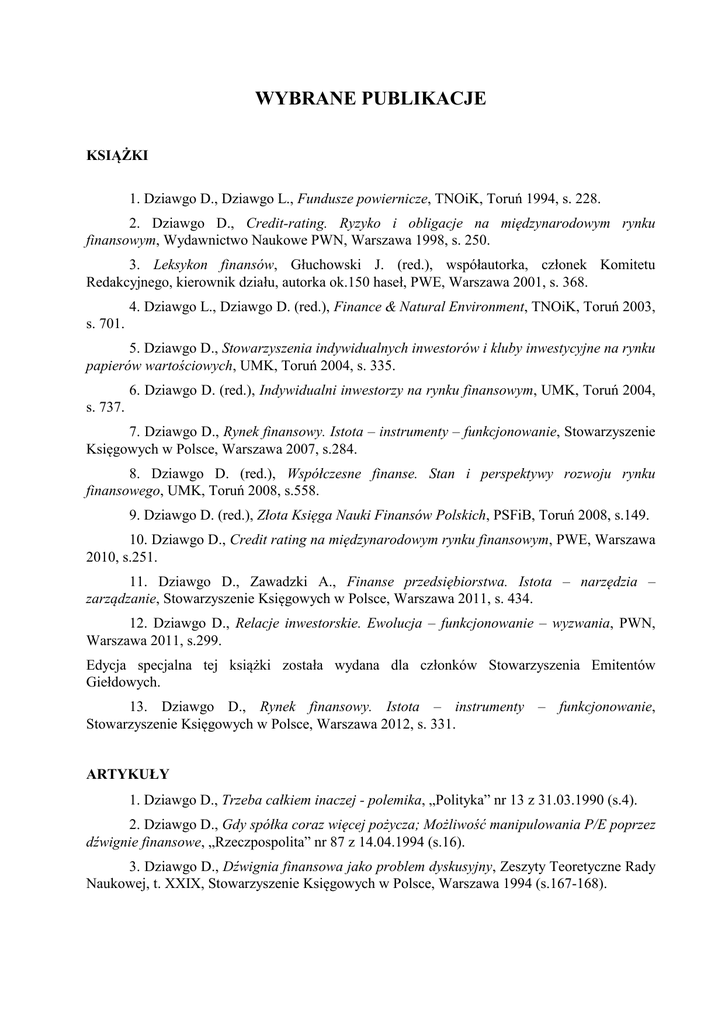 WYBRANE PUBLIKACJE KSIĄŻKI 1. Dziawgo D., Dziawgo L., Fundusze powiernicze, TNOiK, Toruń 1994, s. 228. 2. Dziawgo D., Credit-rating. Ryzyko i obligacje na międzynarodowym rynku finansowym, Wydawnictwo Naukowe PWN, Warszawa 1998, s. 250. 3. Leksykon finansów, Głuchowski J. (red.), współautorka, członek Komitetu Redakcyjnego, kierownik działu, autorka ok.150 haseł, PWE, Warszawa 2001, s. 368. 4. Dziawgo L., Dziawgo D. (red.), Finance & Natural Environment, TNOiK, Toruń 2003, s. 701. 5. Dziawgo D., Stowarzyszenia indywidualnych inwestorów i kluby inwestycyjne na rynku papierów wartościowych, UMK, Toruń 2004, s. 335. 6. Dziawgo D. (red.), Indywidualni inwestorzy na rynku finansowym, UMK, Toruń 2004, s. 737. 7. Dziawgo D., Rynek finansowy. Istota – instrumenty – funkcjonowanie, Stowarzyszenie Księgowych w Polsce, Warszawa 2007, s.284. 8. Dziawgo D. (red.), Współczesne finanse. Stan i perspektywy rozwoju rynku finansowego, UMK, Toruń 2008, s.558. 9. Dziawgo D. (red.), Złota Księga Nauki Finansów Polskich, PSFiB, Toruń 2008, s.149. 10. Dziawgo D., Credit rating na międzynarodowym rynku finansowym, PWE, Warszawa 2010, s.251. 11. Dziawgo D., Zawadzki A., Finanse przedsiębiorstwa. Istota – narzędzia – zarządzanie, Stowarzyszenie Księgowych w Polsce, Warszawa 2011, s. 434. 12. Dziawgo D., Relacje inwestorskie. Ewolucja – funkcjonowanie – wyzwania, PWN, Warszawa 2011, s.299. Edycja specjalna tej książki została wydana dla członków Stowarzyszenia Emitentów Giełdowych. 13. Dziawgo D., Rynek finansowy. Istota – instrumenty – funkcjonowanie, Stowarzyszenie Księgowych w Polsce, Warszawa 2012, s. 331. ARTYKUŁY 1. Dziawgo D., Trzeba całkiem inaczej - polemika, „Polityka” nr 13 z 31.03.1990 (s.4). 2. Dziawgo D., Gdy spółka coraz więcej pożycza; Możliwość manipulowania P/E poprzez dźwignie finansowe, „Rzeczpospolita” nr 87 z 14.04.1994 (s.16). 3. Dziawgo D., Dźwignia finansowa jako problem dyskusyjny, Zeszyty Teoretyczne Rady Naukowej, t. XXIX, Stowarzyszenie Księgowych w Polsce, Warszawa 1994 (s.167-168). 4. Dziawgo D., Credit-rating as an example of risk standardization on the securities market [w:] E. Miklaszewska (red.), Competitive Banking in Central and Eastern Europe, Jagiellonian University Press, Kraków 1995, s. 324 (221-224). 5. Dziawgo D., Waga oceny; Polskie obligacje na rynkach międzynarodowych, „Rzeczpospolita” nr 258 z 07.11.1995 (s.20). 6. Dziawgo D., The Polish Debt Securities Market, [w:] Z. Wiśniewski (red.), The Adjustment of Polish Companies to the Market Economy, UMK, Toruń 1996, s. 200 (63-77). 7. Dziawgo D., Bony komercyjne na polskim rynku finansowym - wybrane aspekty w działalności bankowej, „Bank i Kredyt” nr 4/1998 (s.4-10). 8. Dziawgo D., Dziawgo L., Pensionskassen in Polen, „Oeko-Invest” nr 23/1999 (s.4-5). 9. Dziawgo D., Dziawgo L., Integracja czy dominacja? Refleksje na temat zarządzania procesem integracji polskiego rynku finansowego z międzynarodowym rynkiem finansowym, „Bank i Kredyt” nr 1-2/2000 (s.37-47). 10. Dziawgo D., Credit-rating w procesie stymulowania rozwoju regionalnego w Polsce, [w:] Pawłowicz L. (red.), Możliwości kreowania lokalnych rynków finansowych przez samorządy terytorialne, Instytut Badań nad Gospodarką Rynkową, Gdańsk 2000, s.107 (s.50-72). 11. Dziawgo D., Dziawgo L., Ekologiczne fundusze inwestycyjne i eco-rating, Biuro Informacji i Dokumentacji Senackiej Kancelarii Senatu RP, Dział Ekspertyz, OT-267, marzec 2000, s.11. 12. Dziawgo D., Kluby inwestycyjne na rynku kapitałowym, [w:] Zarzecki D.(red.), Zarządzanie finansami. Cele – organizacja – narzędzia, Fundacja Rozwoju Rachunkowości w Polsce, Warszawa 2001, s. 622 (s.61-74). 13. Dziawgo D., Stowarzyszenia indywidualnych inwestorów i kluby inwestycyjne – konkurencja dla banków i funduszy inwestycyjnych, [w:] Jajuga K., Łyszczak M. (red.), Finanse, bankowość i ubezpieczenia, t.2, Prace Naukowe AE, nr 899, Wrocław 2001, s. 322 (s. 77-83). 14. Dziawgo D., Wybrane wyzwania dla rachunkowości XXI wieku – globalizacja, instrumenty pochodne, ochrona środowiska, [w:] Micherda B. (red.), Ewolucja polskiej rachunkowości na tle rozwiązań światowych, AE, Kraków 2001, s. 392 (s.377-382). 15. Dziawgo D., Wbrew mitom. Indywidualni inwestorzy mogą mieć pozytywny wpływ na zarządzanie wartością firmy, „Gazeta Bankowa” nr 38/2001 (s.32-34). 16. Dziawgo D., Ekologiczne fundusze inwestycyjne w Japonii, [w:] Budnikowski A., Cygler M. (red.), Globalizacja gospodarki a ochrona środowiska, SGH, Warszawa 2002, s. 500 (s.426-439). 17. Dziawgo D., Indywidualni inwestorzy na amerykańskim rynku finansowym, [w:] Tarczyński W. (red.), Rynek kapitałowy – skuteczne inwestowanie, US, Szczecin 2002, s. 551 (413-427). 18. Dziawgo D., Nie ma rynku bez indywidualnych inwestorów, „nasz Rynek Kapitałowy” nr 9/2002, s.120 (s.12-14). 19. Dziawgo D., Dziawgo L., Opodatkowanie inwestycji w akcje w 30 krajach OECD w 2001 r., „nasz Rynek Kapitałowy” nr 1/2003, s.144 (s.131-140). 20. Dziawgo D., Jak kupić lojalność?, „Gazeta Bankowa” nr 2/2003, s.40 (s.25-27). 21. Dziawgo D., Programy lojalnościowe dla akcjonariuszy w procesie zarządzania wartością firmy, [w:] Kasiewicz S., Pawłowicz L. (red.), Zarządzanie wartością firmy w dobie kryzysu, CeDeWu, Warszawa 2003, s. 237 (154-168). 22. Dziawgo D., Wycena firm poprzez rynek publiczny w Polsce – problem braku płynności, [w:] Zarzecki D. (red.), Zarządzanie finansami – mierzenie wyników i wycena przedsiębiorstw, t.1, Uniwersytet Szczeciński, Szczecin 2003, s.637 (245-256). 23. Dziawgo D., Polityka dywidendowa prowadzona w spółkach notowanych na rynku publicznym w Polsce, [w:] Pluta W. (red.), Zarządzanie finansami firm – teoria i praktyka, t.1, Prace Naukowe AE, nr 974, Wrocław 2003, s. 424 (s. 191-204). 24. Dziawgo D., Bankowe programy lojalnościowe dla akcjonariuszy na przykładzie Australii oraz Francji. Możliwo