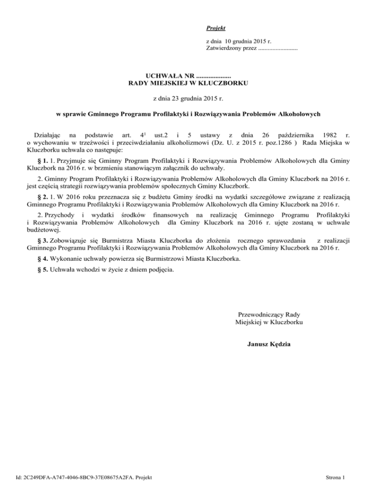 Projekt z dnia 10 grudnia 2015 r. Zatwierdzony przez ......................... UCHWAŁA NR .................... RADY MIEJSKIEJ W KLUCZBORKU z dnia 23 grudnia 2015 r. w sprawie Gminnego Programu Profilaktyki i Rozwiązywania Problemów Alkoholowych Działając na podstawie art. 41 ust.2 i 5 ustawy z dnia 26 października 1982 r. o wychowaniu w trzeźwości i przeciwdziałaniu alkoholizmowi (Dz. U. z 2015 r. poz.1286 ) Rada Miejska w Kluczborku uchwala co następuje: § 1. 1. Przyjmuje się Gminny Program Profilaktyki i Rozwiązywania Problemów Alkoholowych dla Gminy Kluczbork na 2016 r. w brzmieniu stanowiącym załącznik do uchwały. 2. Gminny Program Profilaktyki i Rozwiązywania Problemów Alkoholowych dla Gminy Kluczbork na 2016 r. jest częścią strategii rozwiązywania problemów społecznych Gminy Kluczbork. § 2. 1. W 2016 roku przeznacza się z budżetu Gminy środki na wydatki szczegółowe związane z realizacją Gminnego Programu Profilaktyki i Rozwiązywania Problemów Alkoholowych dla Gminy Kluczbork na 2016 r. 2. Przychody i wydatki środków finansowych na realizację Gminnego Programu Profilaktyki i Rozwiązywania Problemów Alkoholowych dla Gminy Kluczbork na 2016 r. ujęte zostaną w uchwale budżetowej. § 3. Zobowiązuje się Burmistrza Miasta Kluczborka do złożenia rocznego sprawozdania z realizacji Gminnego Programu Profilaktyki i Rozwiązywania Problemów Alkoholowych dla Gminy Kluczbork na 2016 r. § 4. Wykonanie uchwały powierza się Burmistrzowi Miasta Kluczborka. § 5. Uchwała wchodzi w życie z dniem podjęcia. Przewodniczący Rady Miejskiej w Kluczborku Janusz Kędzia Id: 2C249DFA-A747-4046-8BC9-37E08675A2FA. Projekt Strona 1 Załącznik do uchwały Nr………………. Rady Miejskiej w Kluczborku z dnia ………………… 2015r. Załącznik do Uchwały Nr .................... Rady Miejskiej w Kluczborku z dnia 23 grudnia 2015 r. GMINNY PROGRAM PROFILAKTYKI I ROZWIĄZYWANIA PROBLEMÓW ALKOHOLOWYCH DLA GMINY KLUCZBORK NA 2016r. Kluczbork, grudzień 2015 r. Id: 2C249DFA-A747-4046-8BC9-37E08675A2FA. Projekt Strona 2 I. Wprowadzenie Gminny Program Profilaktyki i Rozwiązywania Problemów Alkoholowych stanowi lokalną strategię w zakresie profilaktyki oraz minimalizacji szkód społecznych i indywidualnych wynikających z używania alkoholu. Program określa kierunki podejmowania działań w zakresie profilaktyki i rozwiązywania problemów alkoholowych, wskazuje podmioty odpowiedzialne za ich realizację, określa źródła finansowania tych zadań, przedstawia również zadania własne gminy wynikające z art. 4¹ ustawy z dnia 26 października 1982 r. o wychowaniu w trzeźwości i przeciwdziałaniu alkoholizmowi. Zgodnie z art. 41 cytowanej wyżej ustawy, prowadzenie działań w tym zakresie należy do zadań własnych gminy i realizowane jest w postaci gminnego programu profilaktyki i rozwiązywania problemów alkoholowych, stanowiącego część gminnej strategii integracji i polityki społecznej. W szczególności zadania te obejmują: - zwiększanie dostępności pomocy terapeutycznej i rehabilitacyjnej dla osób uzależnionych od alkoholu, - udzielanie rodzinom, w których występują problemy alkoholowe, pomocy psychospołecznej i prawnej, a w szczególności ochrony przed przemocą w rodzinie, - prowadzenie profilaktycznej działalności informacyjnej i edukacyjnej w zakresie rozwiązywania problemów alkoholowych i przeciwdziałania narkomanii, w szczególności dla dzieci i młodzieży … - wspomaganie działalności instytucji, stowarzyszeń i osób fizycznych, służącej rozwiązywaniu problemów alkoholowych, - podejmowanie interwencji w związku z naruszeniem przepisów określonych w art. 131i 15 ustawy oraz występowanie przed sądem w charakterze oskarżyciela publicznego, - wspieranie zatrudnienia socjalnego poprzez organizowanie i finansowanie centrów integracji społecznej. Zgodnie z treścią tej ustawy zadania związane z profilaktyką i rozwiązywaniem problemów alkoholowych wykonuje się w szczególności przez: tworzenie warunków sprzyjających realizacji potrzeb, których zaspokajanie motywuje powstrzymywanie się od spożywania alkoholu; działalność wychowawczą i informacyjną; ograniczanie dostępności alkoholu; leczenie, rehabilitację i reintegrację osób uzależnionych od alkoholu; zapobieganie negatywnym następstwom nadużywania alkoholu i ich usuwanie oraz przeciwdziałanie przemocy w rodzinie. Na zadaniach tych należy skupić szczególną uwagę, dlatego że problemy związane z alkoholem należą do tej grupy problemów społecznych, które przybierają bardzo duże rozmiary i powodują szkody zarówno ekonomiczne, jak i społeczne. W związku z powyższym, celem działań podejmowanych przez gminę jest zmniejszenie różnych problemów powodowanych przez alkohol w całej populacji, a nie tylko w grupie podwyższonego ryzyka, ponieważ na szkody związane z alkoholem narażony jest każdy mieszkaniec gminy, niezależnie od tego czy pije alkohol, czy nie. Realizując gminny program należy bezwzględnie przestrzegać ustawowego wymogu, aby każde zadanie, wpisane do gminnego programu miało związek z profilaktyką i rozwiązywaniem problemów alkoholowych, ponieważ tylko na takie zadania mogą być wydatkowane środki pochodzące z opłat za korzystanie z zezwoleń na sprzedaż napojów alkoholowych. Id: 2C249DFA-A747-4046-8BC9-37E08675A2FA. Projekt Strona 3 Podstawową rolą Gminy w ramach realizacji gminnego programu profilaktyki i rozwiązywania problemów alkoholowych będzie inspirowanie i wspieranie bezpośrednich realizatorów konkretnych zadań w ramach określonych możliwości finansowych. 1. Elementy diagnostyczne – osoby uzależnione od alkoholu. Zrealizowane w Polsce badania epidemiologiczne (2012r.) pozwalają szacować liczbę osób uzależnionych między 600 a 900 tys.(ok. 1.5%-3%), a pijących alkohol szkodliwie – na około 2,5 mln a w niektórych okresach czasu nawet do około 4 