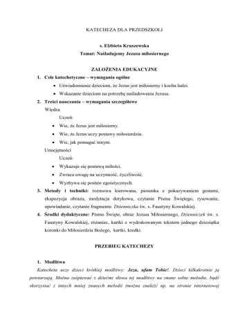 KATECHEZA DLA PRZEDSZKOLI s. Elżbieta Kruszewska Temat: Naśladujemy Jezusa miłosiernego ZAŁOŻENIA EDUKACYJNE 1. Cele katechetyczne – wymagania ogólne Uświadomienie dzieciom, że Jezus jest miłosierny i kocha ludzi. Wskazanie dzieciom na potrzebę naśladowania Jezusa. 2. Treści nauczania – wymagania szczegółowe Wiedza Uczeń: Wie, że Jezus jest miłosierny. Wie, że Jezus uczy postawy miłosierdzia. Wie, jak pomagać innym. Umiejętności Uczeń: Wykazuje się postawą miłości. Zwraca uwagę na uczynność, życzliwość. Wyzbywa się postaw egoistycznych. 3. Metody i techniki: rozmowa kierowana, piosenka z pokazywaniem gestami, ekspozycja obrazu, medytacja dotykowa, czytanie Pisma Świętego, rysowanie, opowiadanie, czytanie fragmentu Dzienniczka św. s. Faustyny Kowalskiej. 4. Środki dydaktyczne: Pismo Święte, obraz Jezusa Miłosiernego, Dzienniczek św. s. Faustyny Kowalskiej, różaniec, kartki z wydrukowanym tekstem jednego dziesiątka koronki do Miłosierdzia Bożego, kartki, kredki. PRZEBIEG KATECHEZY 1. Modlitwa Katecheta uczy dzieci krótkiej modlitwy: Jezu, ufam Tobie!. Dzieci kilkakrotnie ją powtarzają. Można zaśpiewać z dziećmi słowa tej modlitwy na znane sobie melodie, bądź skorzystać z innych mniej znanych melodii (można znaleźć np. na stronie internetowej www.jezuufamtobie.pl/piosenki.php). Można także nauczyć dzieci prostych gestów podczas śpiewania (np. Jezu – dzieci podnoszą do góry prawą rękę, ufam – podnoszą obie ręce na wysokość ramion, Tobie – podnoszą obie ręce do góry). 2. Nawiązanie do tematu Katecheta pokazuje dzieciom obraz Jezusa Miłosiernego (najlepiej gdyby był on duży) a następnie pyta dzieci: Kto jest na tym obrazie? Jak wygląda? Co jest najważniejsze w tym obrazie? (gdyby dzieci nieprawidłowo odpowiedziały no to pytanie, Katecheta naprowadza dzieci tak, by zrozumiały, że centrum obrazu stanowi Serce Jezusa z dwoma wytryskującymi promieniami). Do czego Jezusowi potrzebne jest Serce? (Katecheta tak prowadzi rozmowę z dziećmi, by zrozumiały, że Jezus, Sercem kocha swojego Ojca i wszystkich ludzi). 3. Sytuacja egzystencjalna Katecheta prosi, by każde z dzieci podeszło do obrazu i przytuliło się do przebitego Serca Jezus (gdy obraz jest wystarczająco duży). Gdy obrazek jest mały dzieci mogą przytulić go do policzka lub do serca. Katecheta mówi dzieciom: Ten właśnie obraz Pana Jezusa, do którego przytulaliście się będzie niedługo odwiedzał nasze rodziny, gdy zobaczycie takiego Pana Jezusa znowu będziecie mogli się przytulić. Katecheta tak ustawia obraz, by był widoczny dla dzieci w czasie całej katechezy. 4. Wyjaśnienie głównych prawd katechezy Katecheta mówi dzieciom: Pan Jezus nie tylko teraz przychodzi, aby nas odwiedzić, ale gdy żył na ziemi też chodził po swoim kraju i uzdrawiał ludzi chorych, pomagał potrzebującym pomocy, dał pożywienie głodnym i był dobry dla wszystkich, których spotykał. Katecheta pokazuje dzieciom Pismo Święte i mówi: Mam w rękach najważniejszą księgę na świecie, są w niej spisane Słowa Boga do ludzi. Jak się nazywa ta księga? Teraz przeczytam wam fragment Pisma Świętego opowiadający o dobrych czynach Pana Jezusa: Kiedy [Jezus] zbliżał się do Jerycha, jakiś niewidomy siedział przy drodze, żebrząc. 2 Gdy usłyszał przechodzący tłum, pytał, co się dzieje. Powiedzieli mu, że Jezus Nazarejczyk przechodzi. Wtedy powiedział: „Jezusie, Synu Dawida, zmiłuj się nade mną!”. Ci, którzy szli z przodu, nalegali, by zamilkł, ale on jeszcze głośniej krzyczał: „Synu Dawida, zmiłuj się nade mną!”. Jezus zatrzymał się i kazał go do siebie przyprowadzić. Gdy on się zbliżył, zapytał go: „Co chcesz, abym ci uczynił?”. Odpowiedział: „Panie żebym przejrzał”. Jezus odrzekł: „Przejrzyj, twoja wiara cię uzdrowiła”. Natychmiast przejrzał i szedł za nim chwaląc Boga (Łk 18, 35-43a). Katecheta pyta dzieci: Dlaczego żebrak spod miasta Jerycha był nieszczęśliwy? O co prosił Jezusa? Co Jezus mu uczynił? Dlaczego Jezus to uczynił? Cała ta historia pokazuje nam, że Jezus jest dobry, miłosierny i kocha nas tak samo, jak tego biednego żebraka. Teraz odwdzięczymy się Panu Jezusowi za Jego miłość. Katecheta rozdaje dzieciom kartki i mówi: Na tych kartkach wszyscy rysujemy wielkie serce. To serce będzie znakiem naszej miłości do Pana Jezusa. Po namalowaniu serc Katecheta komentuje: Teraz składamy nasze serca przed obrazem Pana Jezusa i mówimy Mu jak bardzo go kochamy. Katecheta opowiada dzieciom o objawieniach Jezusa św. s. Faustynie: Czasem bywa tak, że Jezus, który jest w niebie przychodzi na ziemię i pokazuję się jakiejś osobie. Pewnego razu Jezus przyszedł do siostry zakonnej, która miała ona na imię Faustyna. Jezus wyglądał tak jak na tym obrazie. Jedną rękę miał wzniesioną, jak do błogosławieństwa, a drugą dotykał szaty, z której wychodziły dwa promienie, blady i czerwony. Jezus prosił, by s. Faustyna powiedziała wszystkim ludziom, że Bóg jest dobry, miłosierny, że kocha wszystkich ludzi, przebacza grzechy, które popełniają, jeśli przepraszają Boga i nie chcą więcej źle czynić. Pan Jezus mówił też, że ludzie mają być dobrzy dla siebie nawzajem tak, jak On jest dobry dla wszystkich ludzi. W tym miejscu katechezy, jeżeli czas pozwoli, można powiedzieć o Dzienniczku św. s. Faustyny i przeczytać jego fragment. Katecheta pokazuje dzieciom ”Dzienniczek” i mówi: 3 Mam dzisiaj dla was taką wyjątkowa książkę, jest w niej opisane, w jaki sposób Jezus objawiał się s. Faustynie i co do niej mówił. Przeczytam wam teraz kilka zdań: „Jezus w postaci ubogiego młodzieńca dziś przyszedł do furty. Wynędzniały młodzieniec, w strasznie podartym ubraniu, boso i z odkrytą głową, bardzo był zmarznięty, bo dzień był dżdżysty i chłodny. Prosił coś gorącego zjeść. Jednak [gdy] poszłam do kuch