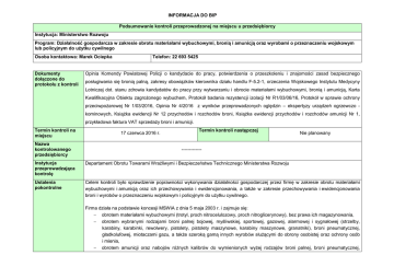 INFORMACJA DO BIP Podsumowanie kontroli przeprowadzonej na miejscu u przedsiębiorcy Instytucja: Ministerstwo Rozwoju Program: Działalność gospodarcza w zakresie obrotu materiałami wybuchowymi, bronią i amunicją oraz wyrobami o przeznaczeniu wojskowym lub policyjnym do użytku cywilnego Osoba kontaktowa: Marek Ociepka Dokumenty dołączone do protokołu z kontroli Telefon: 22 693 5425 Opinia Komendy Powiatowej Policji o kandydacie do pracy, potwierdzenia o przeszkoleniu i znajomości zasad bezpiecznego posługiwania się bronią palną, zakresy obowiązków kierownika działu handlu F-5.2-1, orzeczenia Wojskowego Instytutu Medycyny Lotniczej dot. stanu zdrowia kandydatów do pracy przy wytwarzaniu i obrocie materiałami wybuchowymi, bronią i amunicją, Karta Kwalifikacyjna Obiektu zagrożonego wybuchem, Protokół badania rezystencji izolacji Nr R1/03/06/16, Protokół w sprawie ochrony przeciwpożarowej Nr 1/03/2016, Opinia Nr 4/2016 z wyników przeprowadzonych oględzin – ekspertyzy urządzeń ogrzewczo kominowych, Książka ewidencji Nr 12 przychodów i rozchodów broni, Książka ewidencji przychodów i rozchodów amunicji Nr 1, przykładowa faktura VAT sprzedaży broni i amunicji. Termin kontroli na miejscu Nazwa kontrolowanego przedsiębiorcy 17 czerwca 2016 r. Termin kontroli następczej Nie planowany ------------- Instytucja przeprowadzająca kontrolę Departament Obrotu Towarami Wrażliwymi i Bezpieczeństwa Technicznego Ministerstwa Rozwoju Ustalenia pokontrolne Celem kontroli było sprawdzenie poprawności wykonywania działalności gospodarczej przez firmę w zakresie obrotu materiałami wybuchowymi i amunicją oraz ich przechowywania i ewidencjonowania, a także w zakresie przechowywania i ewidencjonowania broni i wyrobów o przeznaczeniu wojskowym i policyjnym do użytku cywilnego. Firma działa na podstawie koncesji MSWiA z dnia 5 maja 2003 r. i zajmuje się: − obrotem materiałami wybuchowymi (trotyl, proch nitrocelulozowy, proch nitroglicerynowy), bez prawa ich magazynowania, − obrotem wybranymi rodzajami broni palnej bojowej, myśliwskiej, sportowej, gazowej, alarmowej i sygnałowej (strzelby, karabiny, karabinki, rewolwery, pistolety, pistolety maszynowe, karabiny maszynowe, granatniki), broni pneumatycznej, gładkolufowej, miotaczami gazu, a także szeroką gamą innych wyrobów służącymi do obrony osobistej oraz ochrony osób i mienia, − obrotem amunicji oraz nabojów różnych kalibrów do wymienionych wyżej rodzajów broni palnej, broni pneumatycznej, gładkolufowej itp., obrotem wyrobami o przeznaczeniu wojskowym lub policyjnym (elementy wyposażenia osobistego żołnierza/policjanta, symulatory działania broni strzeleckiej, celownikami do broni i szeregiem innych tego rodzaju wyrobów, − pośrednictwem przy obrocie technologią o przeznaczeniu wojskowym lub policyjnym, − wytwarzaniem istotnych części broni palnej w ramach usług rusznikarskich. W trakcie kontroli sprawdzono: − dokumentację potwierdzającą stosowane w Spółce procedury weryfikacji pracowników pod kątem bezpieczeństwa na przykładzie wybranej osoby, − wyposażenie, sposób wykorzystywania oraz zasady bezpiecznej eksploatacji, a także stan bieżący magazynów bazowych, − sposób dokumentowania operacji kupna/sprzedaży w postaci faktur VAT wraz z dołączonymi (w przypadku takiej potrzeby) imiennymi zaświadczeniami uprawniającymi do nabycia broni, − sposób ewidencjonowania przychodów i rozchodów broni bojowej oraz amunicji, − sposób prezentacji oraz sprzedaży broni i amunicji w sklepie firmowym, a także stosowane w związku z tymi zasady − bezpieczeństwa. Zalecenia pokontrolne Bez zastrzeżeń. W trakcie prowadzonej kontroli nie stwierdzono nieprawidłowości w obszarach działalności Spółki będących przedmiotem kontroli, mogących skutkować powstaniem zagrożenia dla życia i zdrowia ludzkiego, mienia oraz środowiska naturalnego. W wyniku przeprowadzonej kontroli wysłuchano szereg postulatów, mogących posłużyć za zalecenia pokontrolne do wprowadzenia zmian w zakresie modyfikacji obowiązujących przepisów prawnych: − zniesienie obowiązku przestrzeliwania 3-ma nabojami każdej sztuki broni przed zawarciem transakcji jej sprzedaży. Procedura ta – rodząca określone koszty i powodująca zaangażowanie służb policyjnych, które muszą być obecne podczas przestrzeliwania broni – w praktyce nie przyczynia się do łatwiejszej identyfikacji broni wykorzystanej w działalności przestępczej. Po pierwsze wynika to z faktu, iż łatwo jest spowodować, że iglica broni oraz komora nabojowa pozostawiać będą zmienione ślady na łusce w stosunku do śladów uzyskanych podczas przestrzeliwania broni. Po drugie, przestrzelone łuski wraz z ich opisem są przechowywane w zbiorczych opakowaniach, co przy braku elektronicznego systemu ewidencji tych łusek utrudnia znacznie ich odnalezienie w celu wykorzystania do celów procesowych. Między innymi, ze wskazanych wyżej powodów, w wielu krajach, w tym w USA, odstąpiono od procedury przestrzeliwania broni w celu jej identyfikacji w razie wykorzystania w działalności przestępczej, − firmy realizujące obrót bronią nie mają możliwości szybkiej weryfikacji wiarygodności przedstawianych przez nabywców dokumentów zezwalających na posiadanie broni; wskazana byłaby szybka weryfikacja firmy przez organ koncesyjny lub Policję .