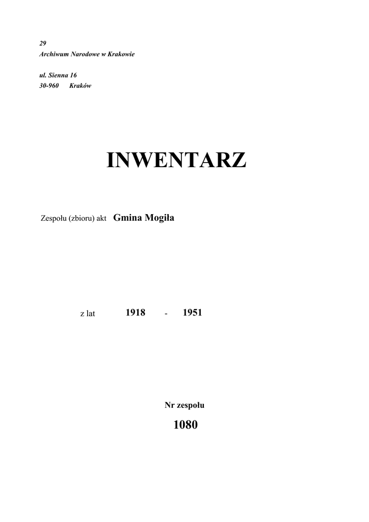29 Archiwum Narodowe w Krakowie ul. Sienna 16 30-960 Kraków INWENTARZ Zespołu (zbioru) akt z lat Gmina Mogiła 1918 - 1951 Nr zespołu 1080 Akta gmin jednostkowych Czyżyny Tytuł\Treść: Księga protokołów z posiedzeń Rady Gminnej Sygnatura: Gm Mo 1 Daty: 1918-1934 Opis j.a.: księga; ; ; ; ; Sygnatury dawne: Znak teczki: Uwagi: Gmina zbiorowa powstała w 1935 r., zlikwidowana w 1950 r. Księga protokolów z posiedzeń Zarządu Gminnego Tytuł\Treść: Nr 3: Księga protokołów z posiedzeń Zarządu Gminnego Sygnatura: Gm Mo 10 Daty: 1945-1945 Opis j.a.: księga; ; ; ; ; Sygnatury dawne: Znak teczki: Uwagi: Księga protokołów z posiedzeń Zarządu Gminnego Tytuł\Treść: Nr 3: a) Protokoły z posiedzeń Zarządu Gminnego (1947-1949) b) Protokoły z zebrań gromadzkich w Bieńczycach i Krzesławicach (1946) Sygnatura: Gm Mo 11 Daty: 1946-1949 Opis j.a.: akta luźne; ; ; ; ; Sygnatury dawne: Znak teczki: Uwagi: Księga protokołów z zebrań Komisji Gospodarczej Tytuł\Treść: Nr 3: Księga protokołów z zebrań gromadzkich oraz zebrań Gromadzkiej Komisji Gospodarczej i Komitetu Elektryfikacyjnego w Pleszowie Sygnatura: Gm Mo 12 Daty: 1946-1951 Opis j.a.: księga; ; ; ; ; Sygnatury dawne: Znak teczki: Uwagi: Dział finansowo - budżetowy Nr zespołu: 1080 Strona 1 Tytuł\Treść: Nr 8: Budżet gminy (1949) Nr 9: Statuty podatków i opłat gminnych (1946) Sygnatura: Gm Mo 13 Daty: 1946-1949 Opis j.a.: akta luźne; ; ; ; ; Sygnatury dawne: Znak teczki: Uwagi: Dział finansowo - budżetowy Tytuł\Treść: Nr 9 i 12: Rejestr gospodarstw rolnych i wymiaru podatku gruntownego gromady Prusy Sygnatura: Gm Mo 14 Daty: 1950-1950 Opis j.a.: księga; ; ; ; ; Sygnatury dawne: Znak teczki: Uwagi: Dział finansowo - budżetowy Tytuł\Treść: Nr 9: Arkusze wymiarowe podatku od nieruchomości w miejscowości Bieńczyce Sygnatura: Gm Mo 15 Daty: 1933-1949 Opis j.a.: akta luźne; ; ; ; ; Sygnatury dawne: Znak teczki: Uwagi: Dział finansowo - budżetowy Tytuł\Treść: Nr 9: Arkusze wymiarowe podatku od nieruchomości w miejscowości Bieńczyce Sygnatura: Gm Mo 16 Daty: 1933-1949 Opis j.a.: akta luźne; ; ; ; ; Sygnatury dawne: Znak teczki: Uwagi: Dział finansowo - budżetowy Tytuł\Treść: Nr 9: Arkusze wymiarowe podatku od nieruchomości w miejscowości Krzesławice Sygnatura: Gm Mo 17 Daty: 1933-1949 Opis j.a.: akta luźne; ; ; ; ; Sygnatury dawne: Znak teczki: Uwagi: Dział finansowo - budżetowy Nr zespołu: 1080 Strona 2 Tytuł\Treść: Nr 9: Arkusze wymiarowe podatku od nieruchomości w miejscowości Krzesławice Sygnatura: Gm Mo 18 Daty: 1934-1939 Opis j.a.: akta luźne; ; ; ; ; Sygnatury dawne: Znak teczki: Uwagi: Dział finansowo - budżetowy Tytuł\Treść: Nr 9: Arkusze wymiarowe podatku od nieruchomości w miejscowości Mogiła Sygnatura: Gm Mo 19 Daty: 1934-1948 Opis j.a.: akta luźne; ; ; ; ; Sygnatury dawne: Znak teczki: Uwagi: Numery domów 3-161 Akta gminy zbiorowej Akta do 1945r. Tytuł\Treść: Nr 11: Dziennik kasowy gminy ( 1922-1935) i gromady (1935-1939) Czyżyny Sygnatura: Gm Mo 2 Daty: 1922-1939 Opis j.a.: księga; ; ; ; ; Sygnatury dawne: Znak teczki: Uwagi: Dział finansowo - budżetowy Tytuł\Treść: Nr 9: Arkusze wymiarowe podatku od nieruchomości w miejscowości Mogiła Sygnatura: Gm Mo 20 Daty: 1933-1950 Opis j.a.: akta luźne; ; ; ; ; Sygnatury dawne: Znak teczki: Uwagi: Numery domów 162-220 Dział finansowo - budżetowy Tytuł\Treść: Nr 9: Arkusze wymiarowe podatku od nieruchomości w miejscowości Mogiła Sygnatura: Gm Mo 21 Daty: 1934-1950 Opis j.a.: akta luźne; ; ; ; ; Sygnatury dawne: Znak teczki: Uwagi: Numery domów 223-289; budunki bez numerów Dział finansowo - budżetowy Nr zespołu: 1080 Strona 3 Tytuł\Treść: Nr 9: a) Arkusze wymiarowe podatku od nieruchomości w miejscowości Grębałów (19401949) b) Arkusze wymiarowe podatku od nieruchomości w miejscowości Kantorowice (1944-1949) c) Arkusze wymiarowe podatku od nieruchomości w miejscowości Lubocza (19481949) d) Arkusze wymiarowe podatku od nieruchomości w miejscowości Mistrzejowice (1945-1949) e) Arkusze wymiarowe podatku od nieruchomości w miejscowości Pleszów (19471948) f) Arkusze wymiarowe podatku od nieruchomości w miejscowości Prusy (19471948) g) Arkusze wymiarowe podatku od nieruchomości w miejscowości Zesławice (19341949) h) Spisy budynków do wymiaru podatku od nieruchomości w miejscowościach: Bieńczyce, Kantorowice, Krzesławice, Zesławice (1938-1944) Sygnatura: Gm Mo 22 Daty: 1934-1949 Opis j.a.: akta luźne; ; ; ; ; Sygnatury dawne: Znak teczki: Uwagi: Dział gospodarki gminnej Tytuł\Treść: Nr 18: a) Akty notarialne dotyczące obrotu ziemią (1932-49) b) Arkusze posiadłości gruntowej mieszkańców gminy (1920-1950) Sygnatura: Gm Mo 23 Daty: 1920-1950 Opis j.a.: akta luźne; ; ; ; ; Sygnatury dawne: Znak teczki: Uwagi: Dział administracyjno - społeczny Tytuł\Treść: Nr 22: Walka z analfabetyzmem Sygnatura: Gm Mo 24 Daty: 1949-1950 Opis j.a.: akta luźne; ; ; ; ; Sygnatury dawne: Znak teczki: Uwagi: Dział administracyjny /sprawy poruszone/ Nr zespołu: 1080 Strona 4 Tytuł\Treść: Nr 27: Spis uprawnionych do udziału w Referendum Ludowym z gromady Lubocza (1946) Nr 34: a) Plany budynków młyna Polskich Zakładów Zbożowym w Bieńczycach (1949) b) Plan rzeźni w Mogile (1949-1950) Nr 38: Obchody uroczystości oficjalnych (1949) Sygnatura: Gm Mo 25 Daty: 1946-1949 Opis j.a.: akta luźne; ; ; ; ; Sygnatury dawne: Znak teczki: Uwagi: Akta gminnych instytucji i organizacji społecznych Tytuł\Treść: 1. Akta Gminnego Komitetu Opieki Społecznej w Mogile (1945) 2. Akta Gminnego Komitetu Obrońców Pokoju w Mogile (1950) 3. Akta Towarzystwa Budowy Szkół w gminie Mogiła (1947) 4. Akta Towarzystwa Przyjaciół Żołnierza w gminie Mogila (1947-1948) Sygnatura: Gm Mo 26 Daty: 1945-1950 Opis j.a.: akta luźne; ; ; ; ; Sygnatury dawne: Znak teczki: Uwagi: Dział administacyjny /sprawy poruczone/ Tytuł\Treść: Nr 29: Rejestr wydanych kart rozpoznawczych 