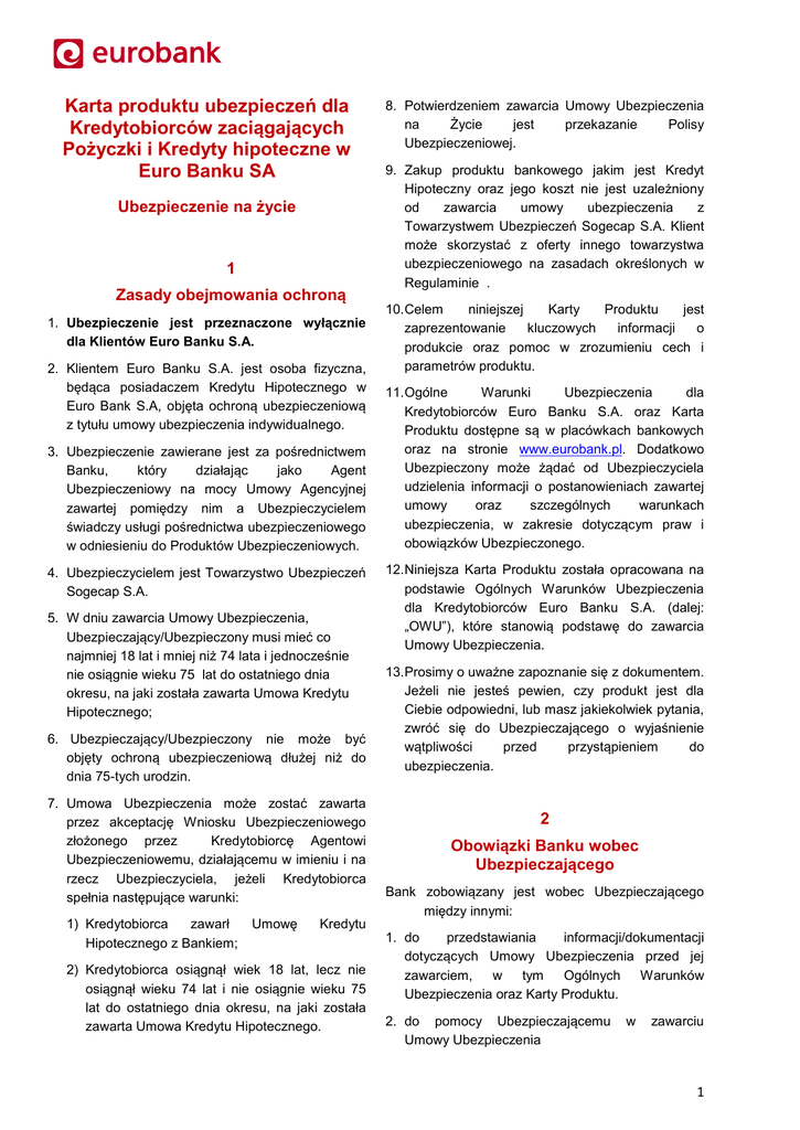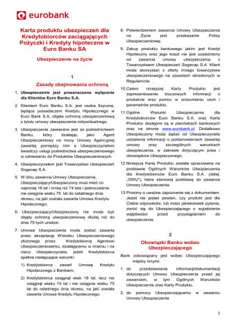 Karta produktu ubezpieczeń dla Kredytobiorców zaciągających Pożyczki i Kredyty hipoteczne w Euro Banku SA Ubezpieczenie na życie 1 Zasady obejmowania ochroną 1. Ubezpieczenie jest przeznaczone wyłącznie dla Klientów Euro Banku S.A. 2. Klientem Euro Banku S.A. jest osoba fizyczna, będąca posiadaczem Kredytu Hipotecznego w Euro Bank S.A, objęta ochroną ubezpieczeniową z tytułu umowy ubezpieczenia indywidualnego. 3. Ubezpieczenie zawierane jest za pośrednictwem Banku, który działając jako Agent Ubezpieczeniowy na mocy Umowy Agencyjnej zawartej pomiędzy nim a Ubezpieczycielem świadczy usługi pośrednictwa ubezpieczeniowego w odniesieniu do Produktów Ubezpieczeniowych. 4. Ubezpieczycielem jest Towarzystwo Ubezpieczeń Sogecap S.A. 5. W dniu zawarcia Umowy Ubezpieczenia, Ubezpieczający/Ubezpieczony musi mieć co najmniej 18 lat i mniej niż 74 lata i jednocześnie nie osiągnie wieku 75 lat do ostatniego dnia okresu, na jaki została zawarta Umowa Kredytu Hipotecznego; 6. Ubezpieczający/Ubezpieczony nie może być objęty ochroną ubezpieczeniową dłużej niż do dnia 75-tych urodzin. 7. Umowa Ubezpieczenia może zostać zawarta przez akceptację Wniosku Ubezpieczeniowego złożonego przez Kredytobiorcę Agentowi Ubezpieczeniowemu, działającemu w imieniu i na rzecz Ubezpieczyciela, jeżeli Kredytobiorca spełnia następujące warunki: 1) Kredytobiorca zawarł Hipotecznego z Bankiem; Umowę Kredytu 2) Kredytobiorca osiągnął wiek 18 lat, lecz nie osiągnął wieku 74 lat i nie osiągnie wieku 75 lat do ostatniego dnia okresu, na jaki została zawarta Umowa Kredytu Hipotecznego. 8. Potwierdzeniem zawarcia Umowy Ubezpieczenia na Życie jest przekazanie Polisy Ubezpieczeniowej. 9. Zakup produktu bankowego jakim jest Kredyt Hipoteczny oraz jego koszt nie jest uzależniony od zawarcia umowy ubezpieczenia z Towarzystwem Ubezpieczeń Sogecap S.A. Klient może skorzystać z oferty innego towarzystwa ubezpieczeniowego na zasadach określonych w Regulaminie . 10. Celem niniejszej Karty Produktu jest zaprezentowanie kluczowych informacji o produkcie oraz pomoc w zrozumieniu cech i parametrów produktu. 11. Ogólne Warunki Ubezpieczenia dla Kredytobiorców Euro Banku S.A. oraz Karta Produktu dostępne są w placówkach bankowych oraz na stronie www.eurobank.pl. Dodatkowo Ubezpieczony może żądać od Ubezpieczyciela udzielenia informacji o postanowieniach zawartej umowy oraz szczególnych warunkach ubezpieczenia, w zakresie dotyczącym praw i obowiązków Ubezpieczonego. 12. Niniejsza Karta Produktu została opracowana na podstawie Ogólnych Warunków Ubezpieczenia dla Kredytobiorców Euro Banku S.A. (dalej: „OWU”), które stanowią podstawę do zawarcia Umowy Ubezpieczenia. 13. Prosimy o uważne zapoznanie się z dokumentem. Jeżeli nie jesteś pewien, czy produkt jest dla Ciebie odpowiedni, lub masz jakiekolwiek pytania, zwróć się do Ubezpieczającego o wyjaśnienie wątpliwości przed przystąpieniem do ubezpieczenia. 2 Obowiązki Banku wobec Ubezpieczającego Bank zobowiązany jest wobec Ubezpieczającego między innymi: 1. do przedstawiania informacji/dokumentacji dotyczących Umowy Ubezpieczenia przed jej zawarciem, w tym Ogólnych Warunków Ubezpieczenia oraz Karty Produktu. 2. do pomocy Ubezpieczającemu Umowy Ubezpieczenia w zawarciu 1 3. w przypadku wystąpienia Zdarzenia Ubezpieczeniowego, do informowania osób zgłaszających roszczenie o dokumentach i informacjach, które należy dostarczyć zgodnie z Ogólnymi Warunkami Ubezpieczenia. zależności od tego, które zdarzenie wystąpi pierwsze. Wariant ten dostępny jest dla pojedynczych Kredytobiorców oraz dla 2, 3 lub 4 Współkredytobiorców związanych z tym samym Kredytem Hipotecznym. Jeżeli ochrona świadczona jest kilku Współkredytobiorców, Suma Ubezpieczenia ustalana jest odrębnie dla każdego ze Współkredytobiorców, zaś świadczenie wypłacane jest w przypadku zajścia Zdarzenia Ubezpieczeniowego odrębnie dla każdego Współkredytobiorcy. 3 Przedmiot i zakres ubezpieczenia 1. Przedmiotem Umowy Ubezpieczenia jest życie i zdrowie Ubezpieczonego. 2. W ramach Umowy Ubezpieczenia ochroną ubezpieczeniową objęte są następujące zdarzenia: Śmierć (w tym Śmierć wskutek Nieszczęśliwego Wypadku lub Śmierć wskutek Nieszczęśliwego Wypadku Komunikacyjnego) oraz Trwała i Całkowita Niezdolność do Pracy w zależności od wybranego Wariantu. 3. Kredytobiorcom Warianty: 1) oferowane są następujące Wariant 2 obejmuje zdarzenia Śmierci (z wyłączeniem Śmierci wskutek Nieszczęśliwego Wypadku Komunikacyjnego) oraz Trwałej Całkowitej Niezdolności do Pracy lub Nieszczęśliwego Wypadku – w zależności od tego, które zdarzenie wystąpi pierwsze. Opcja ta dostępna jest dla pojedynczych Kredytobiorców oraz dla Współkredytobiorców, jednak nie więcej niż 4 Współkredytobiorców związanych z tym samym Kredytem Hipotecznym. Jeżeli ochrona świadczona jest kilku Współkredytobiorców, Suma Ubezpieczenia ustalana jest odrębnie dla każdego ze Współkredytobiorców, zaś świadczenie wypłacane jest w przypadku zajścia Zdarzenia Ubezpieczeniowego odrębnie dla każdego Współkredytobiorcy. 2) 3) Wariant 3 obejmuje zdarzenia Śmierci (w tym Śmierci wskutek Nieszczęśliwego Wypadku Komunikacyjnego) lub Trwałej Całkowitej Niezdolności do Pracy. w zależności od tego, dla którego z nich wystąpi pierwsze zdarzenie ubezpieczeniowe. Wariant ten dostępny jest dla 2 Współkredytobiorców w ramach jednej Umowy Kredytu Hipotecznego. Suma Ubezpieczenia ustalana jest łącznie dla wszystkich Współkredytobiorców, a świadczenie wypłacane jest jednorazowo – za Zdarzenie Ubezpieczeniowe, które zaszło najwcześniej, niezależnie od tego, którego Współkredytobiorcy dotyczy to zdarzenie, w wysokości 100% Sumy Ubezpieczenia. 4. Ochrona ubezpieczeniowa udzielana jest na całym świecie. 5. Uprawnionym do otrzymania świadczenia jest Bank. Wariant 2a obejmuje zdarzenia Ś