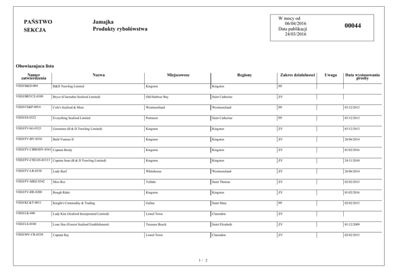 PAŃSTWO SEKCJA W mocy od 06/04/2016 Data publikacji 24/03/2016 Jamajka Produkty rybołówstwa 00044 Obowiazujaca lista Numer zatwierdzenia Nazwa Miejscowosc Regiony Zakres dzialalnosci Uwaga Data wystosowania prosby VSDJ/B&D-004 B&D Trawling Limited Kingston Kingston PP VSDJ/BRYCE-0309 Bryce (Clarendon Seafood Limited) Old Harbour Bay Saint Catherine ZV VSDJ/CS&P-0014 Cole's Seafood & More Westmoreland Westmoreland PP 03/12/2013 VSDJ/ES-0322 Everything Seafood Limited Portmore Saint Catherine PP 03/12/2013 VSDJ/FVAG-0325 Geronimo (B & D Trawling Limited) Kingston Kingston ZV 03/12/2013 VSDJ/FV-BV-0336 Bold Venture II Kingston Kingston ZV 26/06/2014 VSDJ/FV-CBRODY-0341 Captain Brody Kingston Kingston ZV 01/02/2016 VSDJ/FV-CSEAN-01313 Captain Sean (B & D Trawling Limited) Kingston Kingston ZV 24/11/2010 VSDJ/FV-LR-0338 Lady Reef Whitehouse Westmoreland ZV 26/06/2014 VSDJ/FV-MRZ-0342 Miss Rez Yallahs Saint Thomas ZV 02/02/2015 VSDJ/FV-RR-0200 Rough Rider Kingston Kingston ZV 01/02/2016 VSDJ/KC&T-0011 Knight's Commodity & Trading Galina Saint Mary PP 02/02/2015 VSDJ/LK-040 Lady Kim (Seafood Incorporated Limited) Lionel Town Clarendon ZV VSDJ/LS-0180 Lone Star (Forrest Seafood Establishment) Treasure Beach Saint Elizabeth ZV 01/12/2009 VSDJ/MV-CR-0330 Captain Raj Lionel Town Clarendon ZV 02/02/2015 1/ 2 Obowiazujaca lista Numer zatwierdzenia Nazwa Miejscowosc Regiony Zakres dzialalnosci Uwaga Data wystosowania prosby VSDJ/MVGER-0312 Anna G Tower Isle Saint Mary ZV 03/12/2013 VSDJ/RSFL-MV-ABII0329 Antony Boy II Kingston Kingston ZV 02/02/2015 VSDJ/RSL-0326 Rainforest Seafoods Limited Kingston Kingston PP 03/12/2013 VSDJ/TRE-009 Ton-Rick Enterprise Limited Yallahs Saint Thomas PP VSDJ/WEL-0332 Waterwheel Estate Limited Cave Westmoreland PP VSDJ/WJ-070 Windjammer (Ton-Rick Enterprise Limited) Yallahs Saint Thomas ZV VSDJ/WW-0302 Windy Weather (Branmar Investment Limited) Southfield Saint Elizabeth ZV Legenda dzialalnosci: PP Zakład przetwórstwa ZV Statek mroźnia 2/ 2 02/02/2015
