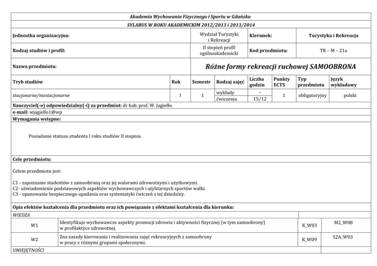 Akademia Wychowania Fizycznego i Sportu w Gdańsku SYLABUS W ROKU AKADEMICKIM 2012/2013 i 2013/2014 Jednostka organizacyjna: Wydział Turystyki i Rekreacji Kierunek: Rodzaj studiów i profil: II stopień profil ogólnoakademicki Kod przedmiotu: Turystyka i Rekreacja TR – M – 21a Różne formy rekreacji ruchowej SAMOOBRONA Nazwa przedmiotu: Tryb studiów Rok stacjonarne/niestacjonarne I Semestr 1 Rodzaj zajęć wykłady ćwiczenia Liczba godzin 15/12 Punkty ECTS 1 Typ przedmiotu obligatoryjny Język wykładowy polski Nauczyciel(-e) odpowiedzialny(-i) za przedmiot: dr hab. prof. W. Jagiełło e-mail: wjagiello1@wp Wymagania wstępne: Posiadanie statusu studenta I roku studiów II stopnia. Cele przedmiotu: Celem przedmiotu jest: C1 - zapoznanie studentów z samoobroną oraz jej walorami zdrowotnymi i użytkowymi. C2- uświadomienie podstawowych aspektów wychowawczych i utylitarnych sportów walki. C3 - opanowanie bezpiecznego upadania oraz systematyki ćwiczeń z tej dziedziny. Opis efektów kształcenia dla przedmiotu oraz ich powiązanie z efektami kształcenia dla kierunku: WIEDZA W1 Identyfikuje wychowawcze aspekty promocji zdrowia i aktywności fizycznej (w tym samoobrony) w profilaktyce zdrowotnej. K_W03 W2 Zna zasady kierowania i realizowania zajęć rekreacyjnych z samoobrony w pracy z różnymi grupami społecznymi. K_W09 UMIEJĘTNOŚCI M2_W08 S2A_W03 U1 Planuje zajęcia rekreacyjne z samoobrony w sposób uwzględniający ich zdrowotne i wychowawcze wartości. K_U03 U2 Demonstruje umiejętności ruchowe w obszarze samoobrony związanej z rekreacją. K_U05 U3 Posiada umiejętność wykorzystania zdobytej wiedzy z zakresu rekreacji (w tym z samoobrony) oraz krytyczną analizę skuteczności i przydatności stosowanej wiedzy w typowych sytuacjach zawodowych, do wyciągania wniosków oraz formułowania sądów. K_U06 K1 Rozumie potrzebę uczenia się przez całe życie i podejmuje samokształcenie. K_K01 K2 Reprezentuje postawę promującą zdrowie i aktywność fizyczną (w tym samoobronę), ze szczególnym uwzględnieniem aktywnego wypoczynku. K_K04 M2_U05, M2_U10 S2A_U07 M2_U11, S2A_U06 KOMPETENCJE M2_K01, S2A_K01 S2A_K06 M2_K05, S2A_K05 Kryteria i metody oceny osiągniętych efektów kształcenia W1 – odpowiedź ustna W2- odpowiedź ustna U1 – planowanie zajęć rekreacyjnych z samoobrony U2 – demonstracja poszczególnych technik rzutów, chwytów, uderzeń, kopnięć oraz technik obrony U3 – sprawdzian praktyczny ma formę kolokwium obejmującego demonstrację elementów zawartych w treściach kształcenia K1 - prowadzenie wybranych fragmentów zajęć w oparciu o opracowane konspekty K2 – przygotowanie konspektu zajęć Zaliczenie składa się z zademonstrowania poszczególnych elementów technicznych oraz wyjaśnienia kilku pojęć dowodzących znajomości realizowanych treści. Podczas demonstracji elementów technicznych zwraca się uwagę na poprawne wykonanie poszczególnych faz technik, dokładność wykonania oraz umiejętność ich „sytuacyjnego” zastosowania. Na ocenę wpływ ma także aktywność na zajęciach. Aby uzyskać zaliczenie przedmiotu na ocenę dostateczną student musi osiągnąć wszystkie wymienione w programie efekty kształcenia. Metody i formy realizacji przedmiotu: Zajęcia prowadzone w formie ćwiczeń praktycznych. Treści kształcenia: Wykłady: brak Ćwiczenia: 1. Teoretyczne podstawy samoobrony. 2. Podstawowe zabawowe formy walki oraz ich wykorzystanie w treningu sportów walki. 3. Podstawy techniki judo:postawy (shise), sposoby poruszania się na macie, wychylenia (kuzushi), sposoby chwytu za judoki (kumikata0, pady (ukemi), asekuracja współćwiczącego. 4. Wybrane rzuty: nożne (ashi – waza), biodowe (kosh – waza), ręczne (te – waza), z poświęceniem (sutemi – waza). 5. Techniki trzymań (osae – Komi – waza): podstawowe trzymanie opasujące (hon – kesa – gatame), górne trzymanie czworoboczne (kami – shiho – gatame), boczne trzymanie czworoboczne (osae – shiho – gatame), 6. Techniki duszeń (shime – waza): gołe duszenie (hadaka jime), duszenie przesuwanym kołnierzem (okuri jime). 7. Techniki dźwigni (kansetsu – waza): klucz na ramię (Ude – garami), dźwignia krzyżowa (Ude – hishigi – gatame), dźwignia z trzymaniem pod pachą (Ude – hishigi – Waki – gatame). 8. Wykorzystanie elementów judo w samoobronie. 9. Techniki uderzeń i kopnięć. 10. Techniki obrony przed chwytami, obchwytem, duszeniem, kopnięciem, uderzeniami. zaliczenie na ocenę. Forma zaliczenia: Literatura: Podstawowa: 1. 2. 3. 4. 5. Harasymowicz J., Kalina R. M.[ 2007]. Godziwa samoobrona. Teoretyczne i metodyczne podstawy treningu. Wydawnictwo NOVUM, Fundacja PMP. Historia Judo (tłum. Tyszkowski S). [1996]. Polski Związek Judo. Warszawa. Kalina R.M., Jagiełło W. [2000]: Zabawowe formy walki w wychowaniu fizycznym i treningu sportowym. AWF, Warszawa. Kirby George [1994]: Jujitsu: podstawowe techniki łagodnej sztuki. Przeł. A. Sarnecki Budo – Sport Warszawa. Ruszniak R., Zieniawa R. [2006]. Judo. Pomost pomiędzy tradycją a współczesnością. AWFiS w Gdańsku. Uzupełniająca: 1. 2. 3. Dmowski Z., Skubis J. [1976]: Zapasy. Judo. Warszawa: SiT. Kobayashi K., Sharp H.E. [1998]: Sportowe judo. Budo-Sport. Warszawa. Kondratowicz K. [1991]: Jiu – jitsu. Sztuka walki obronnej. Wydawnictwo „Czasopisma Wojskowe”. Bilans punktów ECTS (1 pkt ECTS – 25-30 godz. pracy studenta): Obciążenie studenta Aktywność Udział w ćwiczeniach Przygotowanie do kolokwium zaliczeniowego Przygotowanie konspektu zajęć Kolokwium zaliczeniowe Całkowite obciążenie pracą studenta Punkty ECTS za przedmiot Studia stacjonarne Studia niestacjonarne 15 godz. 5 godz. 4 godz. 1 godz. 25 godz. 12 godz. 7 godz. 5 godz. 1 godz. 25 godz. 1 ECTS
