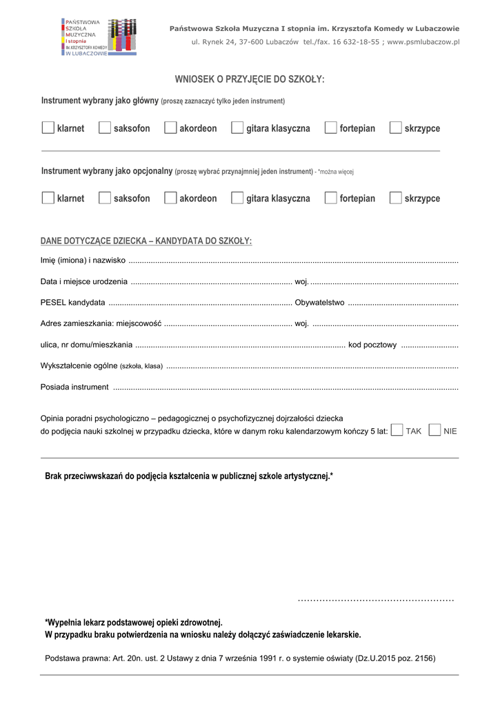 Państwowa Szkoła Muzyczna I stopnia im. Krzysztofa Komedy w Lubaczowie ul. Rynek 24, 37-600 Lubaczów tel./fax. 16 632-18-55 ; www.psmlubaczow.pl WNIOSEK O PRZYJĘCIE DO SZKOŁY: Instrument wybrany jako główny (proszę zaznaczyć tylko jeden instrument) klarnet saksofon akordeon gitara klasyczna fortepian skrzypce Instrument wybrany jako opcjonalny (proszę wybrać przynajmniej jeden instrument) - *można więcej klarnet saksofon akordeon gitara klasyczna fortepian skrzypce DANE DOTYCZĄCE DZIECKA – KANDYDATA DO SZKOŁY: Imię (imiona) i nazwisko ..................................................................................................................................................... Data i miejsce urodzenia ......................................................................... woj. ................................................................... PESEL kandydata ................................................................................... Obywatelstwo .................................................. Adres zamieszkania: miejscowość .......................................................... woj. .................................................................. ulica, nr domu/mieszkania ............................................................................................... kod pocztowy .......................... Wykształcenie ogólne (szkoła, klasa) .................................................................................................................................... Posiada instrument ............................................................................................................................................................ Opinia poradni psychologiczno – pedagogicznej o psychofizycznej dojrzałości dziecka do podjęcia nauki szkolnej w przypadku dziecka, które w danym roku kalendarzowym kończy 5 lat: TAK NIE Brak przeciwwskazań do podjęcia kształcenia w publicznej szkole artystycznej.* …………………………………………… *Wypełnia lekarz podstawowej opieki zdrowotnej. W przypadku braku potwierdzenia na wniosku należy dołączyć zaświadczenie lekarskie. Podstawa prawna: Art. 20n. ust. 2 Ustawy z dnia 7 września 1991 r. o systemie oświaty (Dz.U.2015 poz. 2156) Państwowa Szkoła Muzyczna I stopnia im. Krzysztofa Komedy w Lubaczowie ul. Rynek 24, 37-600 Lubaczów tel./fax. 16 632-18-55 ; www.psmlubaczow.pl DANE DOTYCZĄCE RODZICÓW (OPIEKUNÓW PRAWNYCH): Imiona i nazwiska rodziców (opiekunów prawnych) ........................................................................................................... Adres zamieszkania ........................................................................................................................................................... Nr telefonu, e-mail lub inna forma kontaktu ...................................................................................................................... W przypadku równorzędnych wyników uzyskanych na pierwszym etapie postępowania rekrutacyjnego, na drugim etapie postępowania rekrutacyjnego proszę uwzględnić następujące kryteria:* 1) wielodzietność rodziny kandydata .......................................................................................................................... 2) niepełnosprawność kandydata ............................................................................................................................... 3) niepełnosprawność jednego z rodziców kandydata ............................................................................................... 4) niepełnosprawność obojga rodziców kandydata ..................................................................................................... 5) niepełnosprawność rodzeństwa kandydata ............................................................................................................ 6) samotne wychowywanie kandydata w rodzinie ...................................................................................................... 7) objęcie kandydata pieczą zastępczą ...................................................................................................................... *Podstawa prawna: Ustawa z dnia 7 września 1991 r. o systemie oświaty (Dz.U.2015 poz. 2156) OŚWIADCZENIE: Wyrażam zgodę na przetwarzanie danych osobowych zawartych we wniosku zgodnie z: 1. 2. 3. 4. Ustawą z dnia 29 sierpnia 1997 r. o ochronie danych osobowych (Dz.U.2015 poz. 2135). Ustawą z dnia 15 kwietnia 2011 r. o systemie informacji oświatowej (Dz.U.2015 poz. 45). Ustawą z dnia 7 września 1991 r. o systemie oświaty (Dz.U.2015 poz. 2156). Rozporządzeniem MKiDN z dnia 16 czerwca 2011 r. z dnia 24 sierpnia 2011 r. w sprawie sposobu prowadzenia przez publiczne szkoły i placówki artystyczne dokumentacji przebiegu nauczania, działalności wychowawczej i opiekuńczej oraz rodzajów tej dokumentacji (Dz. U. z 2011 r. Nr 187, poz. 1118). Ponadto oświadczam, że: 1. Wyrażam/nie wyrażam* zgodę/y na umieszczanie zdjęć, filmów zawierających wizerunek mojego dziecka na szkolnej stronie internetowej oraz na innych publikacjach w celu informacji i promocji szkoły. Lubaczów, dnia .................................................................................................................................................................. Podpis rodzica (opiekuna prawnego) *niepotrzebne skreślić