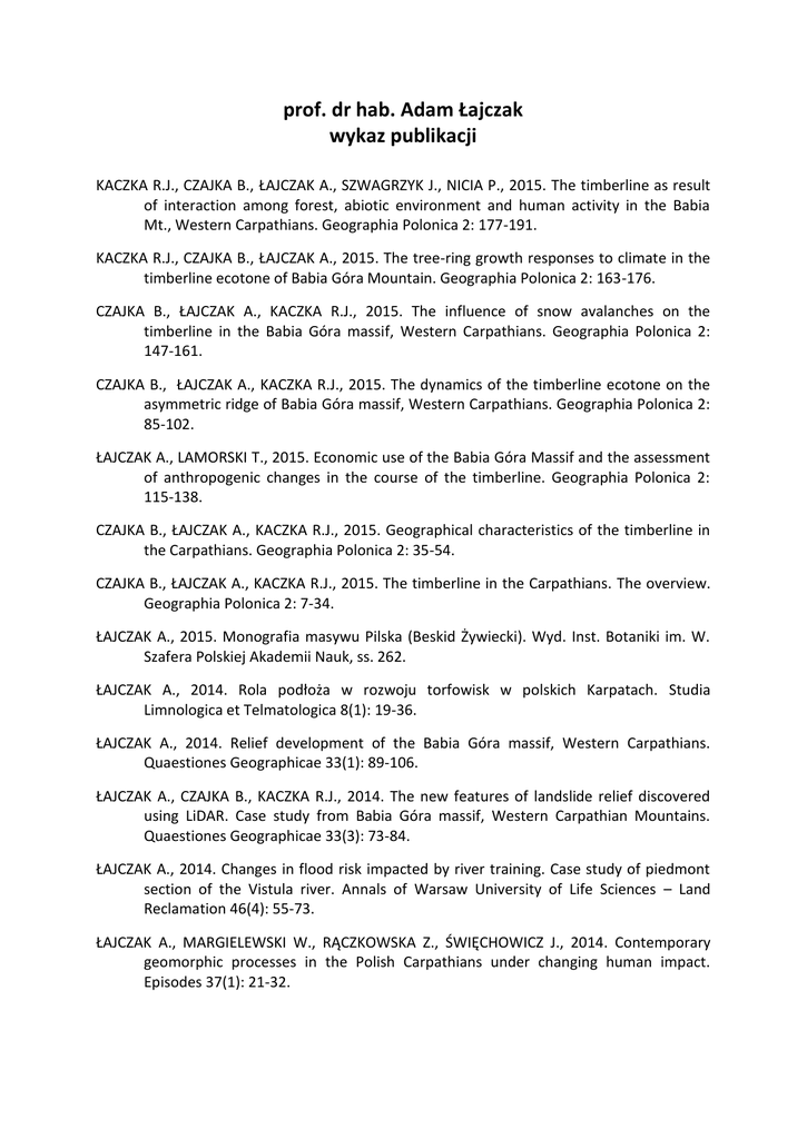 prof. dr hab. Adam Łajczak wykaz publikacji KACZKA R.J., CZAJKA B., ŁAJCZAK A., SZWAGRZYK J., NICIA P., 2015. The timberline as result of interaction among forest, abiotic environment and human activity in the Babia Mt., Western Carpathians. Geographia Polonica 2: 177-191. KACZKA R.J., CZAJKA B., ŁAJCZAK A., 2015. The tree-ring growth responses to climate in the timberline ecotone of Babia Góra Mountain. Geographia Polonica 2: 163-176. CZAJKA B., ŁAJCZAK A., KACZKA R.J., 2015. The influence of snow avalanches on the timberline in the Babia Góra massif, Western Carpathians. Geographia Polonica 2: 147-161. CZAJKA B., ŁAJCZAK A., KACZKA R.J., 2015. The dynamics of the timberline ecotone on the asymmetric ridge of Babia Góra massif, Western Carpathians. Geographia Polonica 2: 85-102. ŁAJCZAK A., LAMORSKI T., 2015. Economic use of the Babia Góra Massif and the assessment of anthropogenic changes in the course of the timberline. Geographia Polonica 2: 115-138. CZAJKA B., ŁAJCZAK A., KACZKA R.J., 2015. Geographical characteristics of the timberline in the Carpathians. Geographia Polonica 2: 35-54. CZAJKA B., ŁAJCZAK A., KACZKA R.J., 2015. The timberline in the Carpathians. The overview. Geographia Polonica 2: 7-34. ŁAJCZAK A., 2015. Monografia masywu Pilska (Beskid Żywiecki). Wyd. Inst. Botaniki im. W. Szafera Polskiej Akademii Nauk, ss. 262. ŁAJCZAK A., 2014. Rola podłoża w rozwoju torfowisk w polskich Karpatach. Studia Limnologica et Telmatologica 8(1): 19-36. ŁAJCZAK A., 2014. Relief development of the Babia Góra massif, Western Carpathians. Quaestiones Geographicae 33(1): 89-106. ŁAJCZAK A., CZAJKA B., KACZKA R.J., 2014. The new features of landslide relief discovered using LiDAR. Case study from Babia Góra massif, Western Carpathian Mountains. Quaestiones Geographicae 33(3): 73-84. ŁAJCZAK A., 2014. Changes in flood risk impacted by river training. Case study of piedmont section of the Vistula river. Annals of Warsaw University of Life Sciences – Land Reclamation 46(4): 55-73. ŁAJCZAK A., MARGIELEWSKI W., RĄCZKOWSKA Z., ŚWIĘCHOWICZ J., 2014. Contemporary geomorphic processes in the Polish Carpathians under changing human impact. Episodes 37(1): 21-32. ŁAJCZAK A., 2013. The role of bedrock and local topography in development of raised bogs in the Carpathian Mountains. Landform Analysis 22: 61-73. ŁAJCZAK A., 2013. Zmniejszenie zasięgu złóż torfu i ich retencji wodnej w Kotlinie OrawskoNowotarskiej i w Bieszczadach w wyniku działalności człowieka. Przegląd Geologiczny, 9: 532-540. ŁAJCZAK A., 2013. Wody powierzchniowe Tatr [W:] J. Pociask-Karteczka (red.) Z badań hydrologicznych w Tatrach. Wyd. Tatrzański Park Narodowy, Instytut Geografii i Gospodarki Przestrzennej UJ, s. 77-83. ŁAJCZAK A., 2013. Changes in raised bog relief during the Holocene. Case study: Polish Carpathian Mountains. [In:] M.C. Hernandez-Soriano (ed.) Soil Processes and Current Trends in Quality Assessment. Publ. INTECH, Rijeka, Croatia, p. 337-363. ŁAJCZAK A., 2012. Babiogórski Park Narodowy. [W:] R. Bogdanowicz, P. Jokiel, J. PociaskKarteczka (red.) Wody w parkach narodowych Polski. Wyd. IGiGP UJ, Kom. Hydrol. PTG, s. 14-29. ŁAJCZAK A., 2012. Use of Piedmont Section of Vistula in Southern Poland to Examine the Effect of River Channelization on Flood Risk. [In:] T. Wong (ed.) Flood Risk and Flood Management. Publ. Nova Series, New York, USA, p. 88-106. ŁAJCZAK A., 2012. Transport of suspended sediment by the Vistula River basin upstream of Kraków, southern Poland, and the human impact during the second half of the 20th century. IAHS Publ. 356: 49-56. ŁAJCZAK A., 2012. Water circulation and chemical denudation within the upper Skawica River flysch catchment, Western Carpathian Mountains. Zeitschrift für Geomorphologie, Supplementary Issue 56/1: 69 -86. RĄCZKOWSKA Z., ŁAJCZAK A., MARGIELEWSKI W., ŚWIĘCHOWICZ J., 2012. Recent landform evolution in the Polish Carpathians. [In:] D. Loczý, M. Stankoviansky, A. Kotarba (eds) Recent Landform Evolution. The Carpatho-Balcan-Dynaric Region. Springer Geography, p. 47-101. ŁAJCZAK A., 2011. Contemporary changes in the relief of raised bogs on the example of the Polish Carpathians. Geographia Polonica 84: 5-22. ŁAJCZAK A., 2011. Masyw Pilska w Beskidzie Żywieckim. Przyroda i człowiek. Wyd. Inst. Botaniki im W. Szafera PAN, Kraków, ss. 262. BABIŃSKI Z., KRZEMIEŃ K., ŁAJCZAK A., MAGNUSZEWSKI A., 2010. Rusłowyje processy rieki Wisły (Polsza). [W:] R.S. Czałow (red.) Erozionnyje i rusłowyje processy. Sbornik trudow. Wypusk 5, Wyd. Moskowskogo Gosudarstwiennogo Uniwiersitieta, Moskwa, s. 40-59. ŁAJCZAK A., 2009. Warunki rozwoju i rozmieszczenie torfowisk w Kotlinie OrawskoNowotarskiej. Przegląd Geologiczny 57 (8): 694-702. ŁAJCZAK A., 2009. Changes in relief of the Azau Valley in Central Caucasus Mts resulting from impact of volcanic activity and glaciers` oscillations during the last 1100 years. Landform Analysis 11: 39-58. ŁAJCZAK A., 2009. Contemporary flood frequency, fluctuations and trends of changes in water discharge in the piedmont course of the Vistula River, Southern Poland (Central Europe). Proc. of the Intern. Conf. on Hydrology and Climate Change in Mountainous Areas, Kathmandu, Nepal, 15-17.11.2008, p. 35-43. ŁAJCZAK A., 2009. Spatial distribution of water resources in the Tatra Mountains and their foreland, Western Carpathian Mts (Central Europe). Proc. of the Intern. Conf. on Hydrology and Climate Change in Mountainous Areas, Kathmandu, Nepal, 1517.11.2008, p. 1-18. ŁAJCZAK A., 2008. Zróżnicowanie wydajności źródeł w masywie Babiej Góry. [W:] Partyka J., Pociask-Karteczka J. (red.) Wody na obszarach chronionych. Wyd. Instytut Geografii I Gospodarki Przestrzennej Uniwersytetu Jagiellońskiego, Ojcowski Park Narodowy, Komisja Hydrologiczna Polskiego Towarzystwa Geograficznego, Kraków-Ojców, s. 205-211. ŁAJCZAK A., 2008. Zasoby wodne zlewni górnej Skawicy (Pasmo Babiogórskie). [W:] Absalon D., 