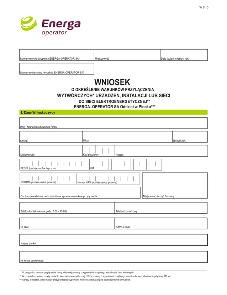 W 6.10 Miejscowość Numer wniosku (wypełnia ENERGA-OPERATOR SA) Data (dzień, miesiąc, rok) Numer ewidencyjny (wypełnia ENERGA-OPERATOR SA) WNIOSEK O OKREŚLENIE WARUNKÓW PRZYŁĄCZENIA WYTWÓRCZYCH* URZĄDZEŃ, INSTALACJI LUB SIECI DO SIECI ELEKTROENERGETYCZNEJ** ENERGA–OPERATOR SA Oddział w Płocku*** 1. Dane Wnioskodawcy Imię i Nazwisko lub Nazwa Firmy Gmina Ulica Miejscowość Kod pocztowy Nr bud./lok. Poczta PESEL (podaje osoba fizyczna) REGON (podaje osoba prawna) - - NIP Numer KRS (podaje osoba prawna) Osoba upoważniona do kontaktów w sprawie warunków przyłączenia Miejsce na pieczęć firmową Telefon kontaktowy (w godz. 7.00 - 15.00) Telefon komórkowy Nr faxu Adres e-mail Nazwa banku Nr konta bankowego * W przypadku zamiaru przyłączenia farmy wiatrowej prosimy o wypełnienie odrębnego wniosku dla farm wiatrowych ** W przypadku zamiaru przyłączenia do sieci elektroenergetycznej 110 kV prosimy o wypełnienie odrębnego wniosku dla sieci elektroenergetycznej 110 kV *** Adresy jednostek, gdzie należy złożyć/przesłać wypełniony wniosek znajdują się na ostatniej stronie formularza. 2. Dane lokalizacyjne Nazwa obiektu Gmina Miejscowość Ulica Numery działek na których zlokalizowany będzie obiekt przyłączany 3. Informacje techniczne 3.1 Rodzaj obiektu □ elektrociepłownia na biogaz □ elektrociepłownia parowa □ inna □ □ □ elektrownia gazowa □ elektrociepłownia gazowa elektrownia wodna elektrownia na biogaz 3.2 Rodzaj energii pierwotnej □ gaz wysypiskowy □ osady ściekowe □ □ biogaz rolniczy □ woda □ inne □ napowietrzne □ kablowe biomasa 3.3 Wnioskowany rodzaj przyłącza: 3.4 Dane techniczne generatorów Rodzaj generatora Rodzaj jednostki napędowej synchroniczny silnik spalinowy asynchroniczny turbina Pn . cos φ [kW] synchroniczny silnik spalinowy asynchroniczny turbina synchroniczny silnik spalinowy asynchroniczny turbina n - Un Ilość [kV] [szt] Uwagi 3.5 Planowane moce jednostek wytwórczych a) moc zainstalowana MW b) moc osiągalna MW c) moc dyspozycyjna MW d) moc pozorna MV·A 3.6 Zakres dopuszczalnych zmian obciążeń jednostki(ek) wytwórczej(ych) a) moc minimalna MW b) moc maksymalna 3.7 Moc przyłączeniowa w miejscu dostarczania energii do sieci ENERGA–OPERATOR SA MW MW 3.8 Przewidywana roczna produkcja energii elektrycznej a) wyprodukowana (brutto) MW·h b) wprowadzona do sieci ENERGA–OPERATOR SA (netto) MW·h 3.9 Przewidywany termin rozpoczęcia dostarczania/poboru energii elektrycznej Data 3.10 Przewidywana moc przyłączeniowa potrzeb własnych jednostki wytwórczej MW 3.11 Przewidywany roczny pobór energii elektrycznej na potrzeby własne MW·h 3.12 Minimalna moc potrzeb własnych jednostki wytwórczej, wymagana dla zapewnienia bezpieczeństwa osób i mienia w przypadku wprowadzenia ograniczeń w dostarczaniu i poborze energii elektrycznej kW 3.13 Stopień skompensowania mocy biernej (tg φ) a) związanej z odbiorem energii elektrycznej czynnej na potrzeby własne wytwórcy b) związanej z wprowadzeniem wyprodukowanej energii elektrycznej do sieci 4. Dodatkowe uwagi Wnioskodawcy Oświadczenie Oświadczam, że dane przedstawione w niniejszym WNIOSKU odpowiadają stanowi faktycznemu. Oświadczam, że wyrażam zgodę na przetwarzanie moich danych osobowych, zgodnie z ustawą, z dnia 29 sierpnia 1997 r. o ochronie danych osobowych (Dz. U. Nr 133, poz. 883, tekst jednolity: Dz. U. z 2004 r. Nr 101, poz 926, z późn. zm.), przez ENERGA-OPERATOR SA w celu określenia warunków przyłączenia, zawarcia umowy o przyłączenie do sieci oraz realizacji przyłączenia do sieci elektroenergetycznej. Przyjmuję jednocześnie do wiadomości, ze mam prawo żądania informacji o zakresie przetwarzania moich danych osobowych, prawo dostępu do treści tych danych, uzupełnienia, uaktualnienia i sprostowania danych, gdy są niekompletne, nieaktualne lub nieprawdziwe. Oświadczam, że wyrażam zgodę na publikowanie przez ENERGA-OPERATOR SA informacji dotyczących mojej siedziby lub miejsca zamieszkania, lokalizacji przyłączenia, mocy przyłączeniowej, daty wydania warunków przyłączenia, zawarcia umowy o przyłączenie do sieci i rozpoczęcia dostarczania energii elektrycznej. Oświadczam, że wyrażam zgodę na przesyłanie dokumentów zawierających moje dane osobowe drogą pocztową. ENERGA-OPERATOR SA nie ponosi odpowiedzialności za utracone w tym przypadku dane. Odbiór warunków przyłączenia i projektu umowy o przyłączenie: □ proszę przesłać pocztą na adres*: □ odbiorę osobiście W przypadku nie odebrania warunków przyłączenia w terminie 7 dni od daty powiadomienia, zostaną one wysłane na adres widniejący we wniosku. * podać w przypadku, gdy adres jest inny niż w punkcie 1. wniosku Podpis Wnioskodawcy 5. Do WNIOSKU należy dołączyć w formie załączników w języku polskim następujące dokumenty: Dokument potwierdzający tytuł prawny WNIOSKODAWCY do korzystania z obiektu lub nieruchomości, w którym będą używane urządzenia, instalacje lub sieci elektryczne należące do WNIOSKODAWCY oraz aktualne: mapę ewidencji gruntów, wypis z ewidencji gruntów i wykaz numerów ewidencyjnych działek na których zlokalizowana będzie inwestycja. Plan zabudowy na mapie sytuacyjno-wysokościowej lub za zgodą ENERGA–OPERATOR SA szkic sytuacyjny, określający usytuowanie przyłączanego obiektu względem istniejącej sieci oraz usytuowanie sąsiednich obiektów. Wypis i wyrys z miejscowego planu zagospodarowania przestrzennego albo, w przypadku braku takiego planu, decyzję o warunkach zabudowy i zagospodarowania terenu dla nieruchomości określonej we WNIOSKU, jeżeli jest ona wymagana na podstawie przepisów o planowaniu i zagospodarowaniu przestrzennym. Wypis i wyrys z miejscowego planu zagospodarowania przestrzennego lub decyzja o warunkach zabudowy i zagospodarowania terenu powinny potwierdzać dopuszczalność lokalizacji danego źródła energii na terenie objętym planowaną in