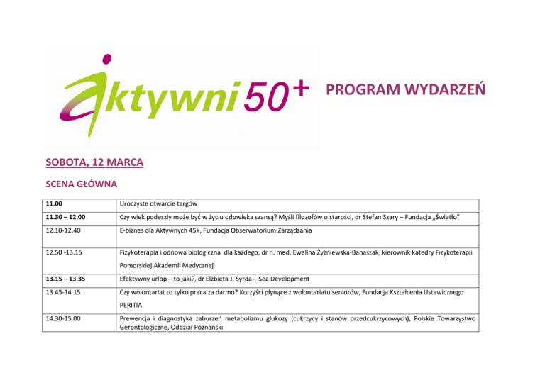 PROGRAM WYDARZEŃ SOBOTA, 12 MARCA SCENA GŁÓWNA 11.00 Uroczyste otwarcie targów 11.30 – 12.00 Czy wiek podeszły może być w życiu człowieka szansą? Myśli filozofów o starości, dr Stefan Szary – Fundacja „Światło” 12.10-12.40 E-biznes dla Aktywnych 45+, Fundacja Obserwatorium Zarządzania 12.50 -13.15 Fizykoterapia i odnowa biologiczna dla każdego, dr n. med. Ewelina Żyżniewska-Banaszak, kierownik katedry Fizykoterapii Pomorskiej Akademii Medycznej 13.15 – 13.35 Efektywny urlop – to jaki?, dr Elżbieta J. Syrda – Sea Development 13.45-14.15 Czy wolontariat to tylko praca za darmo? Korzyści płynące z wolontariatu seniorów, Fundacja Kształcenia Ustawicznego PERITIA 14.30-15.00 Prewencja i diagnostyka zaburzeń metabolizmu glukozy (cukrzycy i stanów przedcukrzycowych), Polskie Towarzystwo Gerontologiczne, Oddział Poznański 15.15-15.30 O działalności Wrocławskiego Centrum Seniora, Wrocławskie Centrum Seniora 15.45-16.00 Skoro tak długo żyję, to widocznie po to, żeby się jeszcze komuś przydać, Fundacja „Dobrze, że jesteś” 16.15-16.45 NTM – pokaz ćwiczeń mięśni dna miednicy, Stowarzyszenie Osób z NTM „UroConti” SALE WARSZTATOWE 11.30 – 13.30 Warsztaty artystyczne Kino ARS – animować świat (Fundacja Wspierania Twórczości, Kultury i Sztuki ARS) 11.30 – 13.15 13.45 – 15.15 Zdobienie techniką decoupage (Stowarzyszenie Klub Nauczycieli Miasta Poznania) 13.30 – 15.00 15.30 – 16.15 Warsztat metaloplastyki, (Dom Pomocy Społecznej ul. Ugory, Poznań) 15.15 – 16.45 Warsztaty edukacyjne W zdrowym ciele zdrowy duch (Stowarzyszenie Wzajemnej Pomocy „Flandria”) Komunikacja i perswazja, czyli jak skutecznie porozmawiać z innym (Stowarzyszenie Psychoprofilaktyki Środowiskowej „Starzy i Młodzi dla Młodych i Starych”) Warsztaty z wizażystką, kosmetologiem (Fundacja „Światło”) 11.30 – 13.00 13.30 – 14.30 15.00 – 16.30 Zgłoszenia na warsztaty przyjmowane są przed salami warsztatowymi w czasie targów, do wyczerpania limitu miejsc. Warsztaty doradcze Rozmowa kwalifikacyjna: w jaki sposób odpowiadać właściwie na pytania? (Fundacja Kształcenia Ustawicznego PERITIA) Zawodowo aktywni 50+ (Powiatowy Urząd Pracy w Poznaniu) Warsztaty aktywnego poszukiwania pracy (Fundacja Kształcenia Ustawicznego PERITIA) PUNKT DORADZTWA ZAWODOWEGO czynny w godz. 11.30 – 16.00 SCENA SPORTOWA 11.30 Tai chi (Stowarzyszenie Taoistycznego Tai Chi w Polsce) 12.00 Nordic walking (Marsz po zdrowie) 12.30 Terapia tańcem (Towarzystwo UTW) 13.00 Masaż głowy (Stowarzyszenie INPRU) 13.30 Gimnastyka dla seniora (Dom Pomocy Społecznej ul. Ugory, Poznań) 14.00 Qigong – starochińskie ćwiczenia usprawniające (Stowarzyszenie INPRU) 14.30 Fitness/fitball (PURE) 15.00 Joga lecznicza (Fundacja „Światło”) 15.15-16.30 Movements Gurdżijewa – zajęcia taneczno-ruchowe (Fundacja ARS) SCENA NORDIC WALKING Po każdej prelekcji darmowe konsultacje z instruktorami. Organizator: Marsz po Zdrowie i Polskie Stowarzyszenie Nordic Walking 12.00 Zakochaj się w nordic walking! 13.00 Nordic walking – co i jak? Poznaj podstawy marszu 14.00 Nordic walking a otyłość 15.00 Nordic walking dla seniora SPEED BADMINTON PARK 10.00 – 17.00 Speedminton® Show: prezentacja sprzętu do gry, pokazy gry, konkurs „Zagraj z nami” 11:00 – 16:00 Akademia Speedbadminton.pl: pokazy gry, bezpłatna nauka 11:00 – 15:30 V Speedminton® Cup PL PUNKT BADAŃ PROFILAKTYCZNYCH 11.00 – 16.00 Badania poziomu cukru we krwi, poziomu cholesterolu i trójglicerydów, pomiar ciśnienia tętniczego, edukacja diabetologiczna Badania prowadzi HYPERKLUB Polskie Stowarzyszenie Diabetyków SCENA KULTURALNA, pawilon 11 12.00 – 13.00 Duety operetkowe 14.00 – 15.00 Koncert Affabre Concinui 16.00 – 17.00 Koncert Haliny Kunickiej NIEDZIELA 26 WRZEŚNIA SCENA GŁÓWNA 10.15 – 10.45 Usłyszeć świat – kampania społeczna, Polskie Stowarzyszenie Protetyków Słuchu 11.00 – 11.30 11.45 – 12.15 Jakie zwierzę drzemie we mnie – czy współpracy się podejmie?, dr Andrzej Stogowski, Regionalny Ośrodek Pomocy Społecznej w Poznaniu Bezpieczny senior, Wydział Prewencji Komendy Wojewódzkiej Policji w Poznaniu 12.30 – 12.45 Nowoczesne usługi telekomunikacyjne dla każdego, INEA 12.50 – 13.05 Portal internetowy Kulturaviva, Instytut Adama Mickiewicza 13.30 – 14.20 Piękna Seniorita – metody i techniki makijażu dla kobiet dojrzałych, Fundacja SIC! 14.30 – 15.00 Aktywnie po pięćdziesiątce – oferta Centrum Inicjatyw Senioralnych 15.15 – 15.45 „Żwawe Dziadki” – Śremski Klub Rowerowy – Amatorski Klub Literacki, Ośrodek Pomocy Społecznej w Śremie 16.00 – 16.30 Okres menopauzy bez pauzy, Stowarzyszenie Wzajemnej Pomocy „FLANDRIA” SALE WARSZTATOWE 10.30 – 11.30 Warsztaty artystyczne Z papierem za pan brat, czyli origami i ja (Stowarzyszenie INPRU) 11.30 – 12.00 Warsztaty edukacyjne Co jeść, by zdrowo i długo żyć (Fundacja „Światło”) 10.15 – 11.45 Warsztaty doradcze Rozmowa kwalifikacyjna: w jaki sposób odpowiadać właściwie na pytania? (Fundacja Kształcenia Ustawicznego PERITIA) 12.15 – 14.30 12.00 – 15.00 Plener malarski (Fundacja Wspierania Twórczości, Kultury i Sztuki ARS) 15.30 – 16.15 Sesja śmiechu (Fundacja Dr Clown) 14.45 – 16.15 Człowiek wobec choroby i śmierci (Stowarzyszenie Psychoprofilaktyki Środowiskowej „Starzy i Młodzi dla Młodych i Starych”) Trening usprawniający pamięć i uwagę (Anna Korobczak, psycholog) 12.00 – 13.00 Zawodowo aktywni 50+ (Powiatowy Urząd Pracy w Poznaniu) 13.15 – 14.45 Warsztaty aktywnego poszukiwania pracy (Fundacja Kształcenia Ustawicznego PERITIA) Warsztaty rynku pracy (Wydział Zdrowia i Spraw Społecznych Urzędu Miasta Poznania - Projekt „Reintegracja 45 Plus”) 15.00 – 16.30 Zgłoszenia na warsztaty przyjmowane są przed salami warsztatowymi w czasie targów, do wyczerpania limitu miejsc. PUNKT DORADZTWA ZAWODOWEGO czynny w godz.