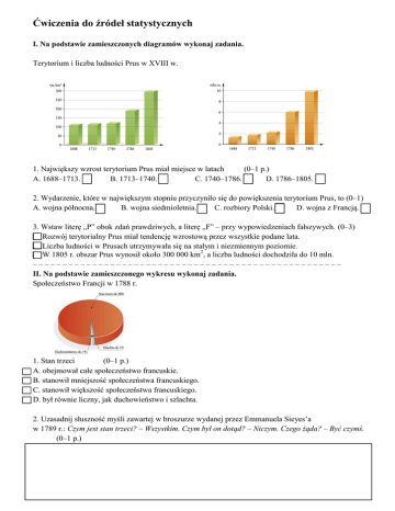 Ćwiczenia do źródeł statystycznych I. Na podstawie zamieszczonych diagramów wykonaj zadania. Terytorium i liczba ludności Prus w XVIII w. 1. Największy wzrost terytorium Prus miał miejsce w latach (0–1 p.) A. 1688–1713. B. 1713–1740. C. 1740–1786. D. 1786–1805. 2. Wydarzenie, które w największym stopniu przyczyniło się do powiększenia terytorium Prus, to (0–1) A. wojna północna. B. wojna siedmioletnia. C. rozbiory Polski. D. wojna z Francją. 3. Wstaw literę „P” obok zdań prawdziwych, a literę „F” – przy wypowiedzeniach fałszywych. (0–3) Rozwój terytorialny Prus miał tendencję wzrostową przez wszystkie podane lata. Liczba ludności w Prusach utrzymywała się na stałym i niezmiennym poziomie. W 1805 r. obszar Prus wynosił około 300 000 km2, a liczba ludności dochodziła do 10 mln. –––––––––––––––––––––––––––––––––––––––––––––––––––– II. Na podstawie zamieszczonego wykresu wykonaj zadania. Społeczeństwo Francji w 1788 r. 1. Stan trzeci (0–1 p.) A. obejmował całe społeczeństwo francuskie. B. stanowił mniejszość społeczeństwa francuskiego. C. stanowił większość społeczeństwa francuskiego. D. był równie liczny, jak duchowieństwo i szlachta. 2. Uzasadnij słuszność myśli zawartej w broszurze wydanej przez Emmanuela Sieyes’a w 1789 r.: Czym jest stan trzeci? – Wszystkim. Czym był on dotąd? – Niczym. Czego żąda? – Być czymś. (0–1 p.) –––––––––––––––––––––––––––––––––––––––––––––––––––– III. Na podstawie zamieszczonej tabeli wykonaj zadania. Sieć kolejowa w państwach europejskich w XIX w. Długość linii kolejowych w Państwo kilometrach 1840 r. 1850 r. 1880 r. Austria 144 1579 18 507 Belgia 334 903 4 112 Francja 497 2915 23 089 Hiszpania – 28 7490 Niemcy 459 5856 33 838 Rosja 27 501 22 865 Szwajcaria – 25 2575 Wielka Brytania 2390 9797 25 060 Włochy 20 620 9290 1. Na podstawie danych z powyższej tabeli uzasadnij, że w latach dwudziestych XIX wieku w Wielkiej Brytanii narodziła się kolej. (0–1 p.) 2. Wstaw literę „P” obok zdań prawdziwych, a literę „F” – przy wypowiedzeniach fałszywych. (0–3 p.) Na podstawie długości linii kolejowych w 1880 r. wynika, że Belgia należała do grupy państw o niewielkim potencjale gospodarczym. Najszybsze tempo rozwoju kolejnictwa w latach 1850–1880 miało miejsce w Hiszpanii, a najmniejsze w Wielkiej Brytanii. W 1880 r. Niemcy posiadały o około 50% więcej linii kolejowych niż Rosja. –––––––––––––––––––––––––––––––––––––––––––––––––––– IV. Na podstawie zamieszczonego wykresu wykonaj zadania. Zmiany liczby ludności Stanów Zjednoczonych w XIX w. 1. Na początku XX w. liczba ludności Stanów Zjednoczonych wynosiła (0–1 p.) A. 25 mln. B. 50 mln. C. prawie 80 mln. D. ponad 90 mln. 2. Wstaw literę „P” obok zdań prawdziwych, a literę „F” – przy wypowiedzeniach fałszywych. (0–3 p.) W ciągu całego XIX w. liczba ludności USA zwiększyła się o ponad 70 min. W latach 1800–1900 nastąpił dziesięciokrotny wzrost liczby mieszkańców USA. ____________________________________________________________________________________ __ V. Na podstawie zamieszczonych danych wykonaj zadania. Straty wojenne w latach 1914–1918 Sojusz ententa państ wa centra lne Kraj Rosja Francja Wielka Brytania Włochy Stany Zjednoczone Rumunia Serbia Niemcy Austro-Węgry Bułgaria Polegli 2 500 000 1 400 000 1 000 000 380 000 48 000 300 000 45 000 2 000 000 1 200 000 90 000 1. Wypisz trzy państwa ententy i jedno państwo centralne o największej liczbie poległych. (0–1 p.) ententa – państwa centralne – 2. Na podstawie wiedzy poza zródłowej uzasadnij dwie przyczyny tak wysokich strat ponoszonych przez walczące strony. (0–2 p.) VI. Negatywny stosunek Polaków do mniejszości narodowych 1. Określ, wobec której mniejszości narodowej Polacy odnosili się najbardziej nieprzychylnie w 1992 r. Następnie wyjaśnij, jak z czasem zmieniło się to nastawienie. Podaj przyczyny takiej przemiany. ______________________________________________________________________________ VII. Zapoznaj się z danymi zamieszczonymi w tabeli i wykonaj polecenie.. Dochody jednostek samorządu terytorialnego – plany na 2008 r. PIT CIT Pozostałe Gminy wiejskie Kamienna Góra (ludność – 8711) 2,296 mln zł 100 tys. zł 3,316 mln zł Lubicz (ludność – 17 245) 8,267 mln zł 630 tys. zł 7,937 mln zł 29 mln zł 3 mln zł 22,843 mln zł 27,399 mln zł 5 mln zł 41,362 mln zł 3,168 mld zł 734 mln zł 1,609 mld zł 779 mln zł 120 mln zł 779 mln zł Gminy miejskie Gmina Mikołów (ludność – 38 398) Puławy (ludność – 49 755) Miasta na prawach powiatu Miasto stołeczne Warszawa (ludność – 1 702 139) Kraków (ludność – 756 267) 1. Gmina, która miała największe dochody w 2008 r., to A Warszawa. B Lubicz. C. Kraków. D Puławy 2. Dochody z podatku PIT nie stanowią większej części budżetu gminy w A Krakowie. B Kamiennej Górze. C Puławach. D Mikołowie VIII. Zapoznaj się z danymi przedstawionymi na wykresach i wykonaj polecenie Jak globalizacja wpływa na sytuację? biednych państw Jak globalizacja wpływa na sytuację bogatych państw? 1. Odsetek osób uważających, że biedne państwa ponoszą straty w wyniku globalizacji, wynosi A. 21% B.58% C. 3% D.82% 2. Globalizację jako zjawisko korzystne dla bogatych krajów postrzega A. 82% badanych B. 21% badanych C. 58% badanych D. 3% badanych.