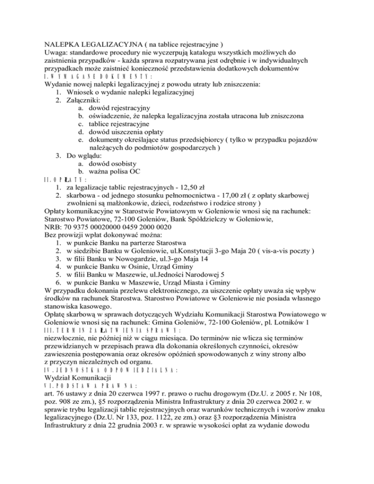 NALEPKA LEGALIZACYJNA ( na tablice rejestracyjne ) Uwaga: standardowe procedury nie wyczerpują katalogu wszystkich możliwych do zaistnienia przypadków - każda sprawa rozpatrywana jest odrębnie i w indywidualnych przypadkach może zaistnieć konieczność przedstawienia dodatkowych dokumentów I. WYMAGANE DOKUMENTY: Wydanie nowej nalepki legalizacyjnej z powodu utraty lub zniszczenia: 1. Wniosek o wydanie nalepki legalizacyjnej 2. Załączniki: a. dowód rejestracyjny b. oświadczenie, że nalepka legalizacyjna została utracona lub zniszczona c. tablice rejestracyjne d. dowód uiszczenia opłaty e. dokumenty określające status przedsiębiorcy ( tylko w przypadku pojazdów należących do podmiotów gospodarczych ) 3. Do wglądu: a. dowód osobisty b. ważna polisa OC II. OPŁATY: 1. za legalizacje tablic rejestracyjnych - 12,50 zł 2. skarbowa - od jednego stosunku pełnomocnictwa - 17,00 zł ( z opłaty skarbowej zwolnieni są małżonkowie, dzieci, rodzeństwo i rodzice strony ) Opłaty komunikacyjne w Starostwie Powiatowym w Goleniowie wnosi się na rachunek: Starostwo Powiatowe, 72-100 Goleniów, Bank Spółdzielczy w Goleniowie, NRB: 70 9375 00020000 0459 2000 0020 Bez prowizji wpłat dokonywać można: 1. w punkcie Banku na parterze Starostwa 2. w siedzibie Banku w Goleniowie, ul.Konstytucji 3-go Maja 20 ( vis-a-vis poczty ) 3. w filii Banku w Nowogardzie, ul.3-go Maja 14 4. w punkcie Banku w Osinie, Urząd Gminy 5. w filii Banku w Maszewie, ul.Jedności Narodowej 5 6. w punkcie Banku w Maszewie, Urząd Miasta i Gminy W przypadku dokonania przelewu elektronicznego, za uiszczenie opłaty uważa się wpływ środków na rachunek Starostwa. Starostwo Powiatowe w Goleniowie nie posiada własnego stanowiska kasowego. Opłatę skarbową w sprawach dotyczących Wydziału Komunikacji Starostwa Powiatowego w Goleniowie wnosi się na rachunek: Gmina Goleniów, 72-100 Goleniów, pl. Lotników 1 III. TERMIN ZAŁATWIENIA SPRAWY: niezwłocznie, nie później niż w ciągu miesiąca. Do terminów nie wlicza się terminów przewidzianych w przepisach prawa dla dokonania określonych czynności, okresów zawieszenia postępowania oraz okresów opóźnień spowodowanych z winy strony albo z przyczyn niezależnych od organu. IV. JEDNOSTKA ODPOWIEDZIALNA: Wydział Komunikacji VI. PODSTAWA PRAWNA: art. 76 ustawy z dnia 20 czerwca 1997 r. prawo o ruchu drogowym (Dz.U. z 2005 r. Nr 108, poz. 908 ze zm.), §5 rozporządzenia Ministra Infrastruktury z dnia 20 czerwca 2002 r. w sprawie trybu legalizacji tablic rejestracyjnych oraz warunków technicznych i wzorów znaku legalizacyjnego (Dz.U. Nr 133, poz. 1122, ze zm.) oraz §3 rozporządzenia Ministra Infrastruktury z dnia 22 grudnia 2003 r. w sprawie wysokości opłat za wydanie dowodu rejestracyjnego, pozwolenia czasowego i tablic(tablicy) rejestracyjnych pojazdów (Dz.U. Nr 230, poz. 2302, ze zm.). V. TRYB ODWOŁAWCZY: nie przysługuje - czynność materialno techniczna VI. UWAGI: 1. mieszkańcy gmin Goleniów, Maszewo, Przybiernów i Stepnica są przyjmowani w Wydziale Komunikacji, budynek Starostwa Powiatowego w Goleniowie, ul.Dworcowa 1, I piętro, pok.101A i 101 B 2. mieszkańcy gmin Nowogard i Osina są przyjmowani w zamiejscowej delegaturze Wydziału Komunikacji w Nowogardzie, pl.Wolności 9 ( d. hotel „Cisy” ), II piętro 3. godziny przyjęć interesantów: w środy 7.30-11.00, w pozostałe dni urzędowania 7.30-15.00 4. w Goleniowie ruch interesantów sterowany jest przez system przywoławczy - numerki „C” interesanci pobierają samodzielnie z automatu biletowego