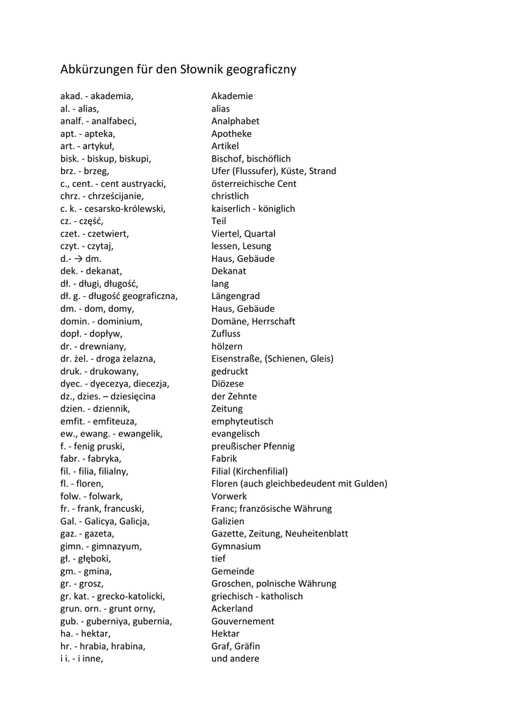 Abkürzungen für den Słownik geograficzny akad. - akademia, al. - alias, analf. - analfabeci, apt. - apteka, art. - artykuł, bisk. - biskup, biskupi, brz. - brzeg, c., cent. - cent austryacki, chrz. - chrześcijanie, c. k. - cesarsko-królewski, cz. - część, czet. - czetwiert, czyt. - czytaj, d.- → dm. dek. - dekanat, dł. - długi, długość, dł. g. - długość geograficzna, dm. - dom, domy, domin. - dominium, dopł. - dopływ, dr. - drewniany, dr. żel. - droga żelazna, druk. - drukowany, dyec. - dyecezya, diecezja, dz., dzies. – dziesięcina dzien. - dziennik, emfit. - emfiteuza, ew., ewang. - ewangelik, f. - fenig pruski, fabr. - fabryka, fil. - filia, filialny, fl. - floren, folw. - folwark, fr. - frank, francuski, Gal. - Galicya, Galicja, gaz. - gazeta, gimn. - gimnazyum, gł. - głęboki, gm. - gmina, gr. - grosz, gr. kat. - grecko-katolicki, grun. orn. - grunt orny, gub. - guberniya, gubernia, ha. - hektar, hr. - hrabia, hrabina, i i. - i inne, Akademie alias Analphabet Apotheke Artikel Bischof, bischöflich Ufer (Flussufer), Küste, Strand österreichische Cent christlich kaiserlich - königlich Teil Viertel, Quartal lessen, Lesung Haus, Gebäude Dekanat lang Längengrad Haus, Gebäude Domäne, Herrschaft Zufluss hölzern Eisenstraße, (Schienen, Gleis) gedruckt Diözese der Zehnte Zeitung emphyteutisch evangelisch preußischer Pfennig Fabrik Filial (Kirchenfilial) Floren (auch gleichbedeudent mit Gulden) Vorwerk Franc; französische Währung Galizien Gazette, Zeitung, Neuheitenblatt Gymnasium tief Gemeinde Groschen, polnische Währung griechisch - katholisch Ackerland Gouvernement Hektar Graf, Gräfin und andere incl. - inclusive, inst. - instytut, izr. - izraelici, izraelski, jarm. - jarmark, J. Ch. - Jezus Chrystus, jez. - jezioro, jęz. - język, j. w. - jak wyżej, k. - kopiejki, korzec, Kal. - Kalendarz, kapl. - kaplica, kat. - katolik, katolicki, kil. - kilometr, kl. - klasa, km. - kmiecy, kob. - kobiety, kol. - kolonia, kom. cel. - komora celna, komor. - komornik, kop. - kopiejki, kośc. - kościół, kościelny, kr. - król, krajcar, król. - królewski, królestwo, Król. Pol. - Królestwo Polskie, krzyż. - Krzyżacy, ks. - książę, kś. - ksiądz, k. u. k. → c. k. kw. - kwadratowy, l., ludn. - ludność, łac. - łacina, łaciński, lit. - litewski, łot. - łotewski, m. → mrk. M. - Mały, mad. - madziarski, węgierski, men. - menonici, męż. - mężczyźni, m. i. - między innemi, mil. - milion, mk. - mieszkańcy, mko. - miasteczko, Mł. - Mały, mm. - milimetr, mn. - mniejszy, mr. - mórg, morga, mrk. - marka, msto. - miasto, einschließlich Institut Israeli, israelitisch Jahrmarkt Jesus Christus See Sprache wie oben polnischer Scheffel Kalender Kapelle katholisch Kilometer Klasse, Klassenzimmer Großhüfner Frau Kolonie, Siedlung Zollamt Einlieger, Mietsmann- auch Gerichtsdiener Kopeken Kirche König, Kreutzer (Geldstück) König, Königreich Königreich Polen Kreuz, Deutschordensritter Fürst, Herzog geistlicher Titel Quadratisch, Quadrat Bevölkerung Latein Littauen lettisch klein Ungarn Mennoniten Mann, männlich unter anderem Million Einwohner kleine Stadt, Städtchen klein Millimeter minder, weniger Morgen (Flächenmaß) Mark (Münze) Stadt mt. - metr, mur. - murowany, n. - nad, N. - Nowy, Nadw. - Nadwiślańska nal. - należy, nied. - niedaleko, niem. - niemiecki, n. p. m. - nad powierzchnią morza, n. s. - nowego stylu, ob. - obacz, zobacz obr. - obraz, odl. - odległy, odległość, odn. - odnowiony, ogr. - ogród, okr. - okręg, okręgowy, oo. - ojcowie, os. - osada, p. w. - pod wezwaniem, Pam. - pamiętnik, par. - parafia, parafialny, pastw. - pastwiska, płd. - południe, płn., półn. - północ, pobl. - pobliski, w pobliżu, pol. - polski, polityczny, policyjny, poł. - położony, półw. - półwysep, por. - porównaj, pos.- posiadłość, posesya, posesja pow. - powiat, prawosł. - prawosławny, prod. - produkcya, produkcja, pryw. - prywatny, przyl. - przyległości, przyst. - przystań, przystanek, przyw. - przywilej, r. - rok, ref. - reformowani (ewangelicy), reg. - regencya, rob. - robotnicy, rodz. - rodzina, roln. - rolnik, rolniczy, ross. - rossyjski, rosyjski rs. - rubel srebrny, rz., rzk. - rzeka, rz.-kat. - rzymsko-katolicki, rząd. - rządowy, Meter Mauer über neu Eisenbahnlinie von Mława nach Kowla gehören, gehört, besitzen nah, unweit deutsch über dem Wasser (über dem Meeresspiegel) neuer Stil, neue Schreibart siehe Bild, Gemälde Entfernung, Abstand erneuern, renovieren Garten Kreis, Distrikt Vater, väterlich Ortschaft, Siedlung gewidmet (z.B. p.w. St. Jozefa kościół) Stammbuch, Denkschrift Kirchengemeinde Weideland Mittag, Süden Mittnernacht, Nord nahe polnisch, politisch, Polizei die Lage, gelegen Halbinsel vergleichen, gleichsetzen Besitz, Eigentum Kreis (politischer Bezirk) orthodox Fertigung, Fabrikation, Herstellung privat, vertraulich Zubehör, Anlegestelle, Hafen Privileg, Vorrecht Jahr reformiert (evangelisch) Regent Arbeiterschaft, Arbeiter Familie Bauer, Landwirt Russe, russisch Silberrubel Fluss römisch-katholisch Regierung rzem. - rzemieślnik, Handwerker ś. → św. saż., sąż. - sażeń, sążeń, ein Klafter s. gm. - sąd gminny, Gemeindegericht Śl. - Śląsk, śląski, Schlesien s. s. - starego stylu, alter Stil śś. - święci, święte, heilig St. - Stary, Sanct, alt, Sankt st. - stopa, stacja, stopień, Fuß (Münzfuß), Station, Rang (Stufe) sta. - starosta, Landrat staroż. - starożytny, antic, altertümlich st. dr. ż. - stacja drogi żelaznej, Eisenbahnstation, Bahnhof stol. - stolica, Hauptstadt st. p. - stacja pocztowa, Poststation str. - stronica, strona, Seite st. tel. - stacja telegraficzna, Telegraphenstation stul. - stulecie, Jahrhundert stwo. - starostwo, Starostei, Landratsamt św. - święty, heilig sz., sześc. - sześcienny, würfelförmig, kubisch, Kubik sz., szer. - szeroki, szerokość, breit, ausgedehnt sz. g. - szerokość geograficzna, Breitengrad szk. - s