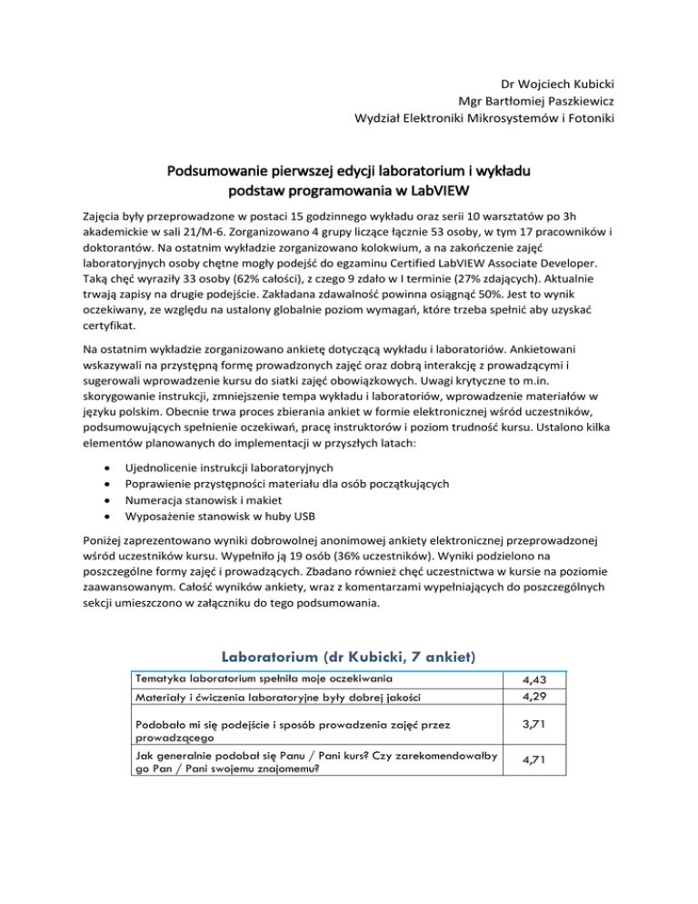 Dr Wojciech Kubicki Mgr Bartłomiej Paszkiewicz Wydział Elektroniki Mikrosystemów i Fotoniki Podsumowanie pierwszej edycji laboratorium i wykładu podstaw programowania w LabVIEW Zajęcia były przeprowadzone w postaci 15 godzinnego wykładu oraz serii 10 warsztatów po 3h akademickie w sali 21/M-6. Zorganizowano 4 grupy liczące łącznie 53 osoby, w tym 17 pracowników i doktorantów. Na ostatnim wykładzie zorganizowano kolokwium, a na zakończenie zajęć laboratoryjnych osoby chętne mogły podejść do egzaminu Certified LabVIEW Associate Developer. Taką chęć wyraziły 33 osoby (62% całości), z czego 9 zdało w I terminie (27% zdających). Aktualnie trwają zapisy na drugie podejście. Zakładana zdawalność powinna osiągnąć 50%. Jest to wynik oczekiwany, ze względu na ustalony globalnie poziom wymagań, które trzeba spełnić aby uzyskać certyfikat. Na ostatnim wykładzie zorganizowano ankietę dotyczącą wykładu i laboratoriów. Ankietowani wskazywali na przystępną formę prowadzonych zajęć oraz dobrą interakcję z prowadzącymi i sugerowali wprowadzenie kursu do siatki zajęć obowiązkowych. Uwagi krytyczne to m.in. skorygowanie instrukcji, zmniejszenie tempa wykładu i laboratoriów, wprowadzenie materiałów w języku polskim. Obecnie trwa proces zbierania ankiet w formie elektronicznej wśród uczestników, podsumowujących spełnienie oczekiwań, pracę instruktorów i poziom trudność kursu. Ustalono kilka elementów planowanych do implementacji w przyszłych latach: Ujednolicenie instrukcji laboratoryjnych Poprawienie przystępności materiału dla osób początkujących Numeracja stanowisk i makiet Wyposażenie stanowisk w huby USB Poniżej zaprezentowano wyniki dobrowolnej anonimowej ankiety elektronicznej przeprowadzonej wśród uczestników kursu. Wypełniło ją 19 osób (36% uczestników). Wyniki podzielono na poszczególne formy zajęć i prowadzących. Zbadano również chęć uczestnictwa w kursie na poziomie zaawansowanym. Całość wyników ankiety, wraz z komentarzami wypełniających do poszczególnych sekcji umieszczono w załączniku do tego podsumowania. Laboratorium (dr Kubicki, 7 ankiet) Tematyka laboratorium spełniła moje oczekiwania Materiały i ćwiczenia laboratoryjne były dobrej jakości 4,43 4,29 Podobało mi się podejście i sposób prowadzenia zajęć przez prowadzącego 3,71 Jak generalnie podobał się Panu / Pani kurs? Czy zarekomendowałby go Pan / Pani swojemu znajomemu? 4,71 Laboratorium ( mgr Paszkiewicz, 12 ankiet) Tematyka laboratorium spełniła moje oczekiwania (1-5) 5 Materiały i ćwiczenia laboratoryjne były dobrej jakości Podobało mi się podejście i sposób prowadzenia zajęć przez prowadzącego Jak generalnie podobał się Panu / Pani kurs? Czy zarekomendowałby go Pan / Pani swojemu znajomemu? 4,92 4,92 5 Wykład (dr Kubicki, 8 ankiet osób z przynajmniej trzema obecnościami, bez 11 ankiet osób z co najwyżej dwoma obecnościami) Treści przedstawiane na wykładzie spełniły moje oczekiwania Odpowiadał mi sposób prowadzenia wykładu 4,63 4,5 Planowana jest część zaawansowana kursu. Czy była by Pani/Pan zainteresowana udziałem w niej? (19 ankiet) Tak Tak, ale nie będę w stanie Może Nie 74% 5% 21% 0% Wyniki ankiet pokazują, że kurs pomimo swojej dobrowolności cieszył się dużym zainteresowaniem. Szczególnie cieszą odpowiedzi wskazujące, że 79% osób chce wziąć udział w kursie zaawansowanym oraz ,że średnia z pytania badającego skłonność uczestników do polecania kursu innym wynosi 4,89/5.