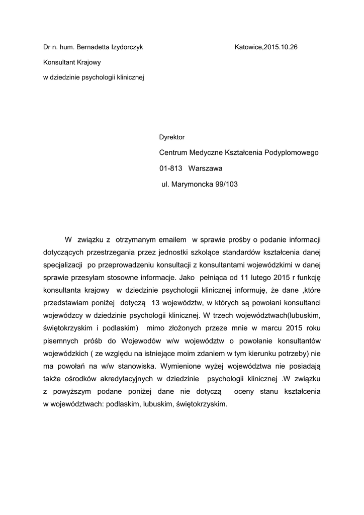 Dr n. hum. Bernadetta Izydorczyk Katowice,2015.10.26 Konsultant Krajowy w dziedzinie psychologii klinicznej Dyrektor Centrum Medyczne Kształcenia Podyplomowego 01-813 Warszawa ul. Marymoncka 99/103 W związku z otrzymanym emailem w sprawie prośby o podanie informacji dotyczących przestrzegania przez jednostki szkolące standardów kształcenia danej specjalizacji po przeprowadzeniu konsultacji z konsultantami wojewódzkimi w danej sprawie przesyłam stosowne informacje. Jako pełniąca od 11 lutego 2015 r funkcję konsultanta krajowy w dziedzinie psychologii klinicznej informuję, że dane ,które przedstawiam poniżej dotyczą 13 województw, w których są powołani konsultanci wojewódzcy w dziedzinie psychologii klinicznej. W trzech województwach(lubuskim, świętokrzyskim i podlaskim) mimo złożonych przeze mnie w marcu 2015 roku pisemnych próśb do Wojewodów w/w województw o powołanie konsultantów wojewódzkich ( ze względu na istniejące moim zdaniem w tym kierunku potrzeby) nie ma powołań na w/w stanowiska. Wymienione wyżej województwa nie posiadają także ośrodków akredytacyjnych w dziedzinie psychologii klinicznej .W związku z powyższym podane poniżej dane nie dotyczą w województwach: podlaskim, lubuskim, świętokrzyskim. oceny stanu kształcenia I. Zestawienie danych na temat ośrodków akredytowanych oraz przebiegu aktualnego stanu kształcenia w dziedzinie psychologii klinicznej w poszczególnych województwach(dane uzyskane od konsultantów wojewódzkich na spotkaniu z konsultantem krajowym w dniu 23.X.2015.w Warszawie(na spotkaniu obecni wszyscy konsultanci wojewódzcy – lista obecności w załączeniu). Województwo Liczba akredytowanych 1.Mazowieckie 5 ośr. Ilość osób w toku Czas zakończenia Planowany czas nowej kształcenia kształcenia edycji specjalizacyjnego specjalizacyjnego specjalizacyjnego kształcenia 179 2019 Wiosna 2016 2.Wielkopolskie 4 75 2016 Jesień 2016 3.Małopolskie 3 84 2019 Jesień 2015 4.Kujawsko- 1 24 2016 - 2017 Wiosna 2016 5.Pomorskie 1 60 2016 Jesień 2016 6.zachodnio- 2 4 2016 Jesień 2015 Warmińsko-Mazurskie 1 12 2018 Wiosna 2018 Łódzkie 2 62 2016 Pomorskie Pomorskie 2016 (brak doprecyzowania daty naboru) Śląskie 1 61 2016 Jesień 2016 Dolnośląskie 1 62 2017 Jesień 2017 Opolskie 0 0 0 0 Lubelskie 2 55 2017 Jesień 2017 Podkarpackie 1 20 2019 2019 Lubuskie 0 0 0 0 Podlaskie 0 0 0 0 Świętokrzyskie 0 0 0 0 Razem 24 ośrodki 698 osób 2016- 2019 Wiosna 2016 - 2019 II. Charakterystyka trudności w zakresie kształcenia specjalizacyjnego w dziedzinie psychologii klinicznej i propozycje zmian w kierunku poprawy organizacji i jakości kształcenia 1.Charakterystyka danych zawartych w powyższej tabeli wskazuje nierównomierność w kształceniu specjalizacyjnym w dziedzinie psychologii klinicznej na terenie Polski. Globalna ilość ośrodków akredytacyjnych nie odpowiada ich równomiernemu rozmieszczeniu w całej Polsce. Jak już wspomniano brak jest dostępności do ośrodków kształcenia specjalizacyjnego w woj. opolskim - tutaj wg. opinii konsultanta wojewódzkiego kształcenie i dolnośląskim. W planach na przyszłość odbywa się -kiedy zostanie woj. śląskim wykształcona i zgromadzona specjalistyczna kadra dydaktyczna rozważa się otwarcie ośrodka akredytowanego w woj. opolskim. W pozostałych trzech woj.: świętokrzyskim, lubuskim i podlaskim brak ośrodków akredytacyjnych, brak tez konsultantów wojewódzkich utrudnia doprecyzowanie danych, o które Państwo prosicie. Natomiast wg. opinii konsultantów wojewódzkich woj. kujawsko-pomorskiego i wielkopolskiego w ośrodkach akredytacyjnych na terenie województw ,o których mowa wyżej kształcą się osoby z woj. lubuskiego. Z opinii konsultantów wymienionych wyżej województw wynika, że potrzeby psychologów związane z kształceniem specjalistycznym w dziedzinie psychologii klinicznej zamieszkujących woj. lubuskie jest większe niż umożliwia to nabór osób w ośrodkach akredytowanych woj. kujawsko-pomorskiego i wielkopolskiego. Ponadto z opinii np. konsultantów woj. lubelskiego, warmińsko-mazurskiego, małopolskiego, dolnośląskiego wynika, że w ośrodkach akredytowanych mieszczących się na terenie w/w województw kształcą się osoby, które zamieszkują woj. podlaskie i świętokrzyskie. W tym przypadku również konsultanci woj. wskazują się, że nabory do ośrodków akredytowanych mieszczących się na terenie województw, które oni reprezentują nie mogą w pełni zapewnić kształcenia dla mgr psychologii z woj. świętokrzyskiego, czy podlaskiego. Na uwagę zasługuje także fakt, że woj. podlaskie posiadało w przeszłości konsultanta wojewódzkiego w dziedzinie psychologii klinicznej, który miał możliwość wpływu na organizowanie szkolenia specjalizacyjnego w dziedzinie psychologii klinicznej na terenie woj. podlaskiego. Aktualnie pismo konsultanta krajowego z marca 2015 r. do Wojewody Podlaskiego z prośbą o rozważenie powołania konsultanta woj. zostało bez odpowiedzi. Propozycja zmiany w kierunku poprawy organizacji i jakości kształcenia w dziedzinie psychologii klinicznej: - Uwzględnić większą możliwość wpływu konsultanta wojewódzkiego na politykę kadrową w zakresie kształcenia specjalistycznej kadry psychologii klinicznej oraz zwiększenia bazy kształcenia na terenie woj., które nie posiadają dotychczas ośrodków akredytowanych oraz nie posiadają konsultantów wojewódzkich, którzy mogliby nadzorować tworzenie takich ośrodków oraz tym samym jakość kształcenia kadry psychologicznej, świadczącej usługi zdrowotne na rzecz pacjentów służby zdrowia.Tutaj wskazuję na woj. podlaskie, lubuskie, świętokrzyskie. Mgr psychologii z w/w województw mogliby uzyskać szansę kształcenia się na własnym terenie, co mogłoby pomniejszyć dla nich koszty kształcenia specjalizacyjnego (jak dotąd odpłatnego dla uczestników w/w szkolenia). O ile kształcenie specjalizacyjne psycholog