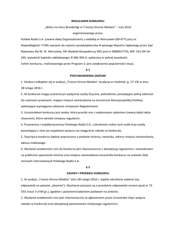 REGULAMIN KONKURSU „Bilety na mecz Bundesligi w Trzeciej Stronie Medalu” – luty 2016 organizowanego przez: Polskie Radio S.A. (zwane dalej Organizatorem) z siedzibą w Warszawie (00-977) przy al. Niepodległości 77/85 wpisane do rejestru przedsiębiorców Krajowego Rejestru Sądowego przez Sąd Rejonowy dla M. St. Warszawy, XIII Wydział Gospodarczy KRS pod nr 0000017753, NIP: 521-04-14265, wysokość kapitału zakładowego: 8 366 300 zł, wpłacony w pełnej wysokości. Celem konkursu, realizowanego przez Program 3, jest zwiększenie popularności stacji. §1 POSTANOWIENIA OGÓLNE 1. Konkurs odbędzie się w audycji „Trzecia Strona Medalu” (audycja w niedziele, g. 17-19) w dniu 28 lutego 2016 r. 2. W konkursie mogą uczestniczyć wyłącznie osoby fizyczne, pełnoletnie, posiadające pełną zdolność do czynności prawnych, mające miejsce zamieszkania na terytorium Rzeczpospolitej Polskiej, spełniające wymagania nałożone niniejszym Regulaminem. 3. Uczestnikiem konkursu jest osoba, która prześle sms z wykonanym zadaniem (zwany dalej także Utworem), które określa niniejszy regulamin. 4. Pracownicy i współpracownicy Polskiego Radia S.A., członkowie rodzin tych osób oraz osoby pozostające z nimi we wspólnym pożyciu nie mogą brać udziału w konkursie. 5. Zwycięzca konkursu będzie poproszony o podanie imienia, nazwiska, adresu miejsca zamieszkania, adresu mailowego. 6. Wysłanie wiadomości sms do konkursu jest równoznaczne z akceptacją regulaminu i zezwoleniem na publiczne ujawnienie imienia oraz miejsca zamieszkania Uczestnika konkursu na antenie i/lub stronach internetowych Polskiego Radia S.A. §2 ZASADY I PRZEBIEG KONKURSU 1. W audycji „Trzecia Strona Medalu” dniu 28 lutego 2016 r. będzie określone zadanie (np. odpowiedź na pytanie „otwarte”). Słuchacze proszeni są o przesłanie odpowiedzi smsem (pod nr 73 533, koszt 3 zł 69 gr.), zgodnie z pytaniem/zadaniem podanym na antenie. 2. Wysłanie wiadomości sms jest równoznaczne ze zgłoszeniem przez Uczestnika chęci wzięcia udziału w konkursie oraz akceptacją postanowień niniejszego regulaminu. 3. W konkursie nie są brane pod uwagę wiadomości sms wysyłane przez Internet. 4. Każdy Uczestnik konkursu może wziąć udział w konkursie dowolną liczbę razy, z zastrzeżeniem § 2 ust. 5. 5. W dniu 28 lutego 2016r. zostanie wyłoniony jeden Zwycięzca. 6. Wiadomości SMS przyjmowane są w audycji danego dnia od momentu ogłoszenia konkursu na antenie Trójki do momentu ogłoszenia przez prowadzącego zakończenia przyjmowania smsów. 7. Nadesłany Utwór: a) musi być wynikiem osobistej twórczości Uczestnika; b) nie może zawierać treści obraźliwych lub sprzecznych z prawem; c) nie może naruszać praw osób trzecich, w tym w szczególności dóbr osobistych, praw autorskich lub praw własności przemysłowej. 8. Zwycięzcą konkursu jest osoba, której tekst (wykonanie zadania) zostały najwyżej ocenione przez Jury konkursu, powołane przez Organizatora. W konkursie Dokonując oceny Jury weźmie pod uwagę oryginalność, pomysłowość, wartość artystyczną tekstu. 9. Imię Zwycięzcy (wraz z miejscowością) zostanie ogłoszone w audycji, w której rozgrywany był konkurs. §3 NAGRODY 1. Nagrodą w konkursie jest zestaw biletów w którego skład wchodzą trzy bilety na mecz Borussia Dortmund – Bayern Monachium w Dortmundzie, który odbędzie się 5 marca 2016r. Wartość nagrody nie przekracza 760 zł brutto. 2. Nagroda nie podlega wymianie na ekwiwalent pieniężny lub rzeczowy. 3. Zwycięzca udostępnią Organizatorowi swoje dokładne dane, które posłużą do przekazania nagrody w terminie, umożliwiającym skorzystanie z biletów. Przekazanie nagrody może nastąpić najpóźniej w dniu poprzedzającym rozegranie meczu, którego bilety będące wygraną w konkursie dotyczą. 4. Nagrody nie są objęte podatkiem od wygranej. §4 DANE OSOBOWE 1. Administratorem danych osobowych przetwarzanych w związku z realizacją konkursu jest Organizator. 2. Dane osobowe przekazane Organizatorowi przez Uczestników konkursu będą przetwarzane przez Organizatora wyłącznie w celu realizacji konkursu i doręczenia nagród. Podanie danych osobowych jest dobrowolne, jednak ich niepodanie uniemożliwia otrzymanie nagrody w konkursie. Każdy Uczestnik konkursu posiada prawo wglądu do swoich danych osobowych, do ich poprawiania oraz żądania ich usunięcia. Dane osobowe będą przetwarzane zgodnie z przepisami ustawy z dnia 29 sierpnia 1997 r. o ochronie danych osobowych (Dz.U. 2014. 1182 t.j. z późn. zm.) na co każdy Uczestnik konkursu wyraża zgodę. §5 PRAWA AUTORSKIE 1. Uczestnik konkursu oświadcza, że Utwór zgłoszony do konkursu został stworzony samodzielnie przez Uczestnika i jest wolny od praw i roszczeń osób trzecich, w tym dotyczących praw autorskich i pokrewnych oraz że ponosi wobec Organizatora odpowiedzialność z tego tytułu, zwalniając go z wszelkich roszczeń osób trzecich. 2. Z chwilą wysłania Utworu do konkursu Uczestnik udziela bez wynagrodzenia nieograniczonej czasowo i terytorialnie niewyłącznej licencji do korzystania z Utworu (licencja w zakresie autorskich praw majątkowych i praw pokrewnych) na następujących polach eksploatacji: a) utrwalanie i zwielokrotnianie (w tym wprowadzenie do pamięci komputera) Utworu dowolną techniką, b) publiczne udostępnianie Utworu w taki sposób, aby każdy mógł mieć do niego dostęp w miejscu i czasie przez siebie wybranym, c) nadawanie Utworu za pomocą fonii. 3. Uczestnik upoważnia Organizatora do udostępniania Utworu anonimowo oraz do decydowania o jego pierwszym publicznym udostępnieniu. §6 REKLAMACJE 1. Wszelkie reklamacje mogą być kierowane do powołanej przez Organizatora Komisji Reklamacyjnej, na adres: "Trójka" Polskie Radio S.A. 00-977 Warszawa ul. Myśliwiecka 3/5/7. 2. Złożone przez Uczestników reklamacje będą rozpatrywane w terminie 14 dni od dnia otrzymania przez Komisję Rekl